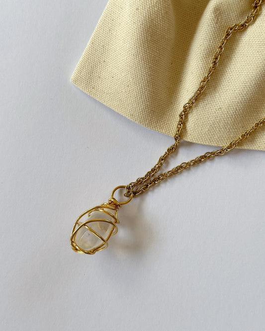 Vintage long gold-tone necklace with natural stone pendant by Avon