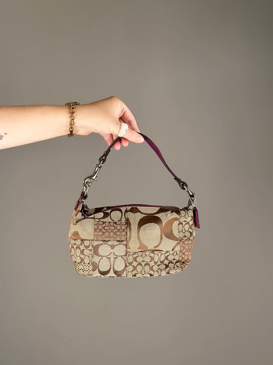 Chic vintage DKNY baguette bag with a rich brown monogram pattern