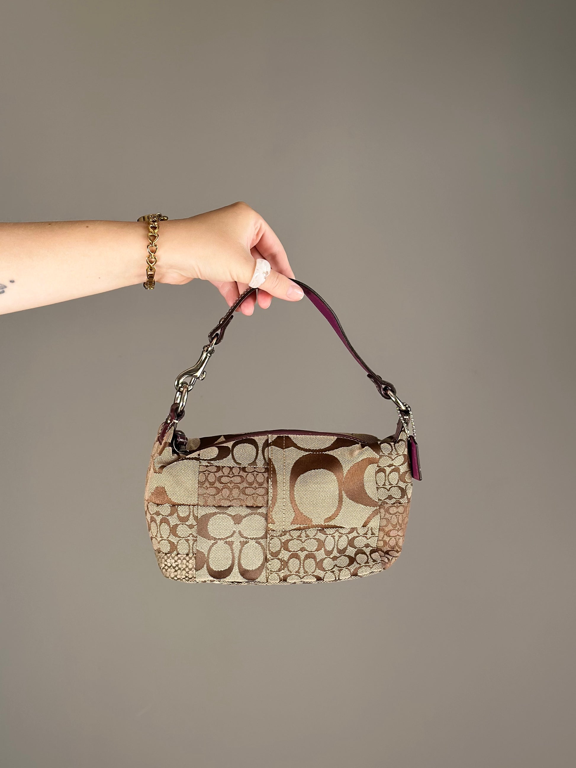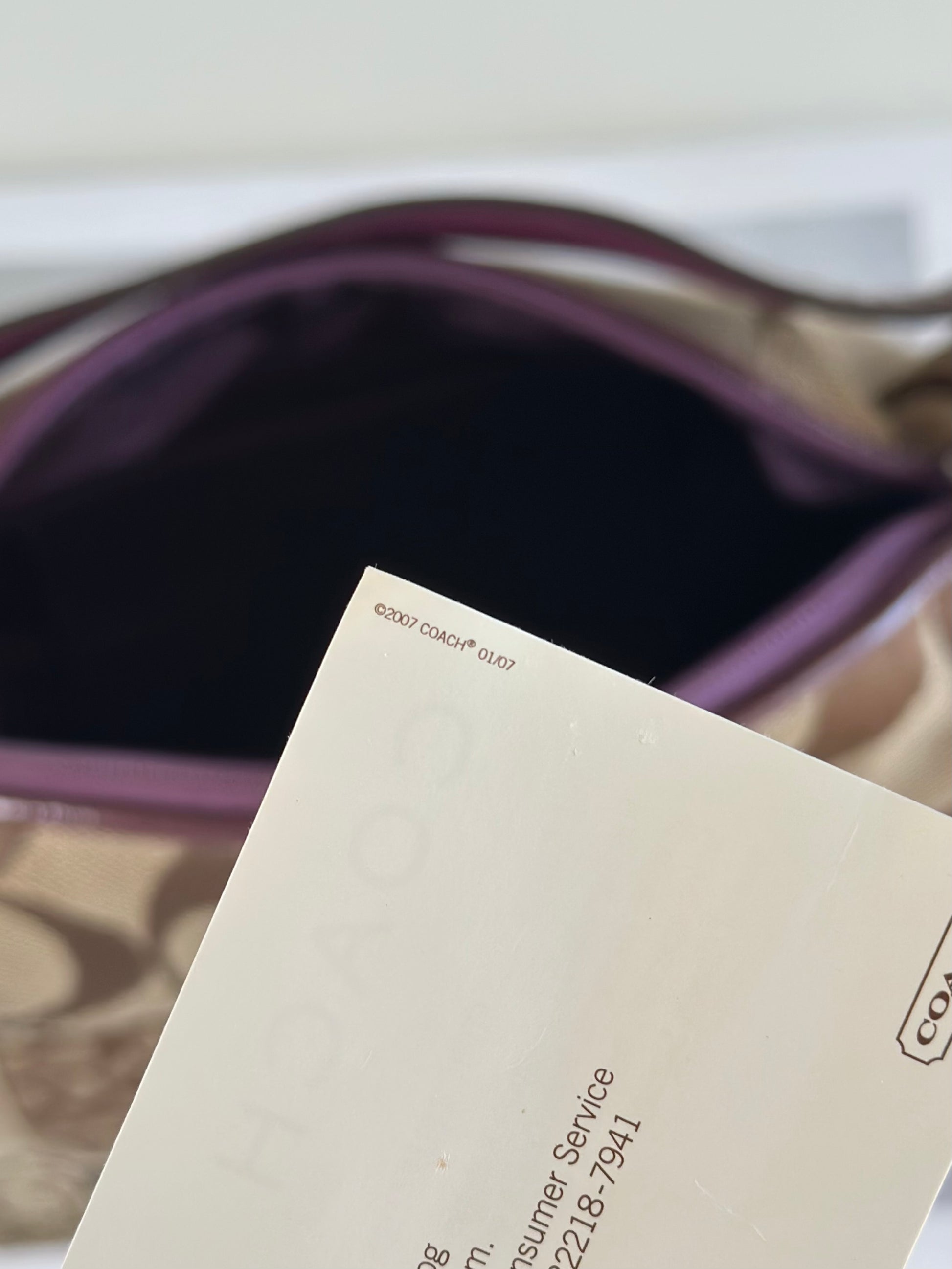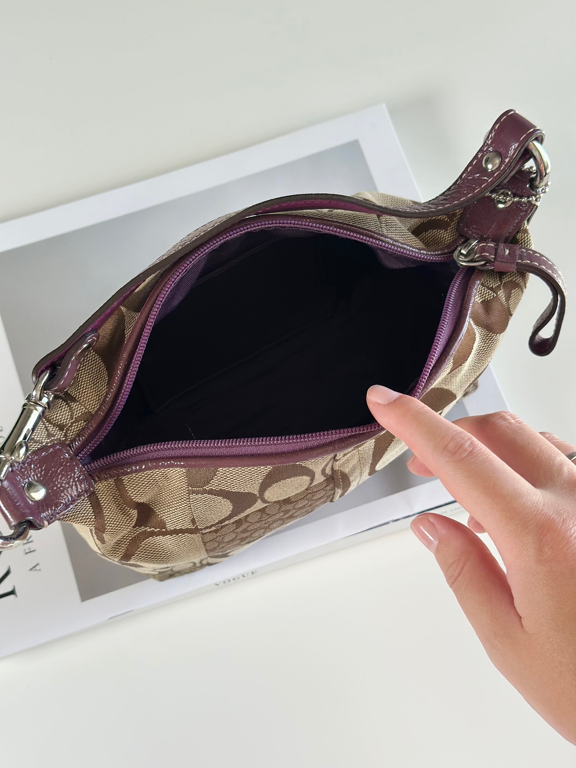 Charming authentic Coach hobo bag from the Signature Collection. It features a patchwork design combining the iconic Coach "C" monogram canvas with panels of contrasting texture, accented by rich plum patent leather trim and piping. The silver-tone hardware and a Coach hangtag add to its authentic appeal. The zip-top closure ensures secure storage, and the compact size makes it an ideal everyday bag for essentials.