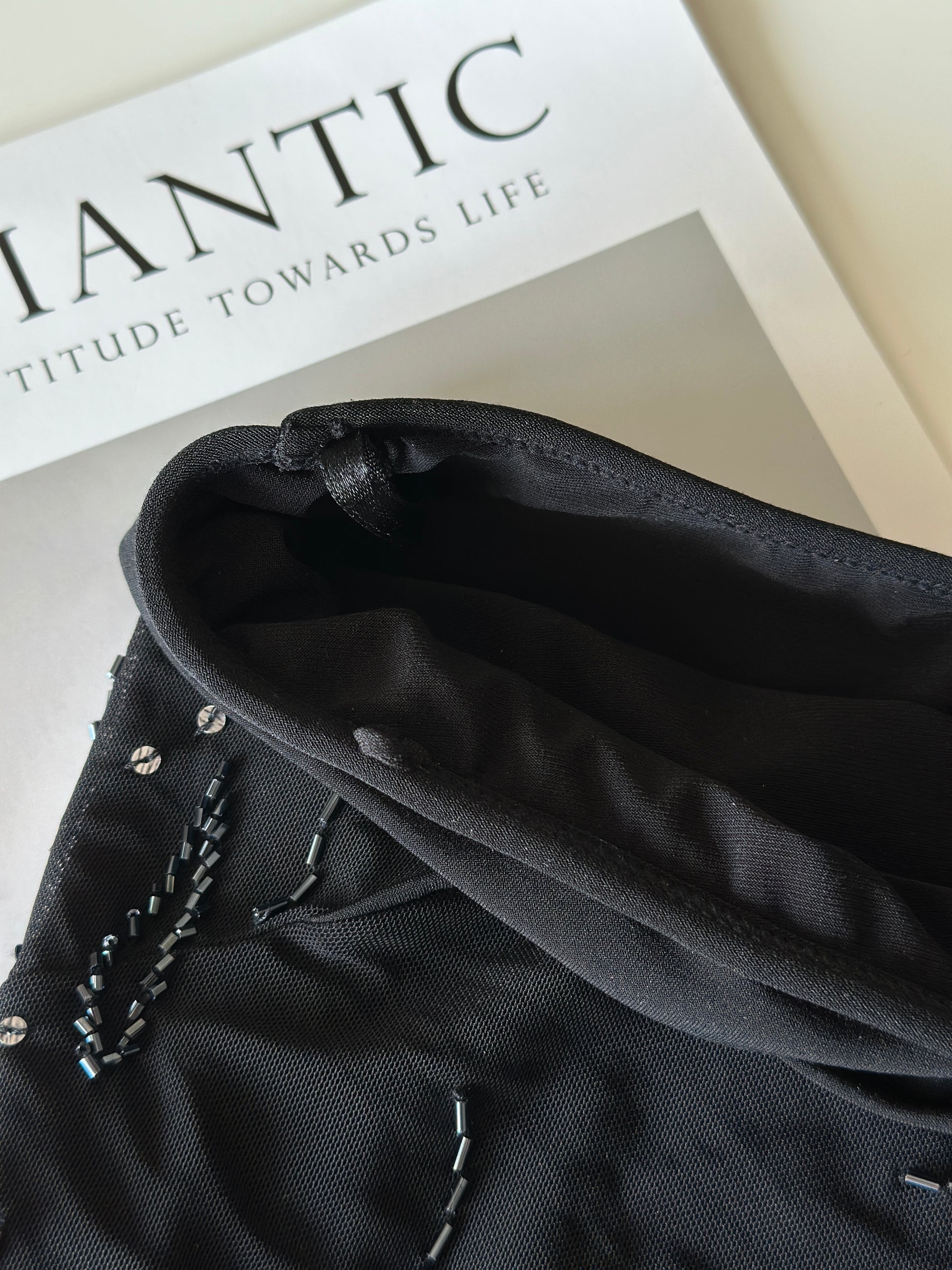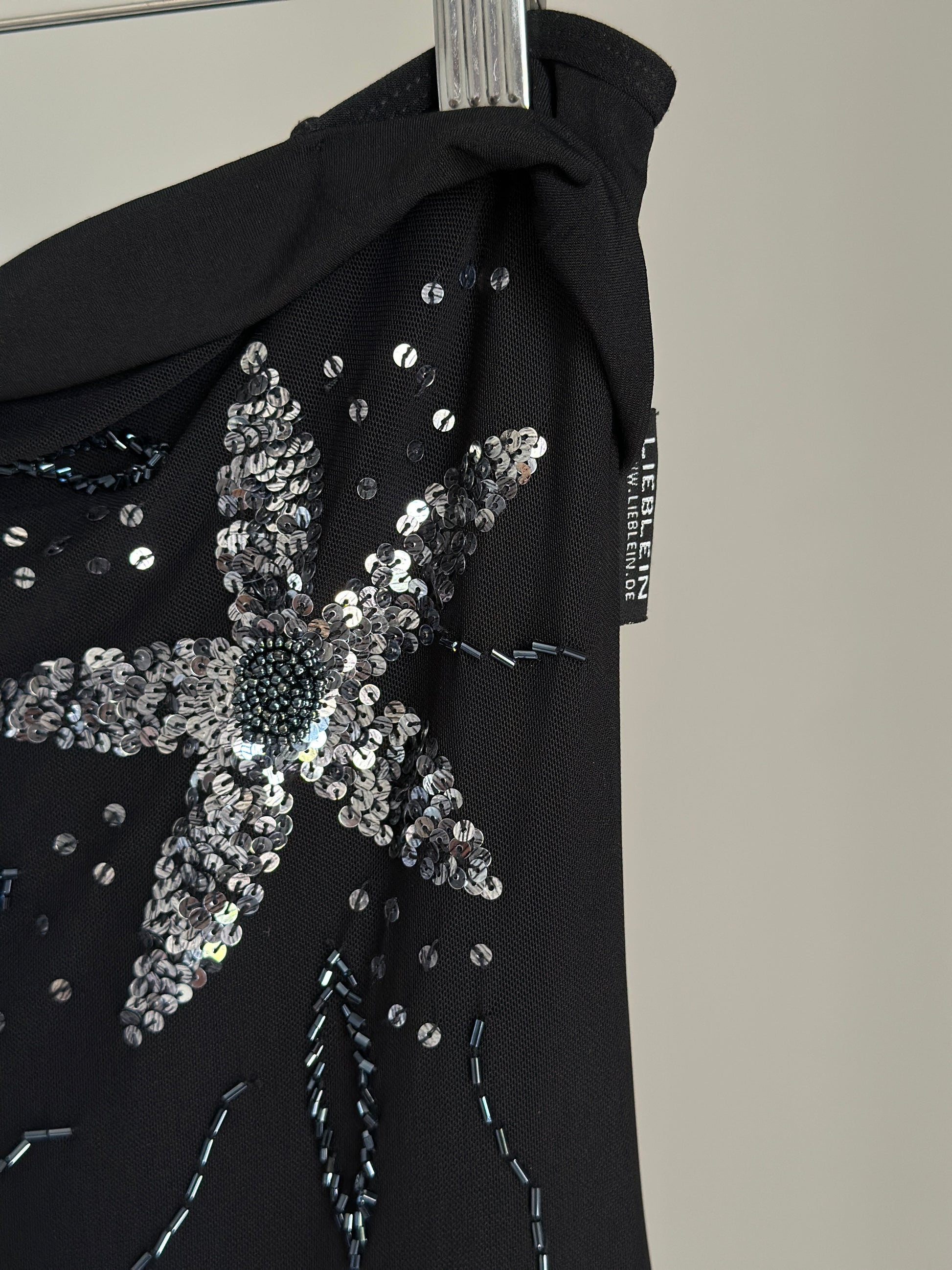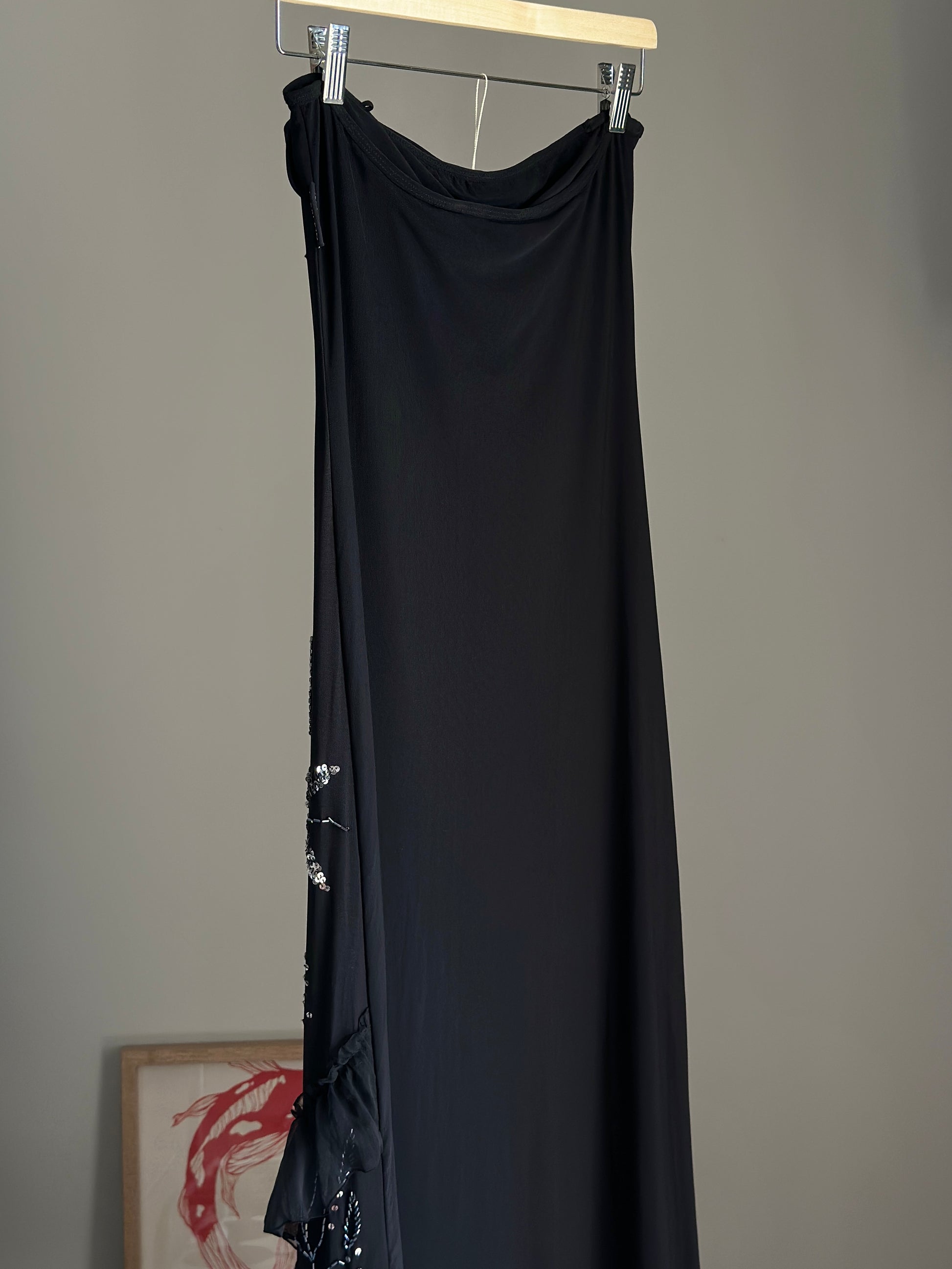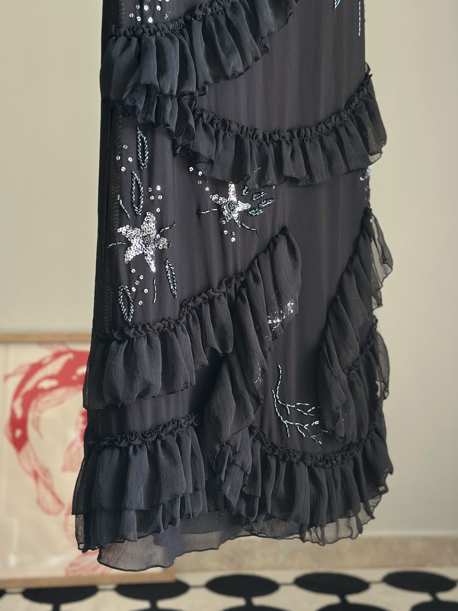 Breathtaking vintage evening gown designed to turn heads. The strapless bodice shimmers with silver sequin and bead embellishments in a floral pattern. Cascading sheer ruffled tiers flow gracefully down the skirt, adding movement and texture. The fitted silhouette creates an elegant and sophisticated look. Fully lined.