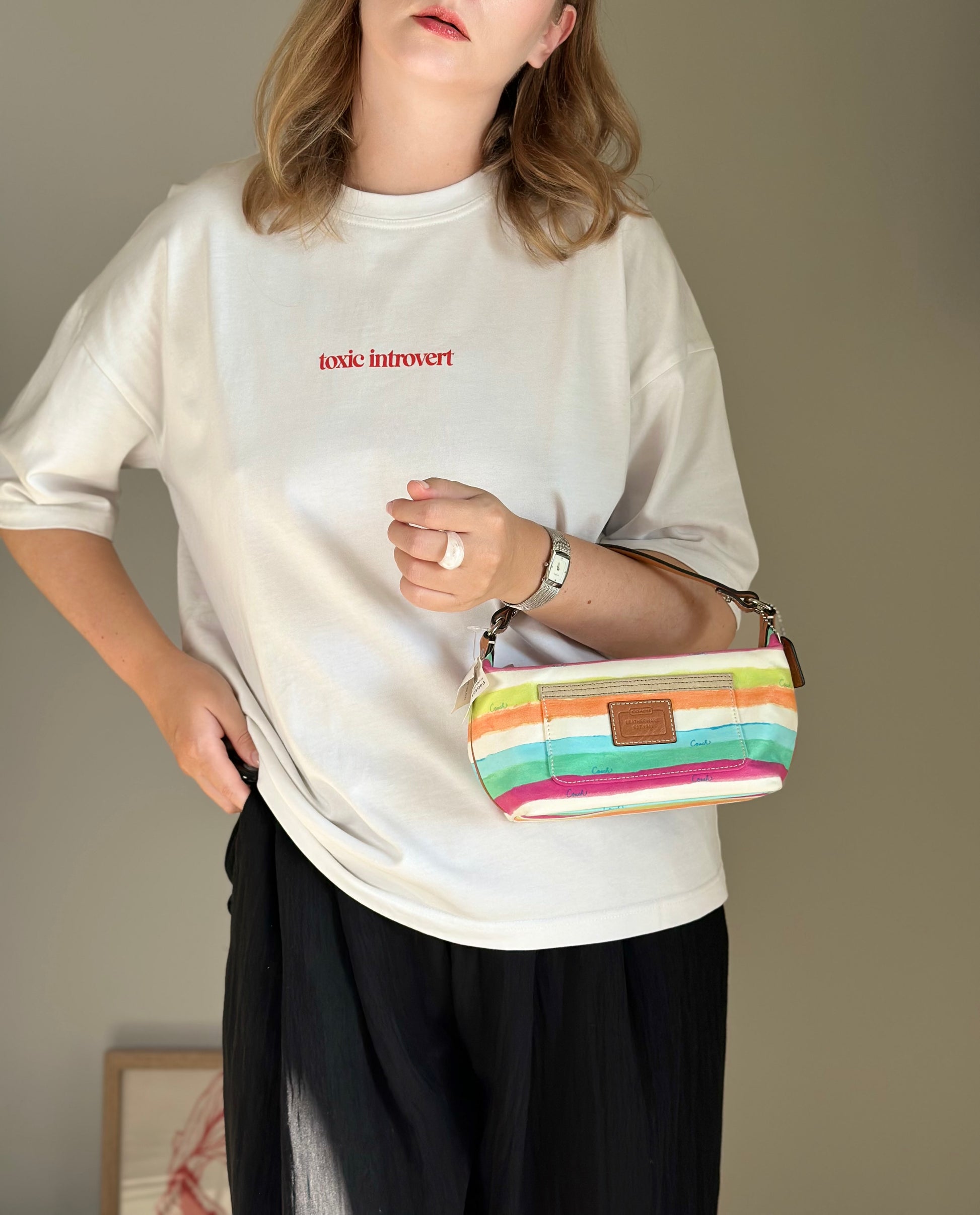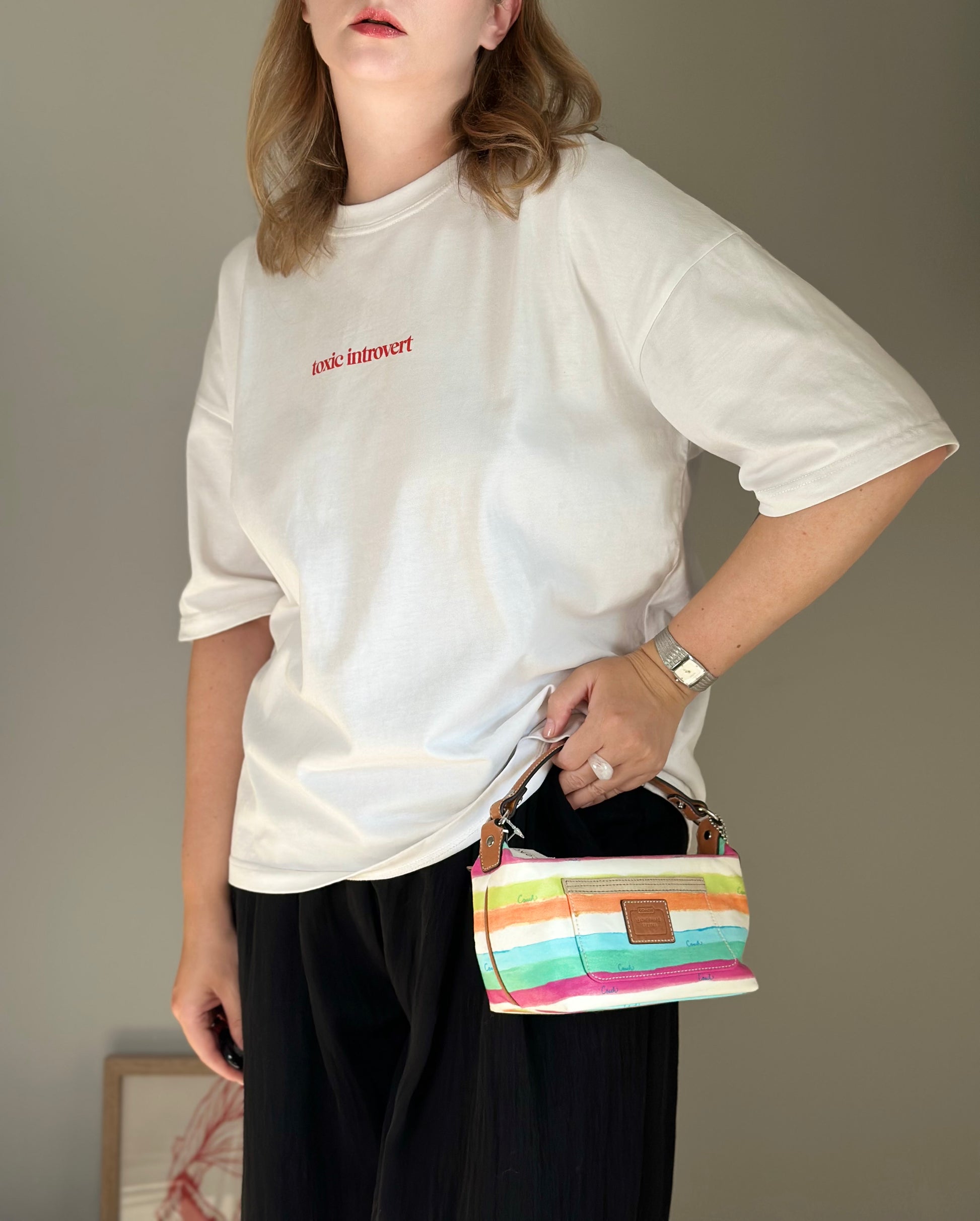 Charming vintage Coach mini bag showcases a vibrant watercolor stripe pattern and a playful vibe. The bag is accented with tan leather trim, including a leather Coach patch, and subtle Coach script logos across the fabric. A convenient zippered closure keeps your essentials secure. It's a delightful accessory for adding a touch of color and brand heritage to your everyday.
