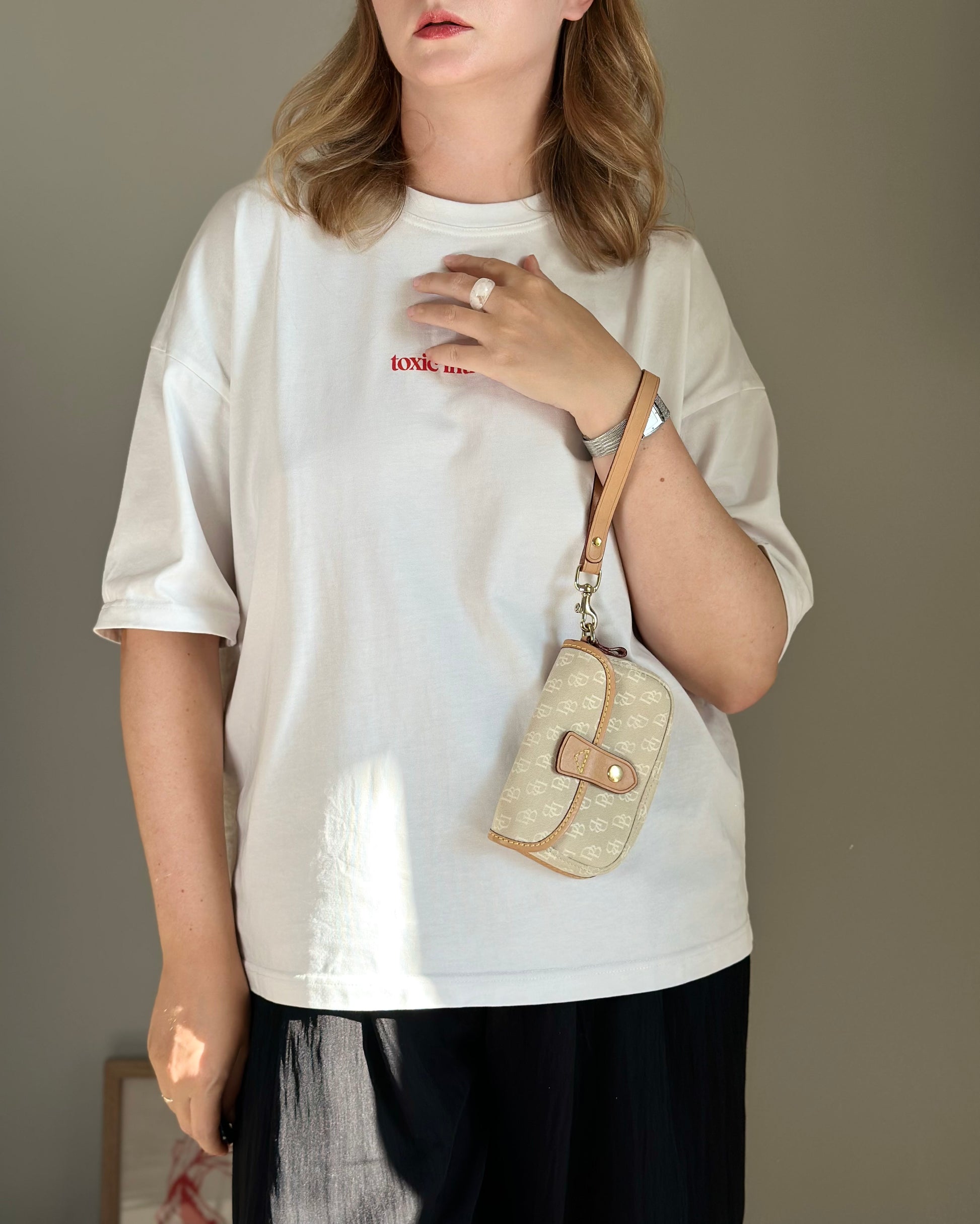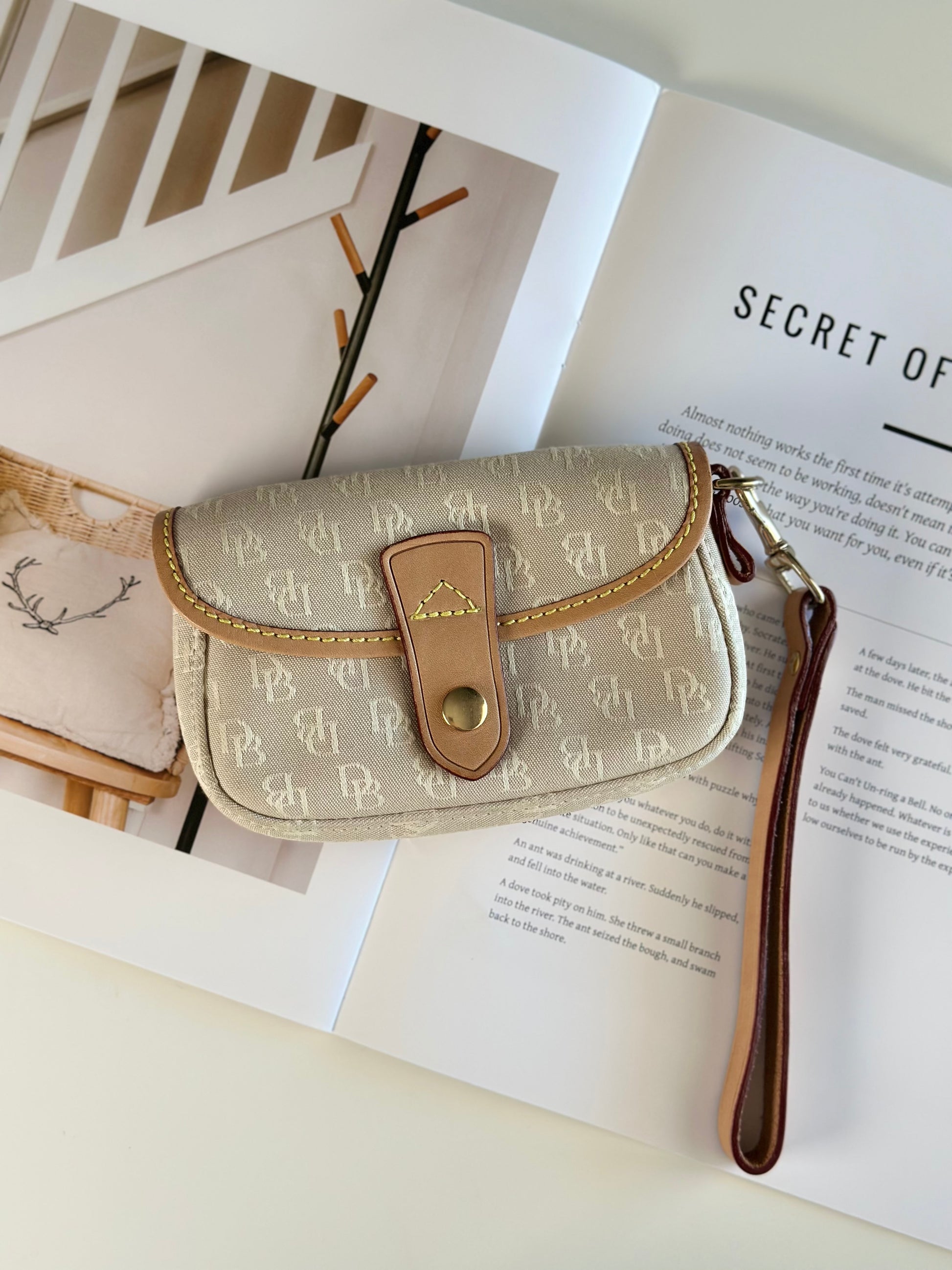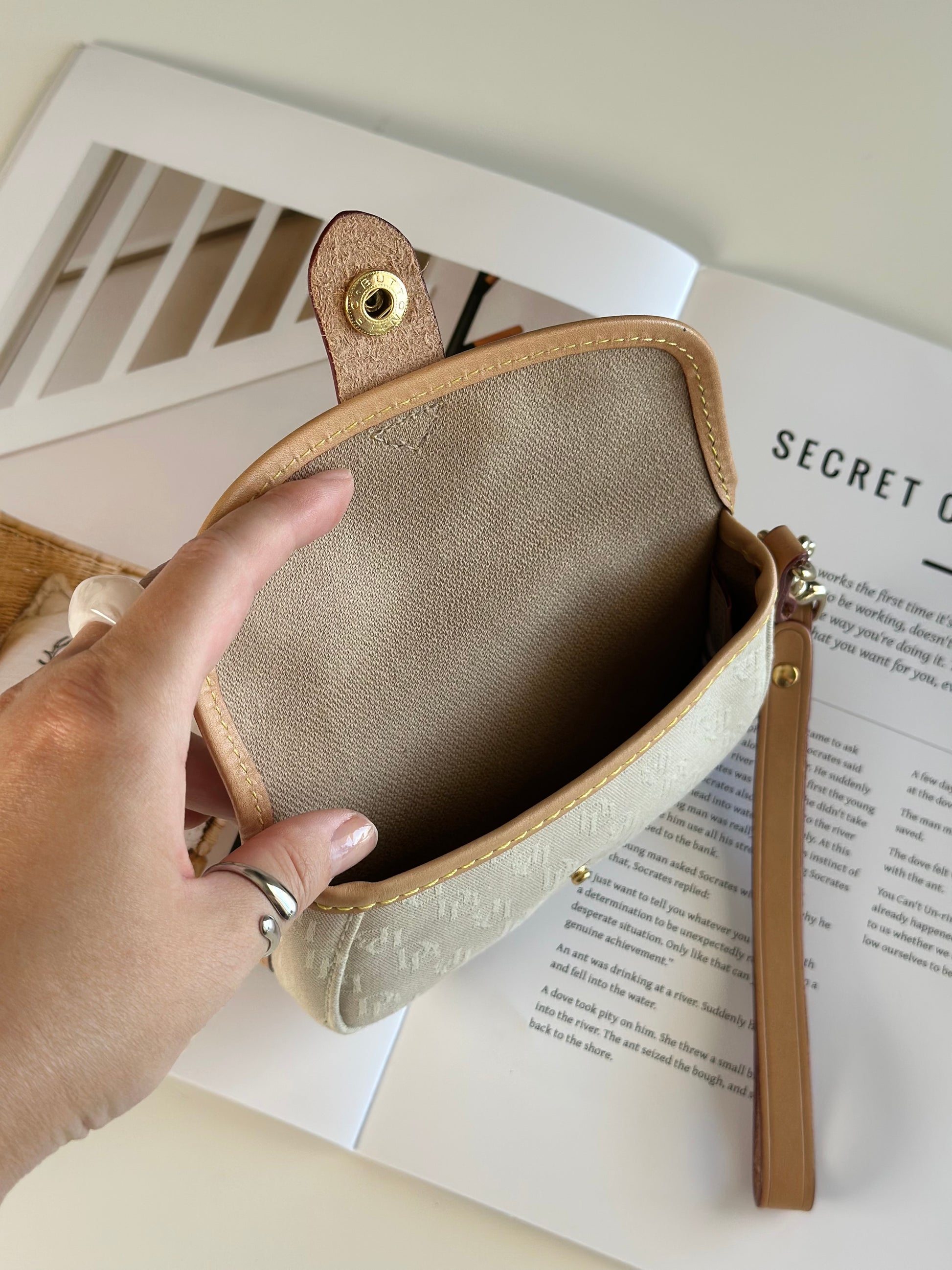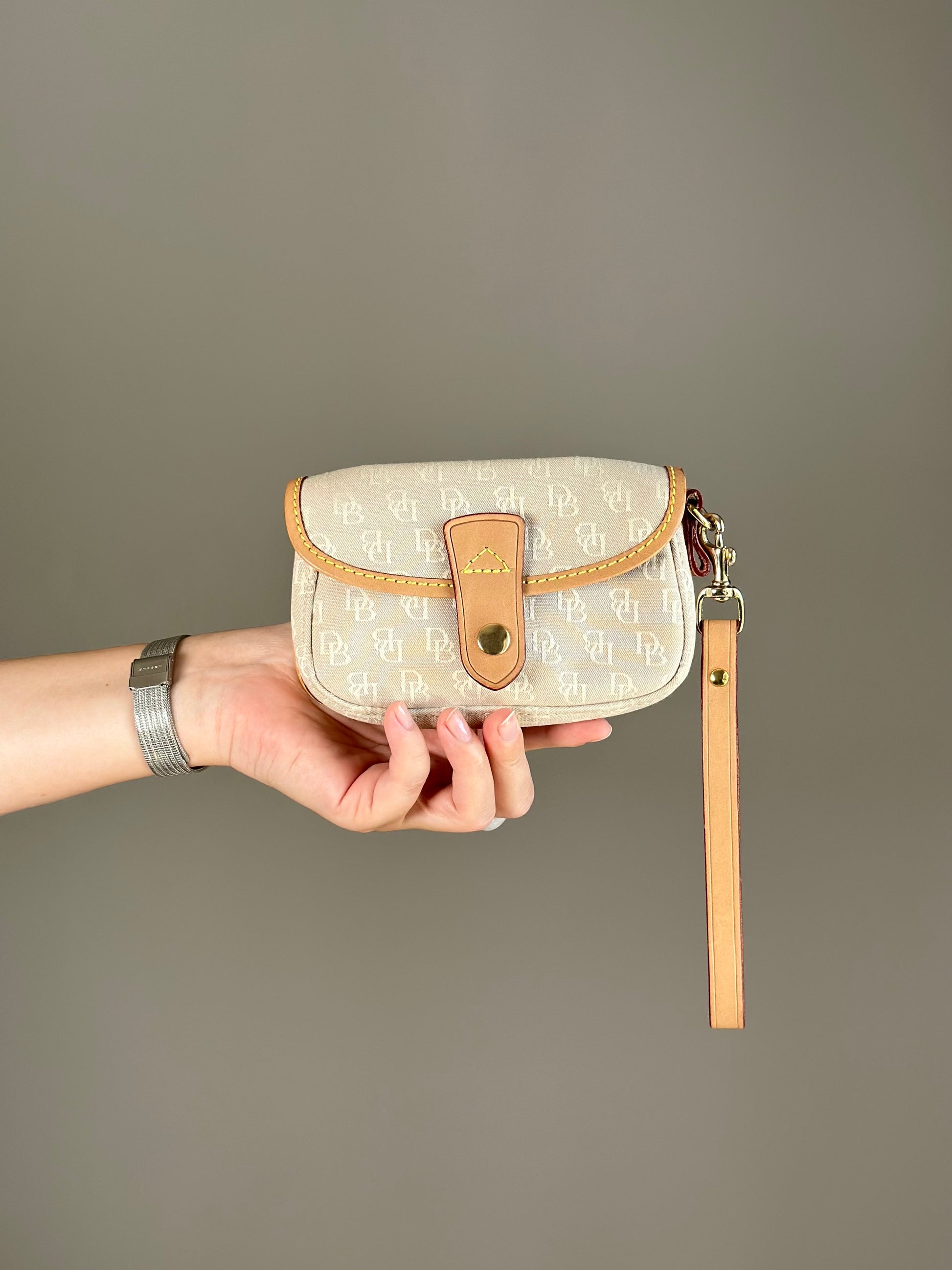 Charming vintage Dooney & Bourke pouch in classic beige canvas with an all-over “DB” monogram. Accented with light tan leather trim and decorative stitching, it features a flap closure with a gold-tone snap. Compact and versatile, perfect for organizing small essentials or carrying as a mini clutch/wallet.