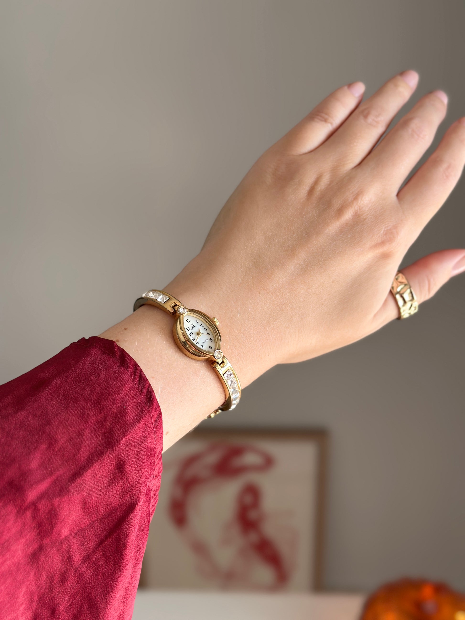 Charming vintage gold-tone watch with crystals. The oval mother-of-pearl dial is detailed with Arabic numerals. The bracelet features a beautiful gold-tone links and decorative stone-set segments, creating a truly jewel-like accessory for the wrist.