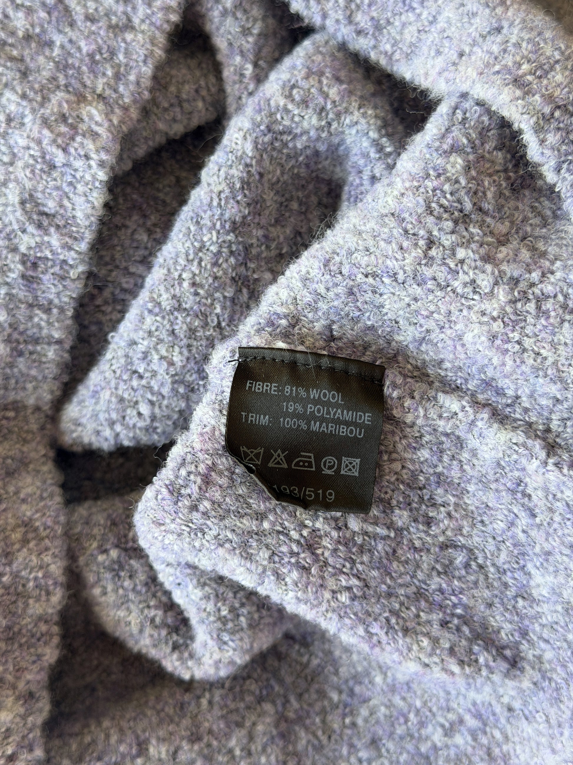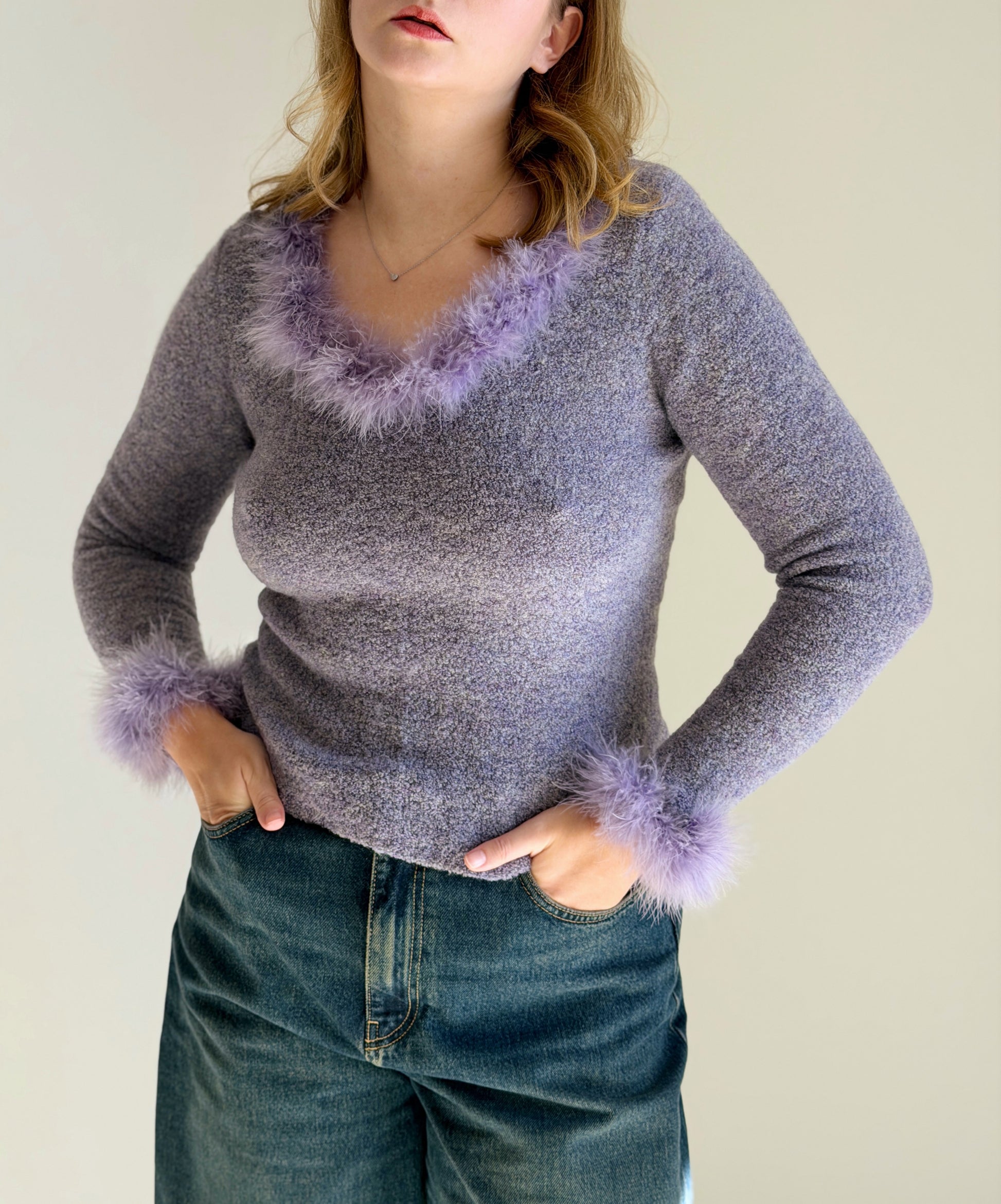 Vintage lilac sweater in a warm wool blend with delicate marabou feather trim at the neckline and cuffs. Feminine, cozy, and subtly dramatic.