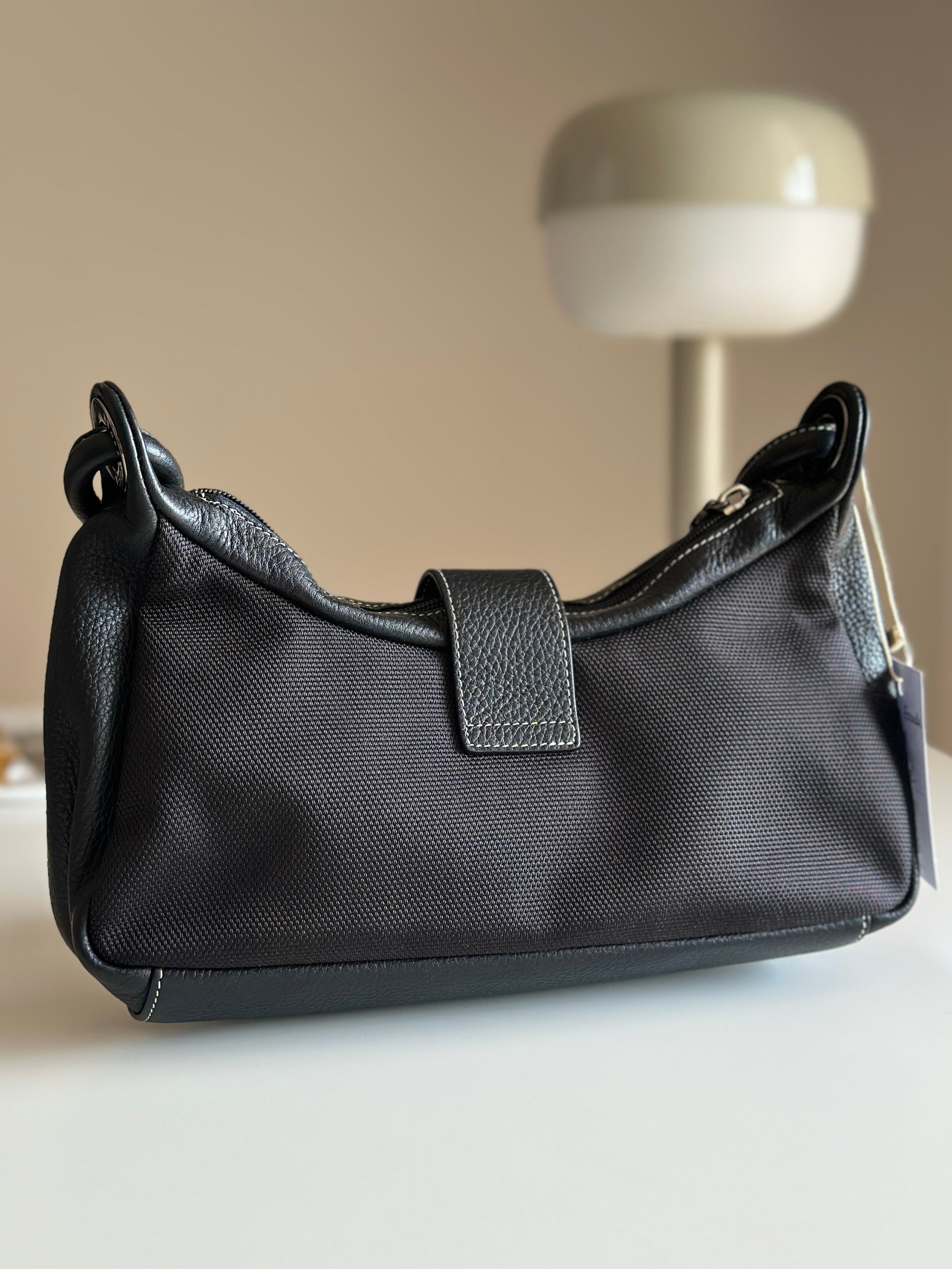 - Materials - textured fabric, genuine leather trim, dark silver-tone hardware.