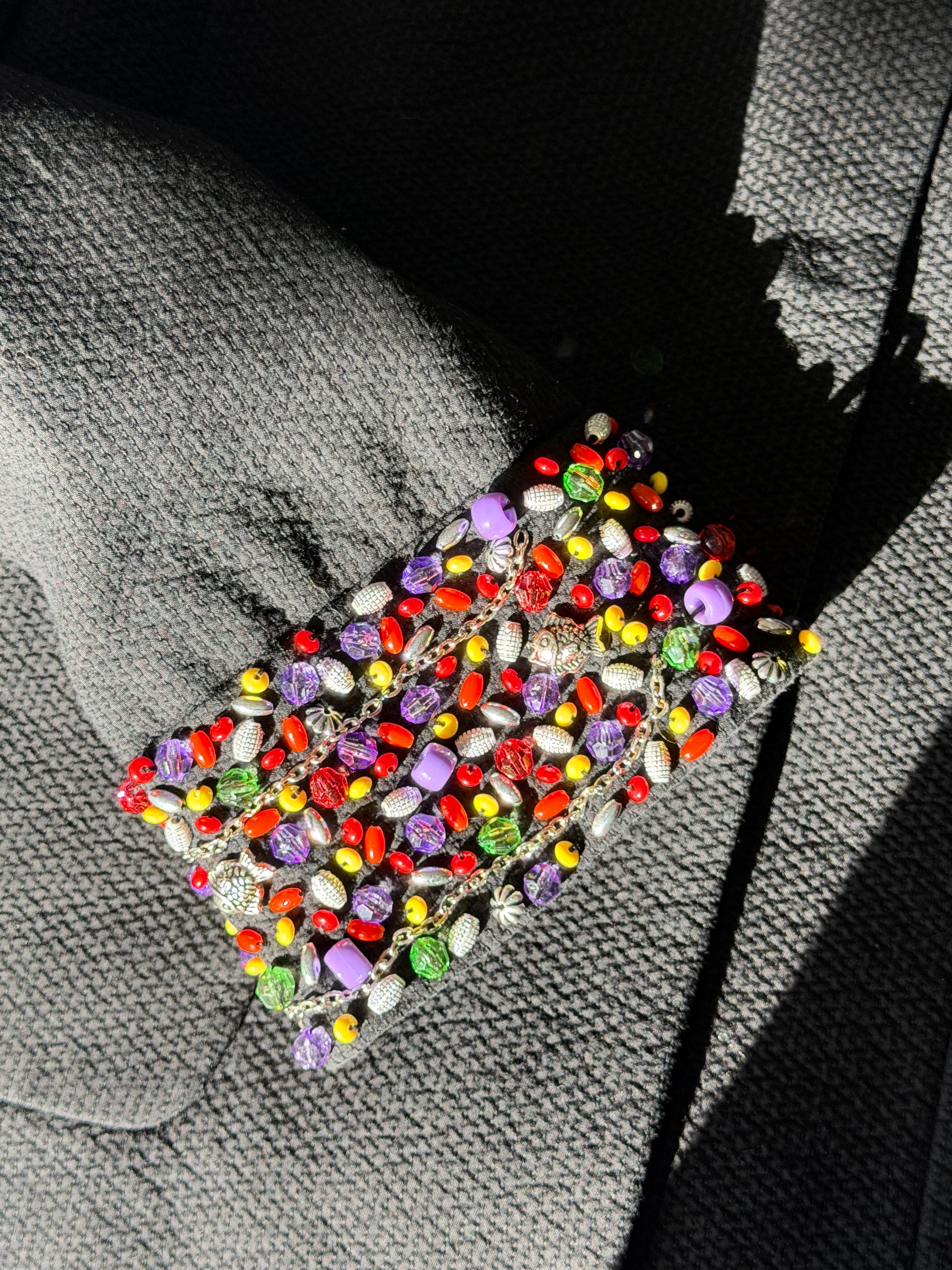 Chic vintage black blazer with a classic silhouette and artistic flair. Made from textured black fabric, it features a collarless design and button-up front. The standout detail is the heavily embellished cuffs, adorned with colorful beads, chains, and charms—including a fish charm—adding a bohemian, handcrafted touch to the piece.