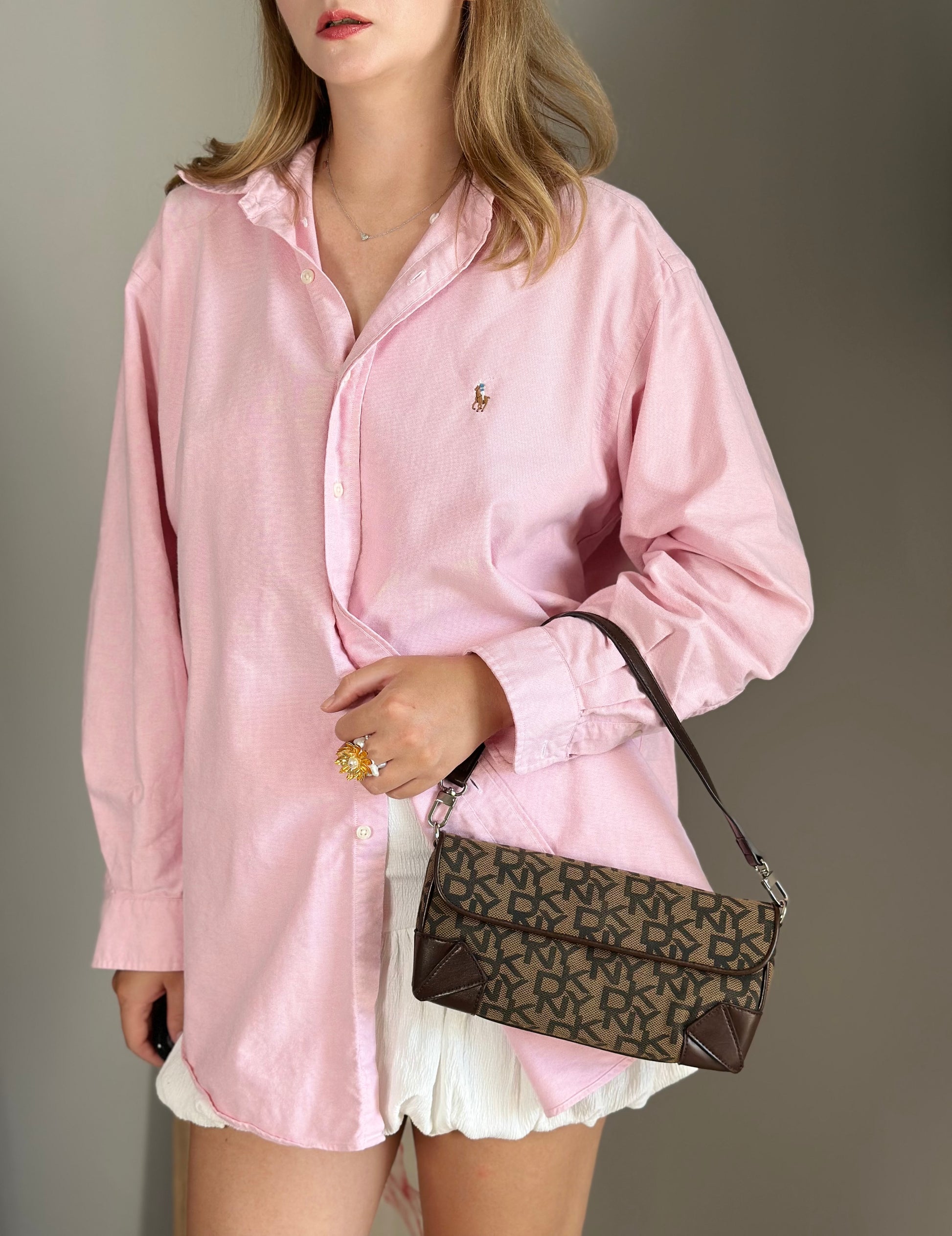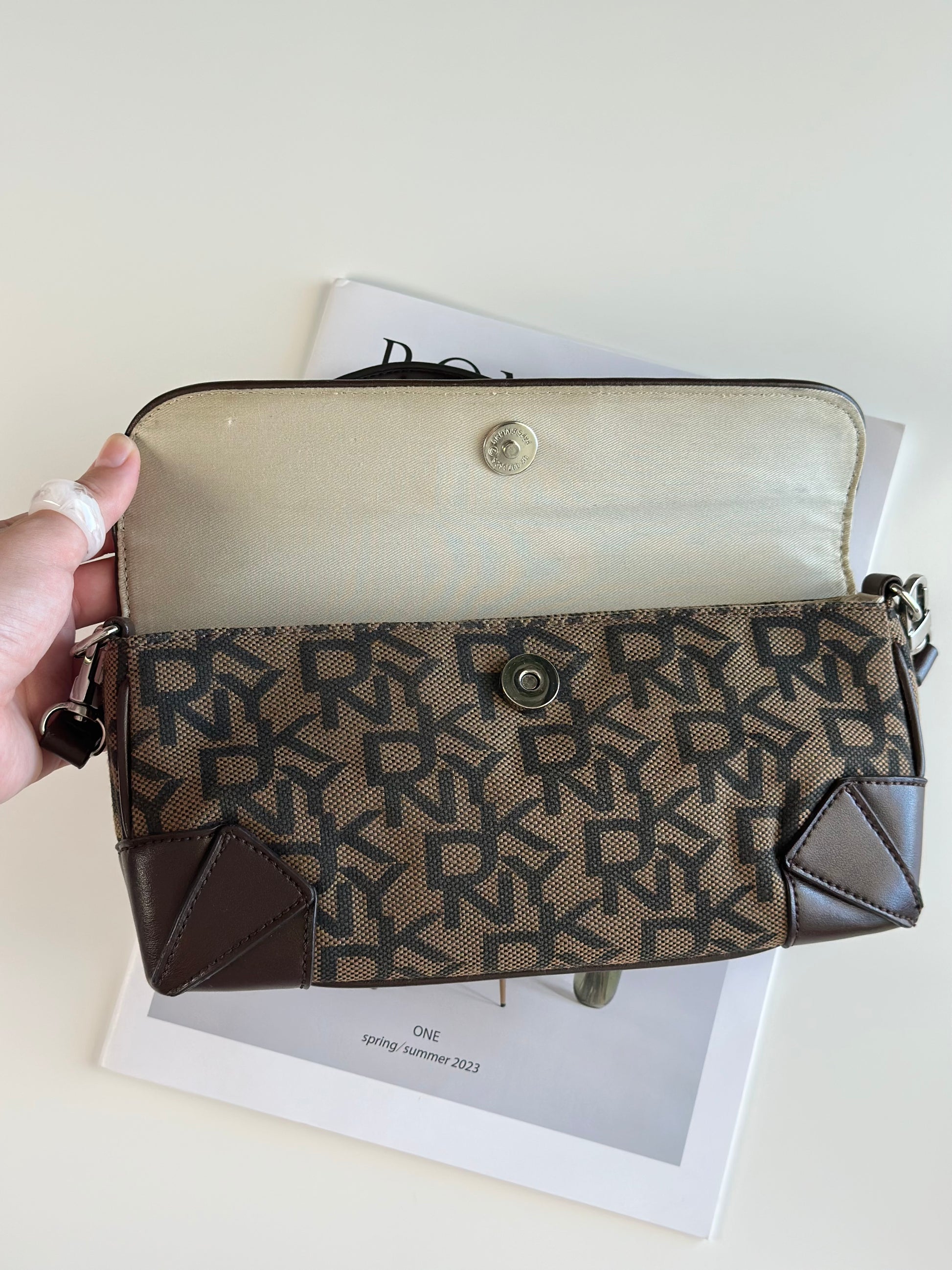Chic vintage DKNY baguette bag with a rich brown monogram pattern and genuine leather trim. Designed with clean lines, a rectangular silhouette, and a snap closure under the flap for easy access. Compact yet functional, it’s the perfect stylish bag with a touch of 2000s flair.