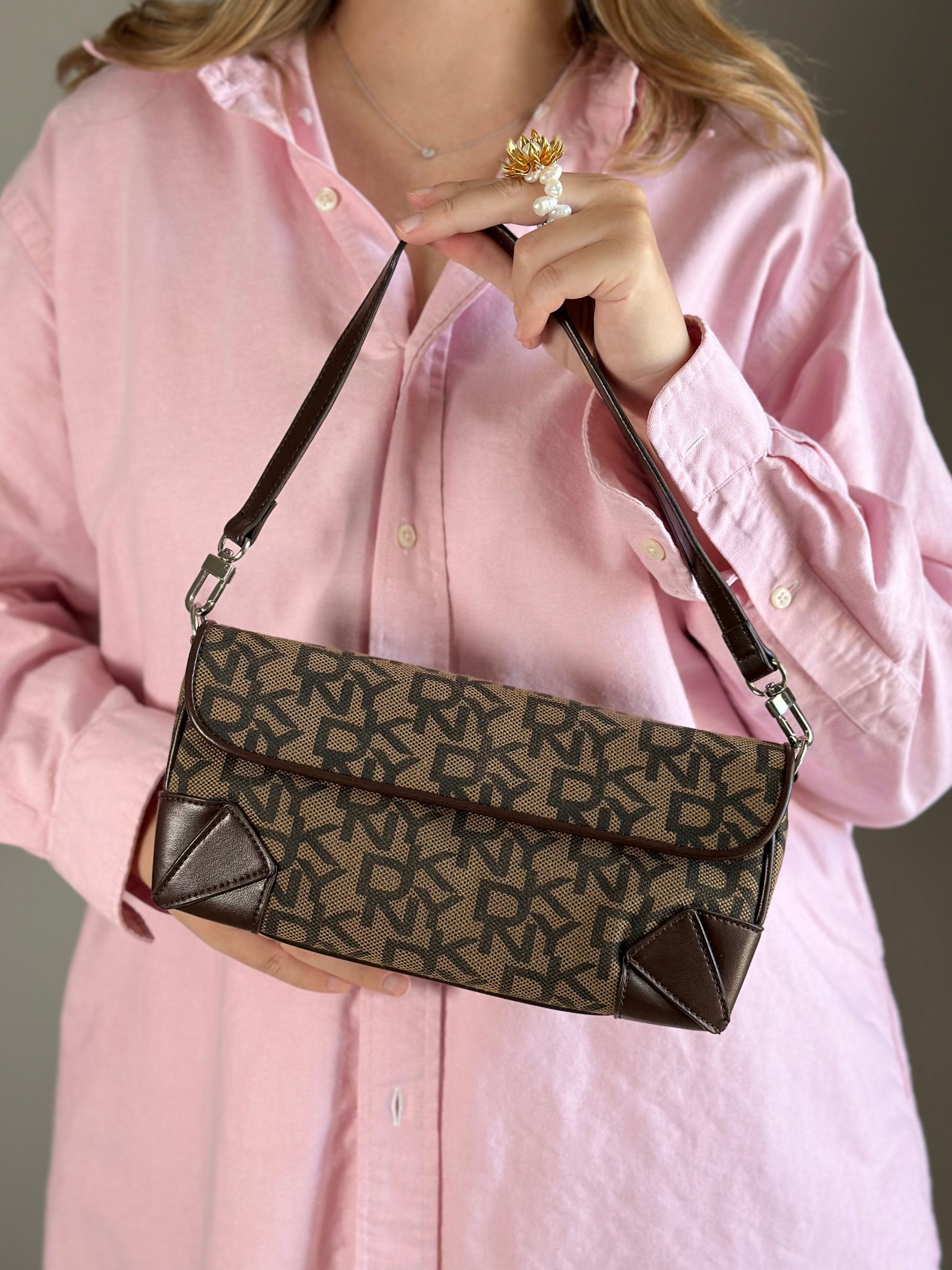 Chic vintage DKNY baguette bag with a rich brown monogram pattern