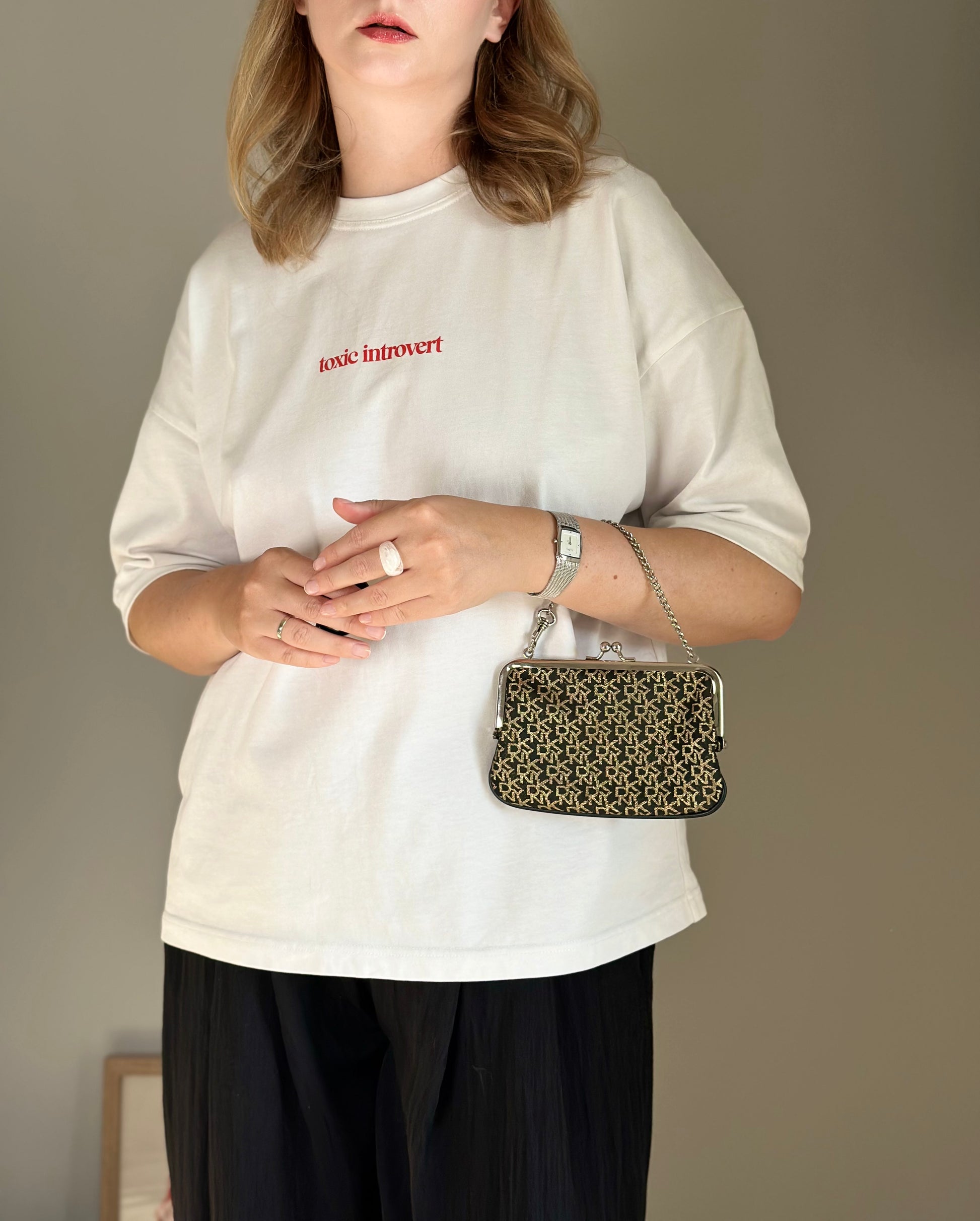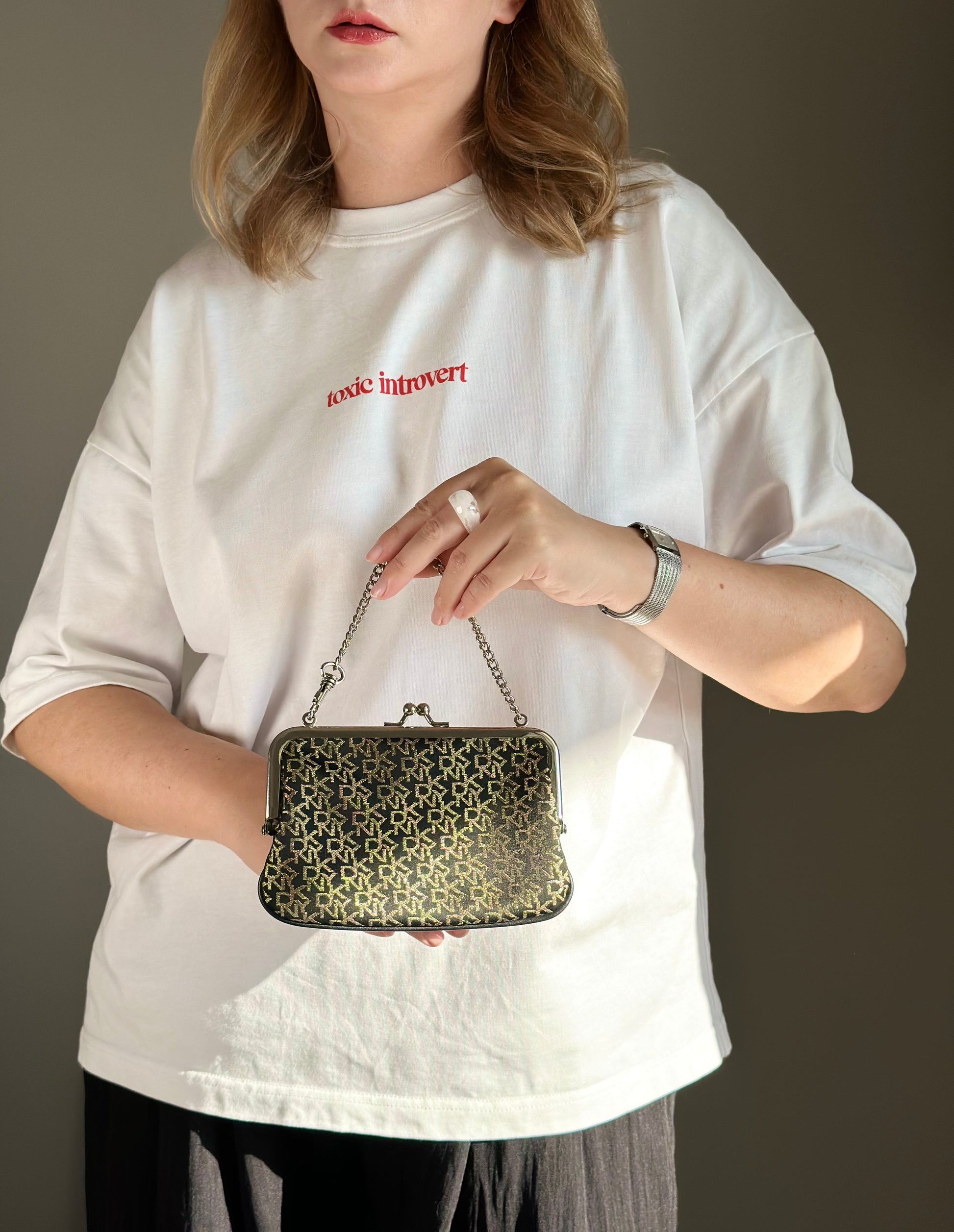 Chic vintage DKNY wallet or small clutch offers a touch of glamour with its metallic gold all-over logo pattern. The frame closure with a classic kiss-lock clasp and a delicate silver-tone chain strap adds a refined and practical element. The compact size makes it perfect for carrying essentials like cards, keys, or lipstick.