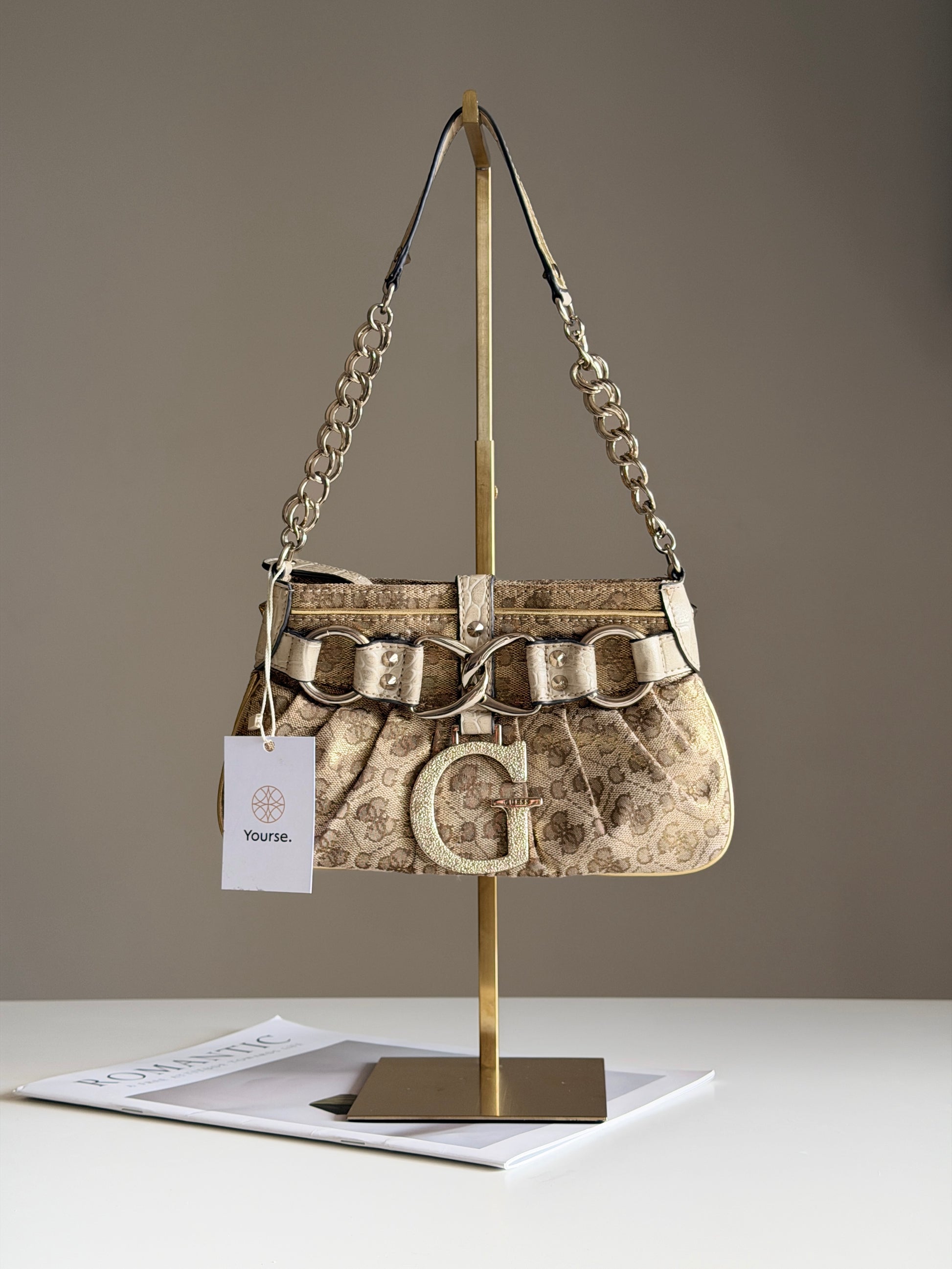 This vintage Guess handbag is a chic and glamorous accessory from 00s. Made from textured beige/gold canvas with a subtle monogram print, it features cream faux snakeskin trim and a bold silver-tone chain strap. The front showcases a large sparkling "G" logo and a buckle detail, making it a true statement piece.