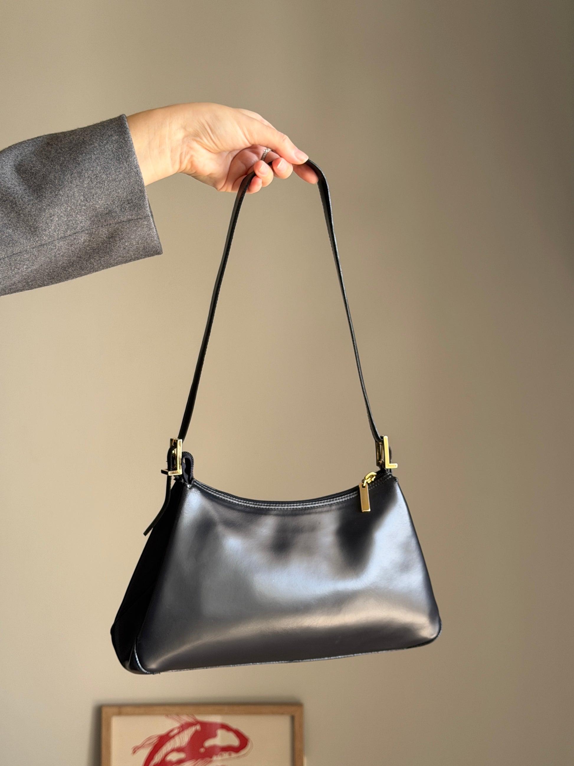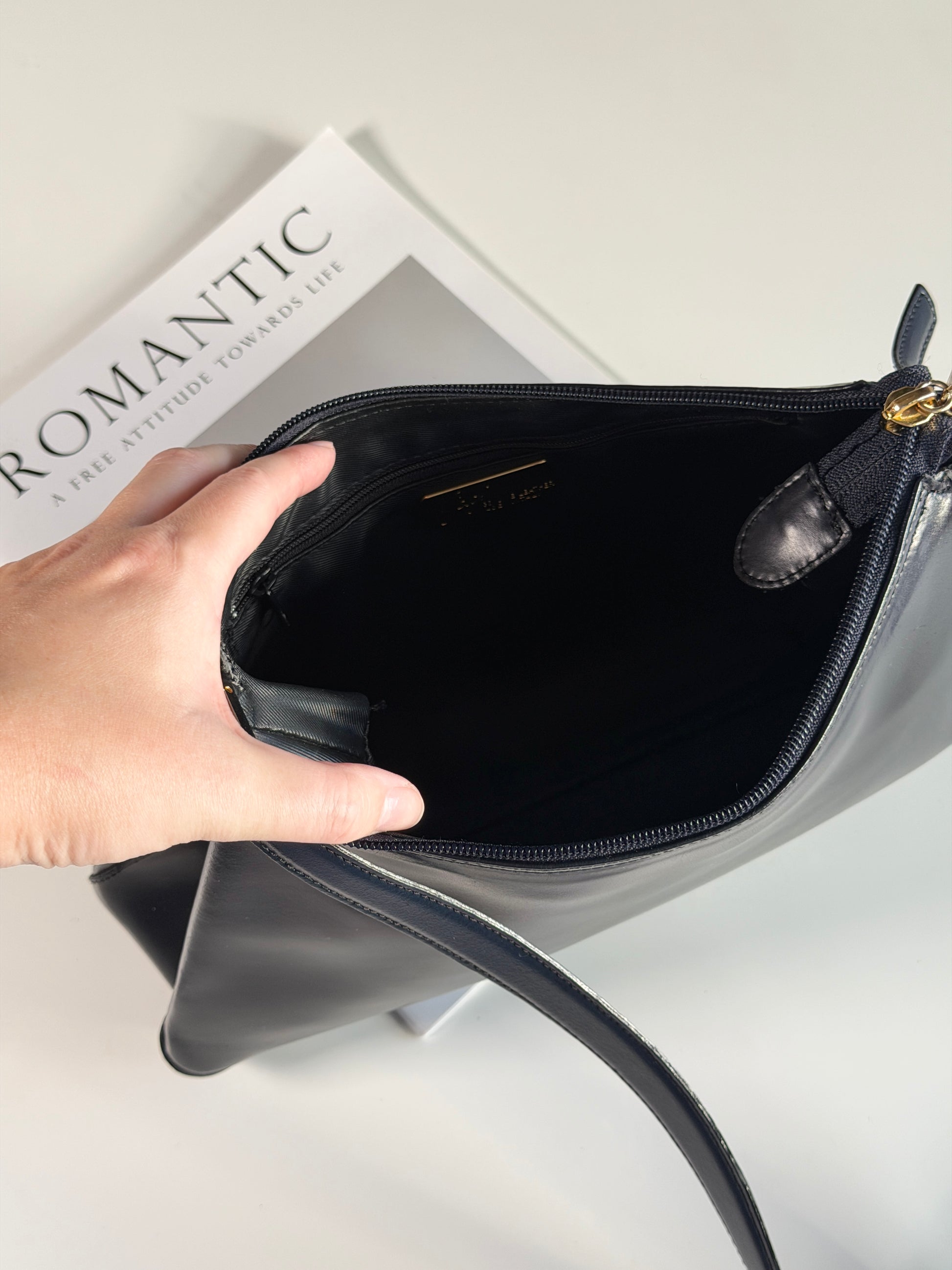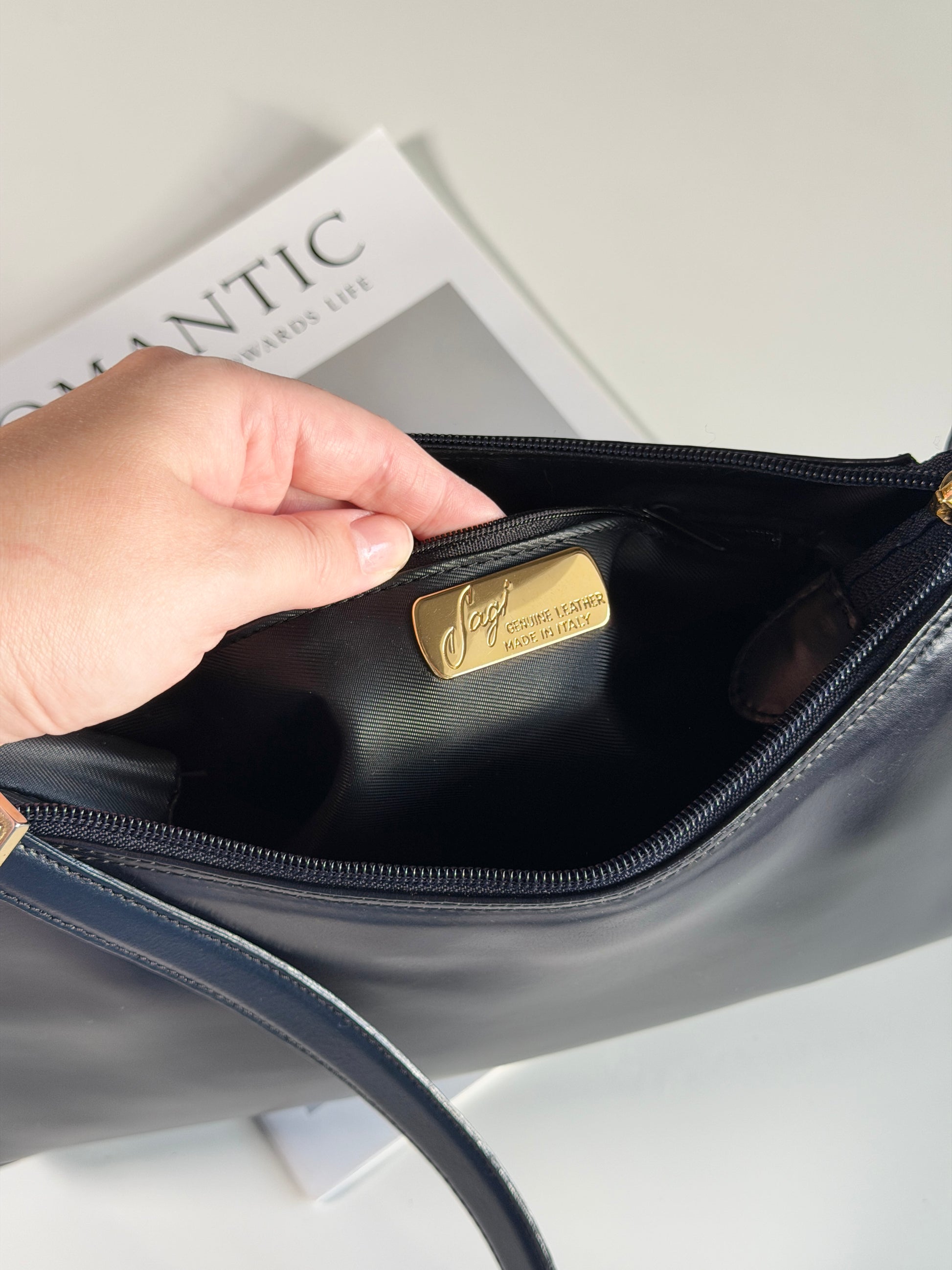 Classic vintage shoulder bag crafted from genuine leather in a deep navy-black tone (made in Italy). Featuring a smooth polished finish and a sleek curved silhouette, it’s complemented by a simple leather shoulder strap and minimal gold-tone hardware. Lined with a black fabric, this timeless piece reflects quality and understated elegance.