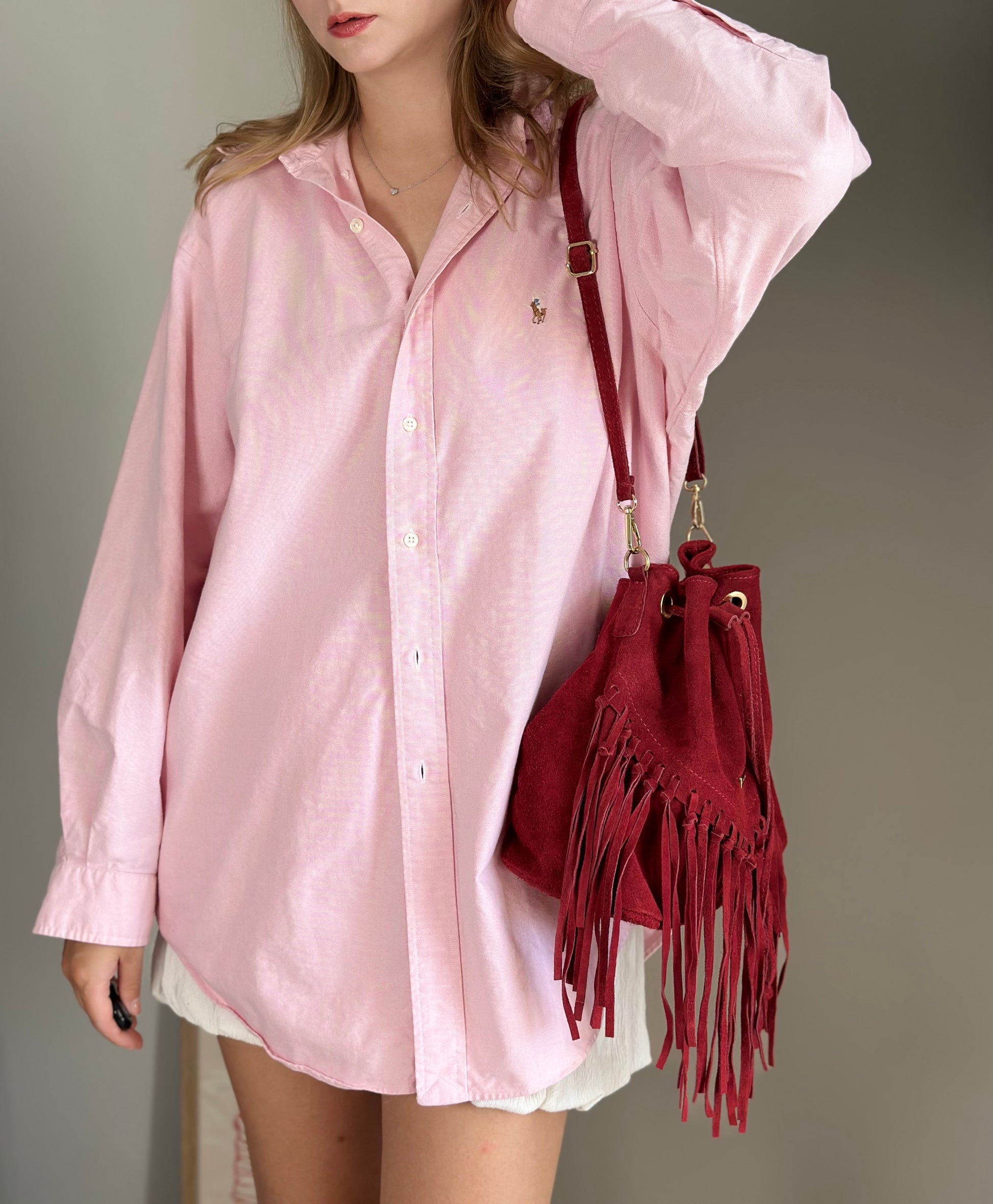 Vibrant dark red suede bucket bag from Tuscany Leather, handcrafted in Italy. This eye-catching piece is adorned with playful, swinging fringe details that add a touch of bohemian flair. A standout piece for a fashion-forward, vintage-inspired look. Comes with one main compartment and one more with a zip.