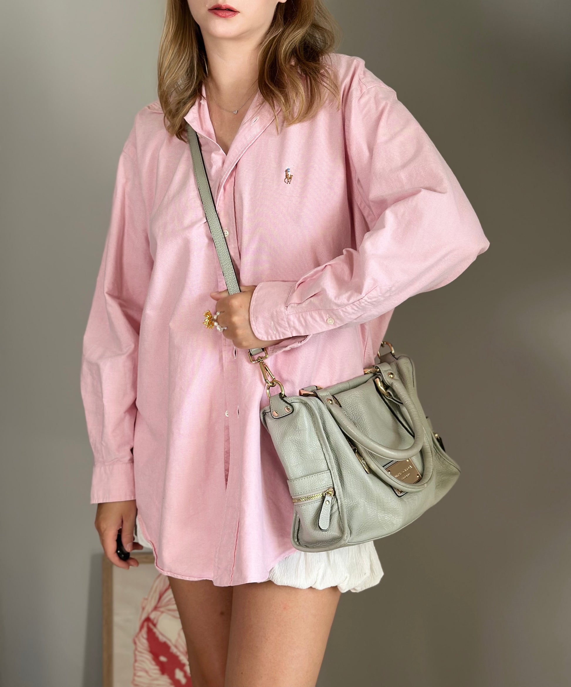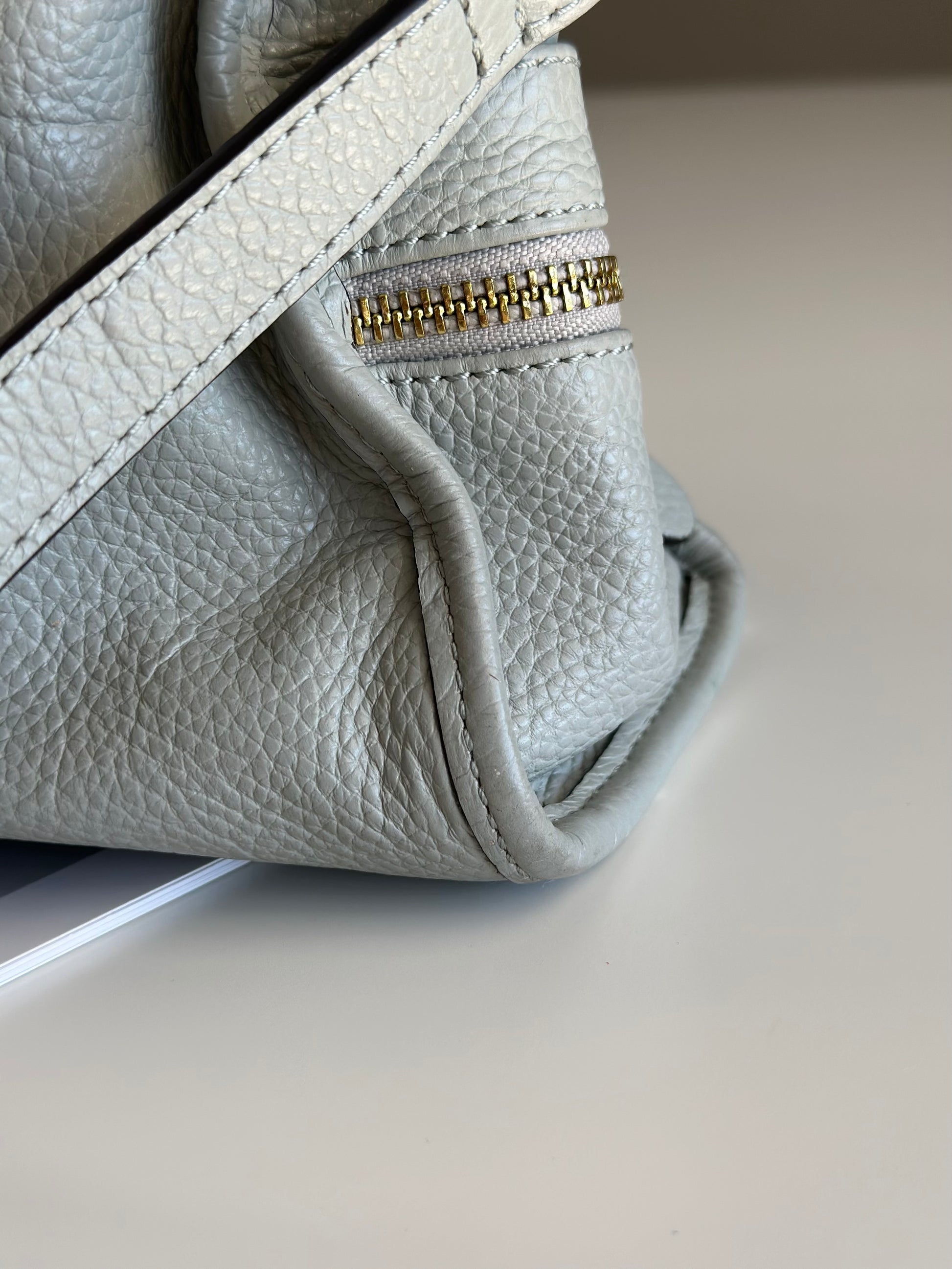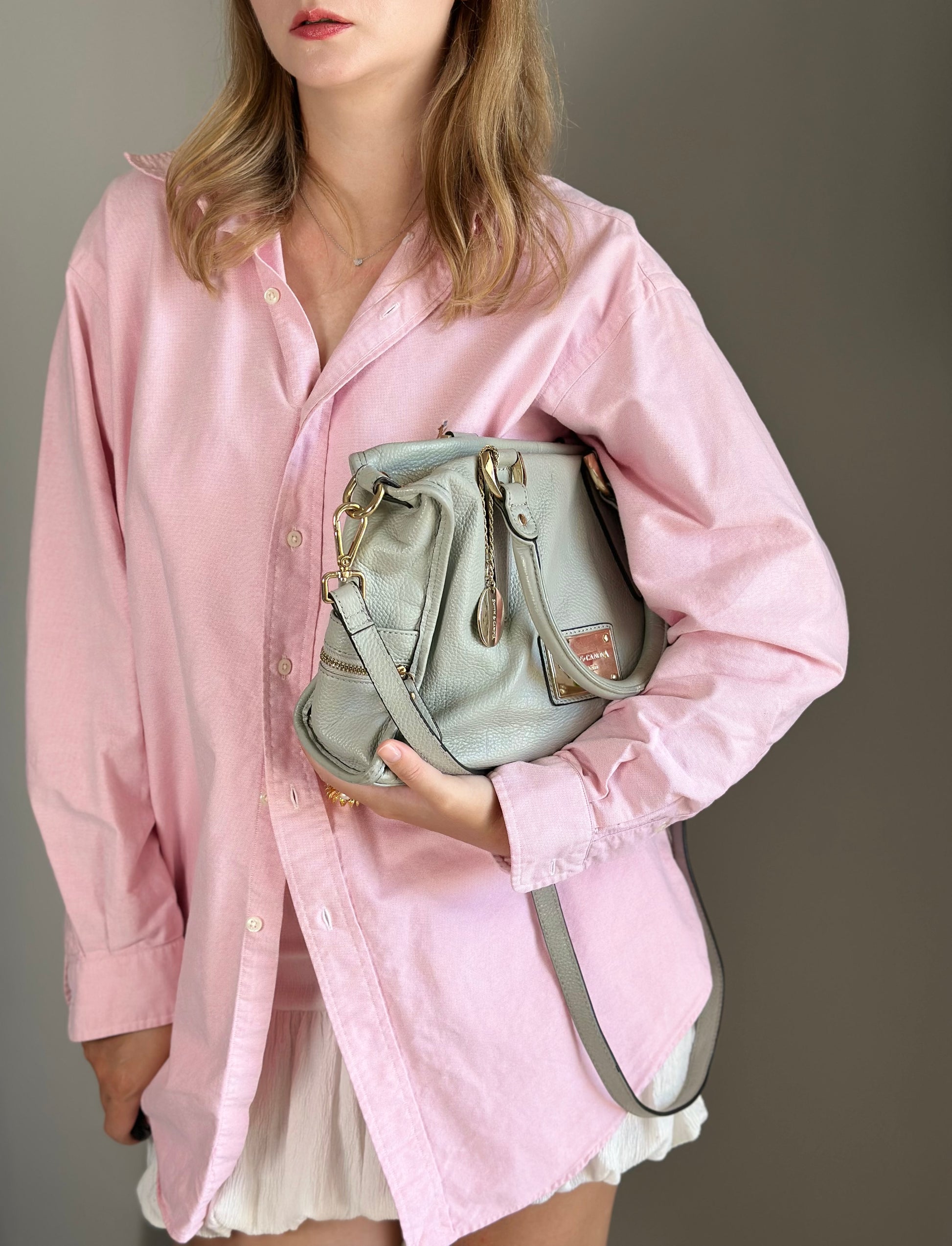 Elegant grey leather handbag from Smith & Canova (England) combining classic style with practical functionality. Made from supple, textured leather, it features a relaxed yet structured silhouette, exterior zippered pockets, and a well-organized interior. Gold-tone hardware adds a polished touch, making it a sophisticated choice for everyday use.