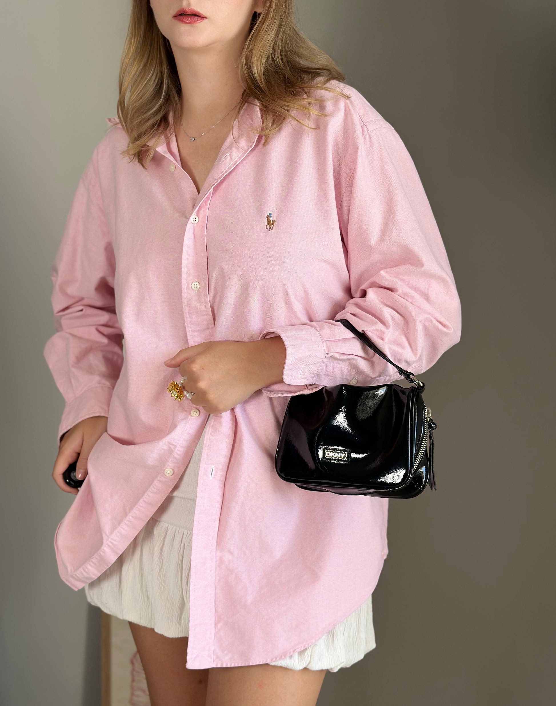 This glossy black vintage bag from DKNY offers a chic Y2K aesthetic. The patent finish provides a high-shine, luxurious look, while the compact silhouette keeps it modern. Featuring a sleek top handle and silver-tone hardware, including a minimalist DKNY logo plate, this bag is a statement piece that adds a touch of glamour to any outfit.