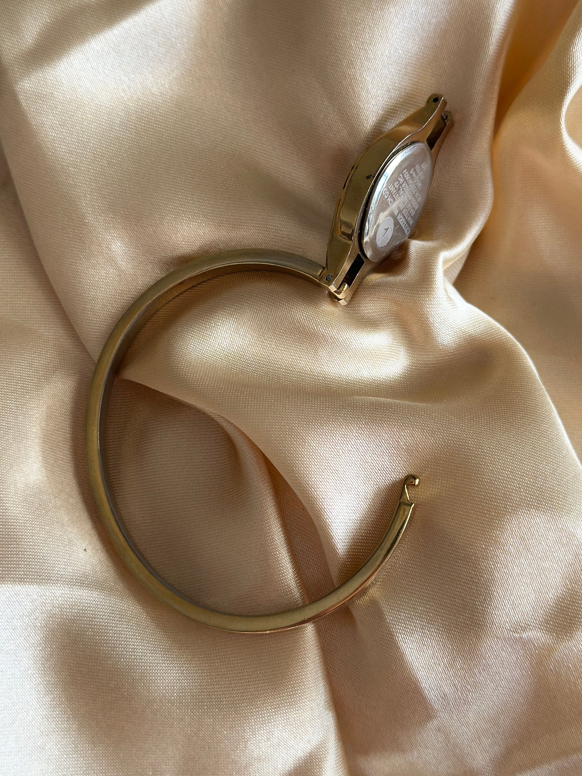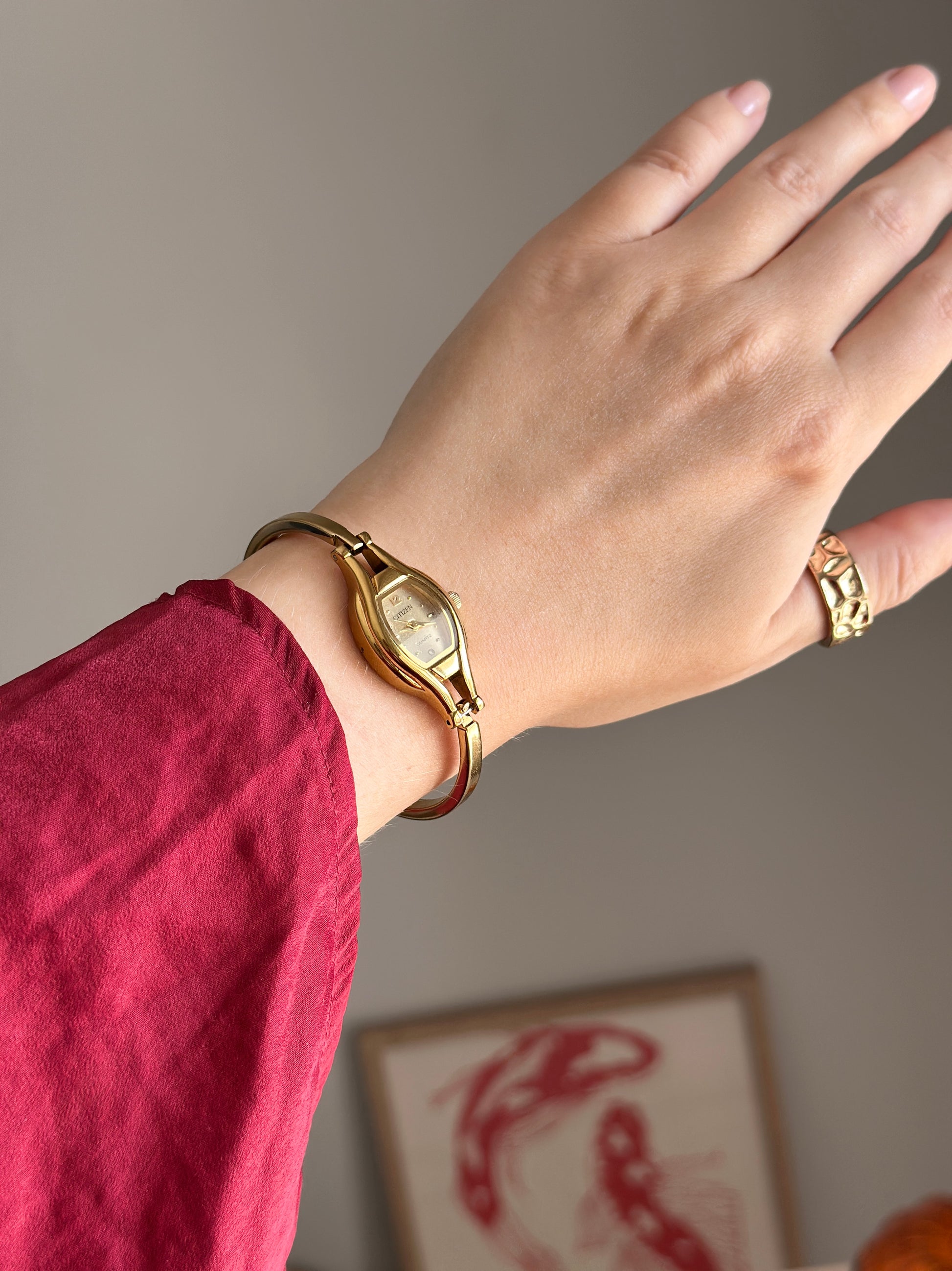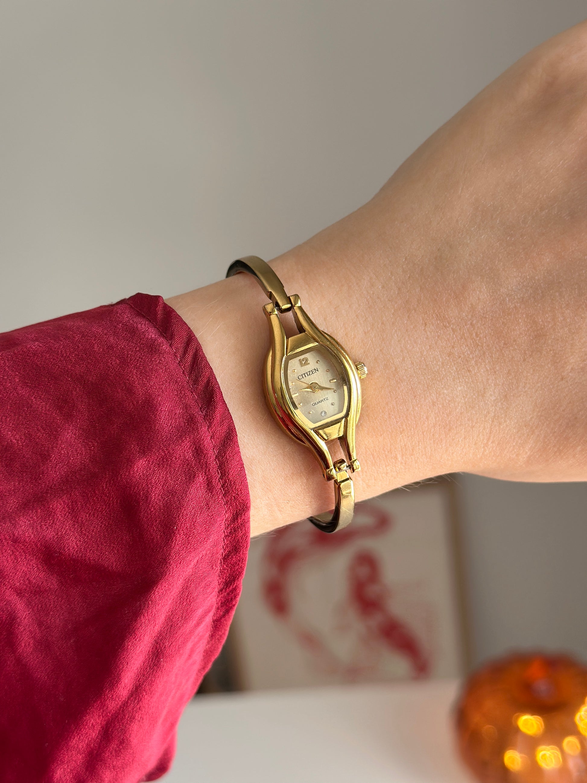 Lovely vintage Citizen ladies’ watch with a classic gold-tone finish and refined oval case. Features a minimalist champagne dial with gold-tone hour markers and a single crystal accent. The smooth bangle-style bracelet offers a comfortable and stylish fit.