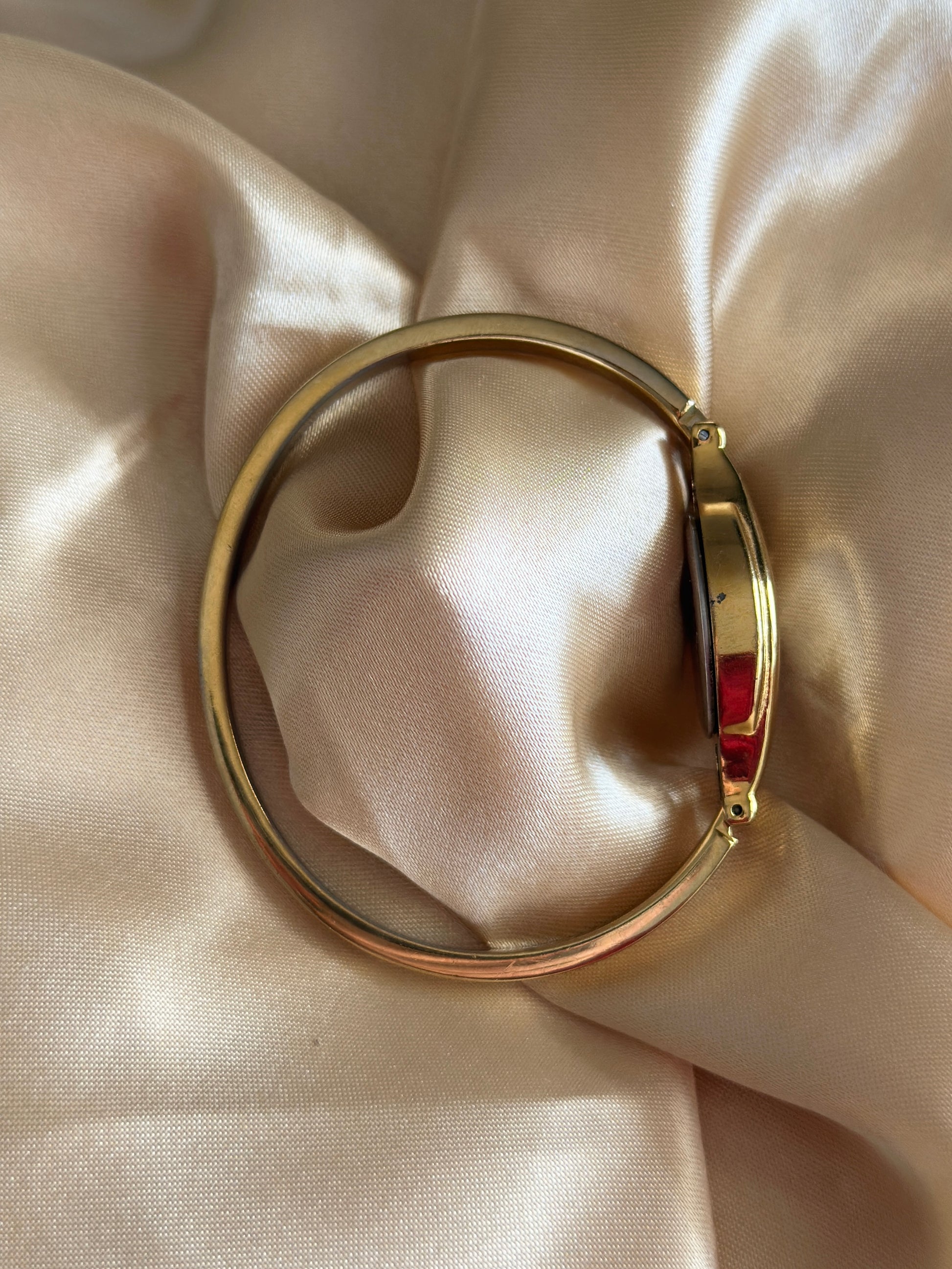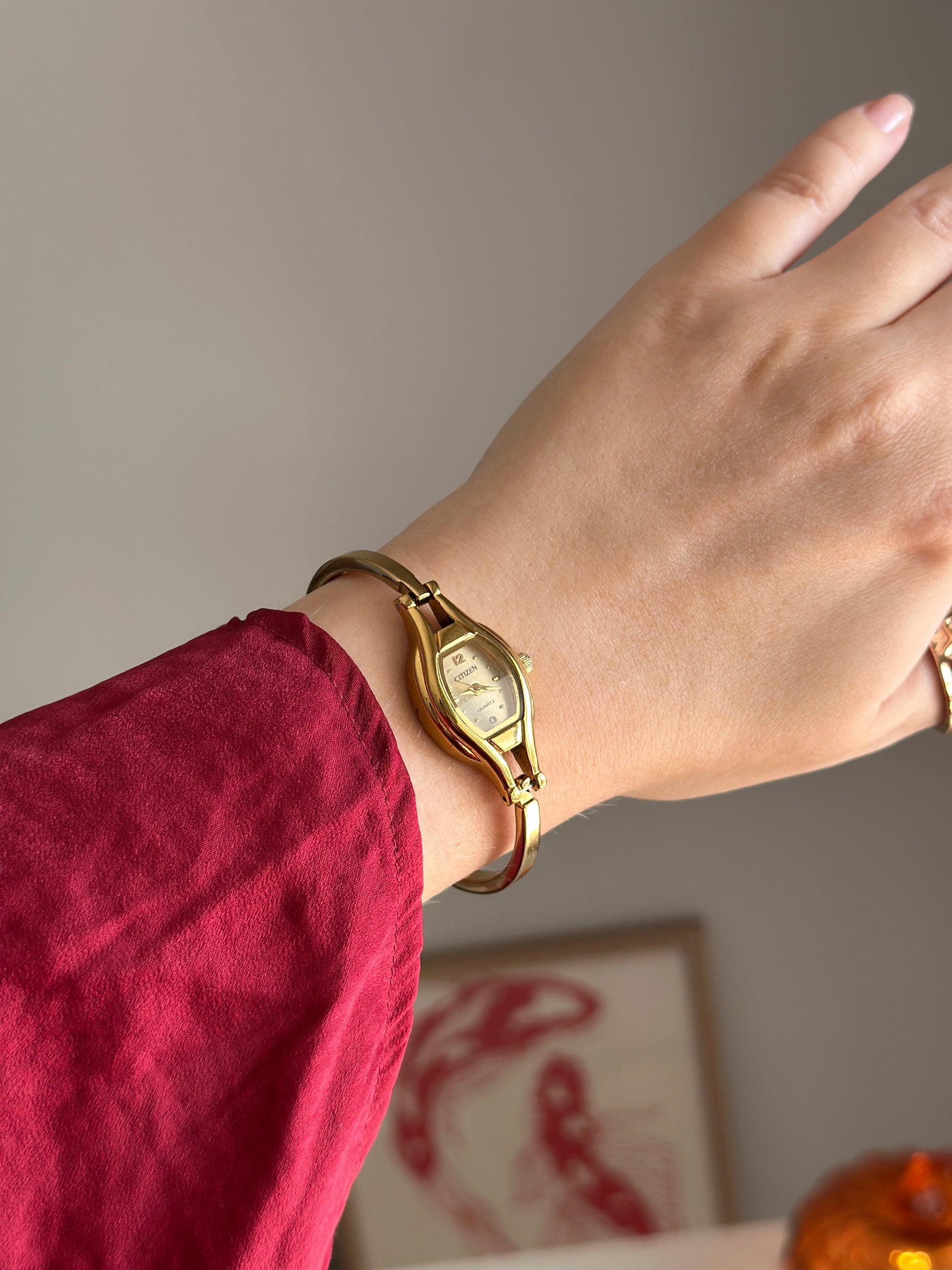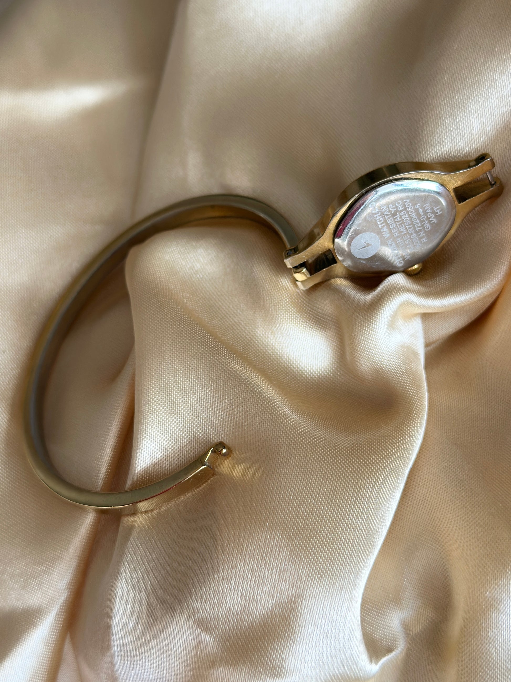 Lovely vintage Citizen ladies’ watch with a classic gold-tone finish and refined oval case. Features a minimalist champagne dial with gold-tone hour markers and a single crystal accent. The smooth bangle-style bracelet offers a comfortable and stylish fit.