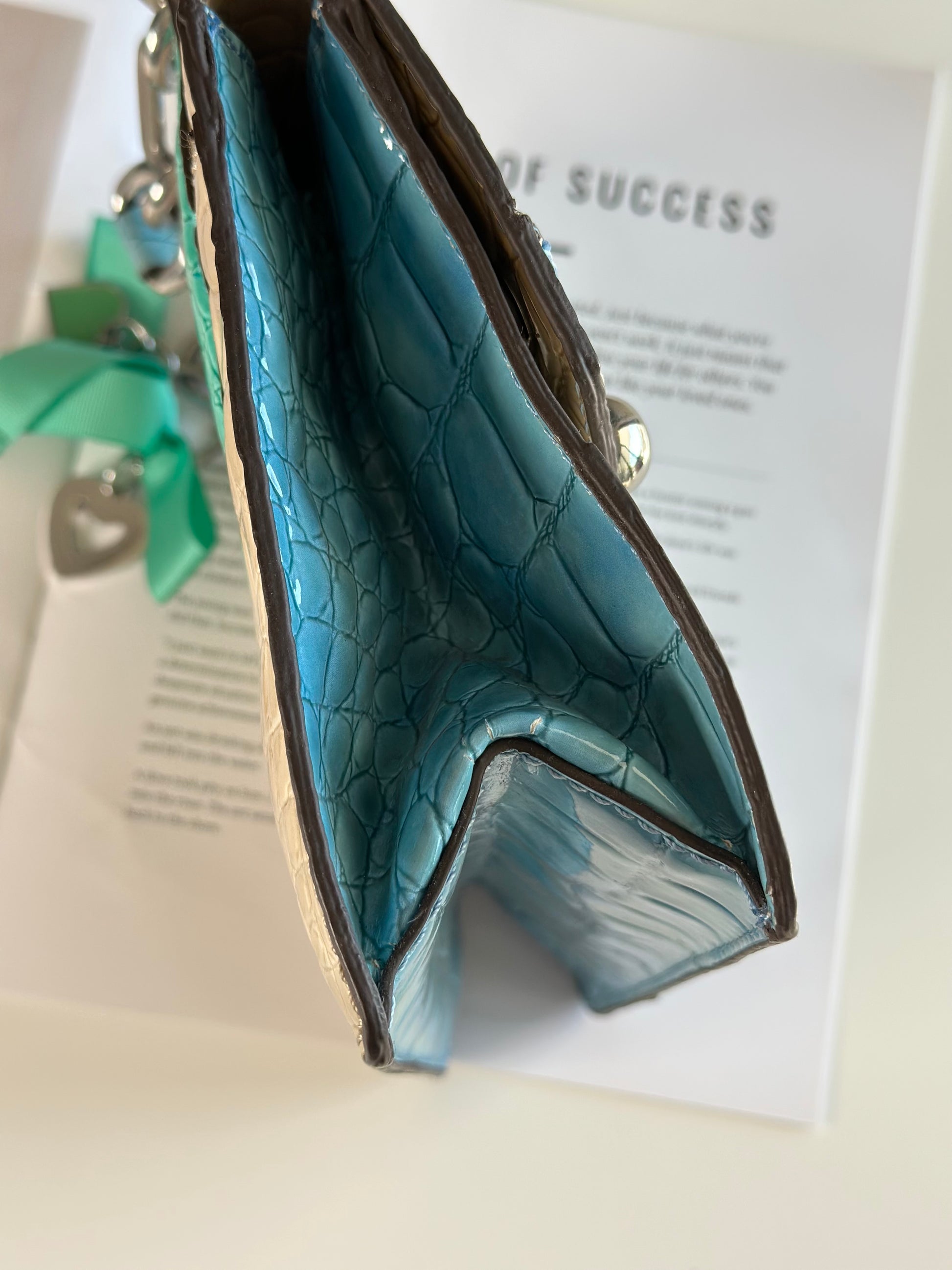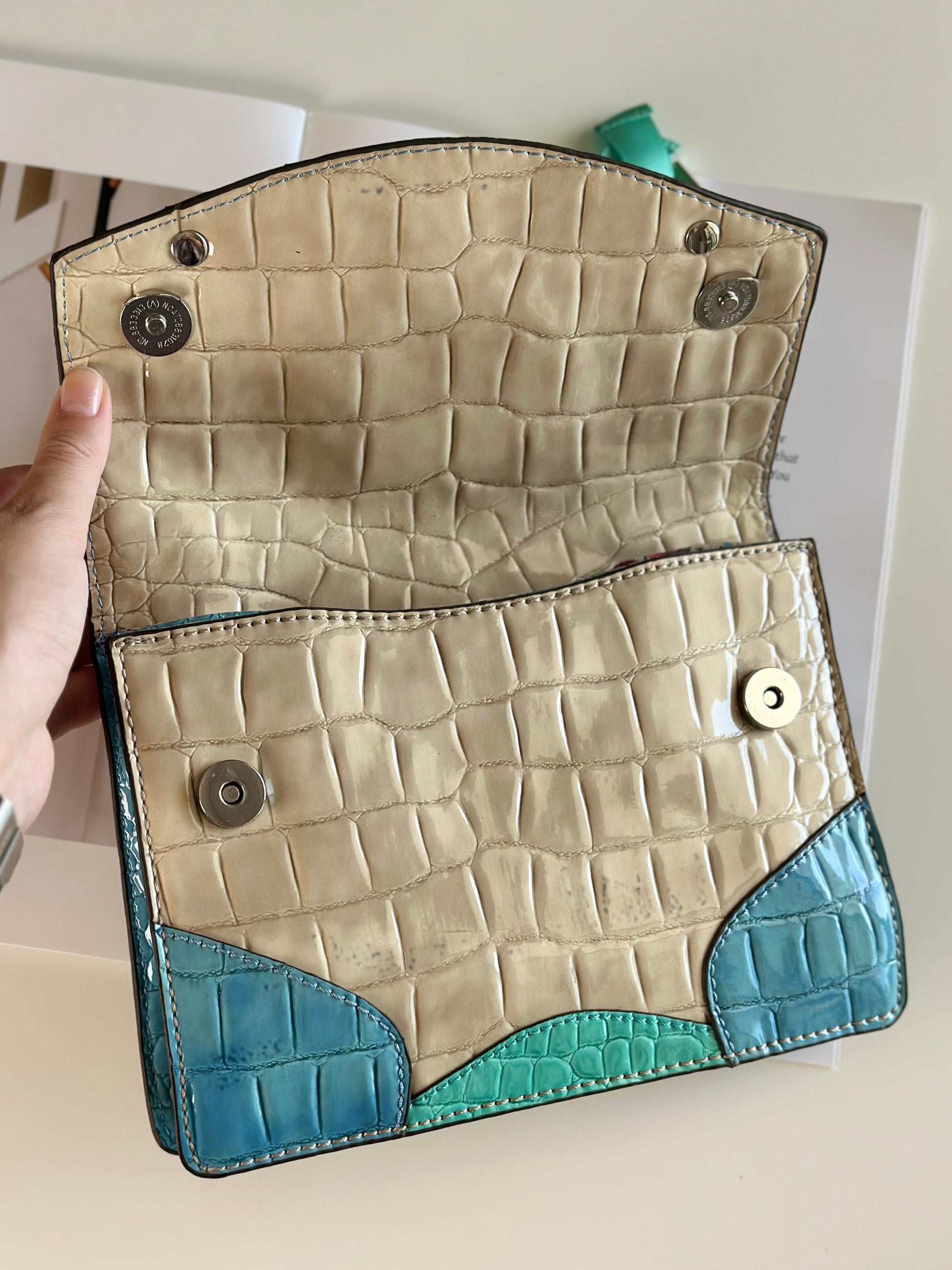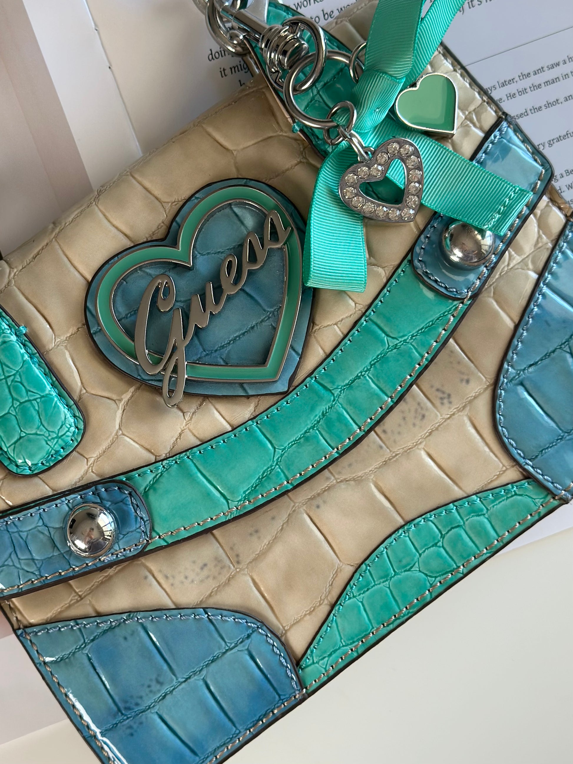 Playful vintage Guess handbag featuring crocodile-embossed faux leather in beige, turquoise, and sky blue. Accented with silver-tone hardware, a sparkling heart charm, and a coordinating green ribbon. The flap closure opens to a logo-lined interior with practical compartments, making it as functional as it is eye-catching. Comes with additional long strap.