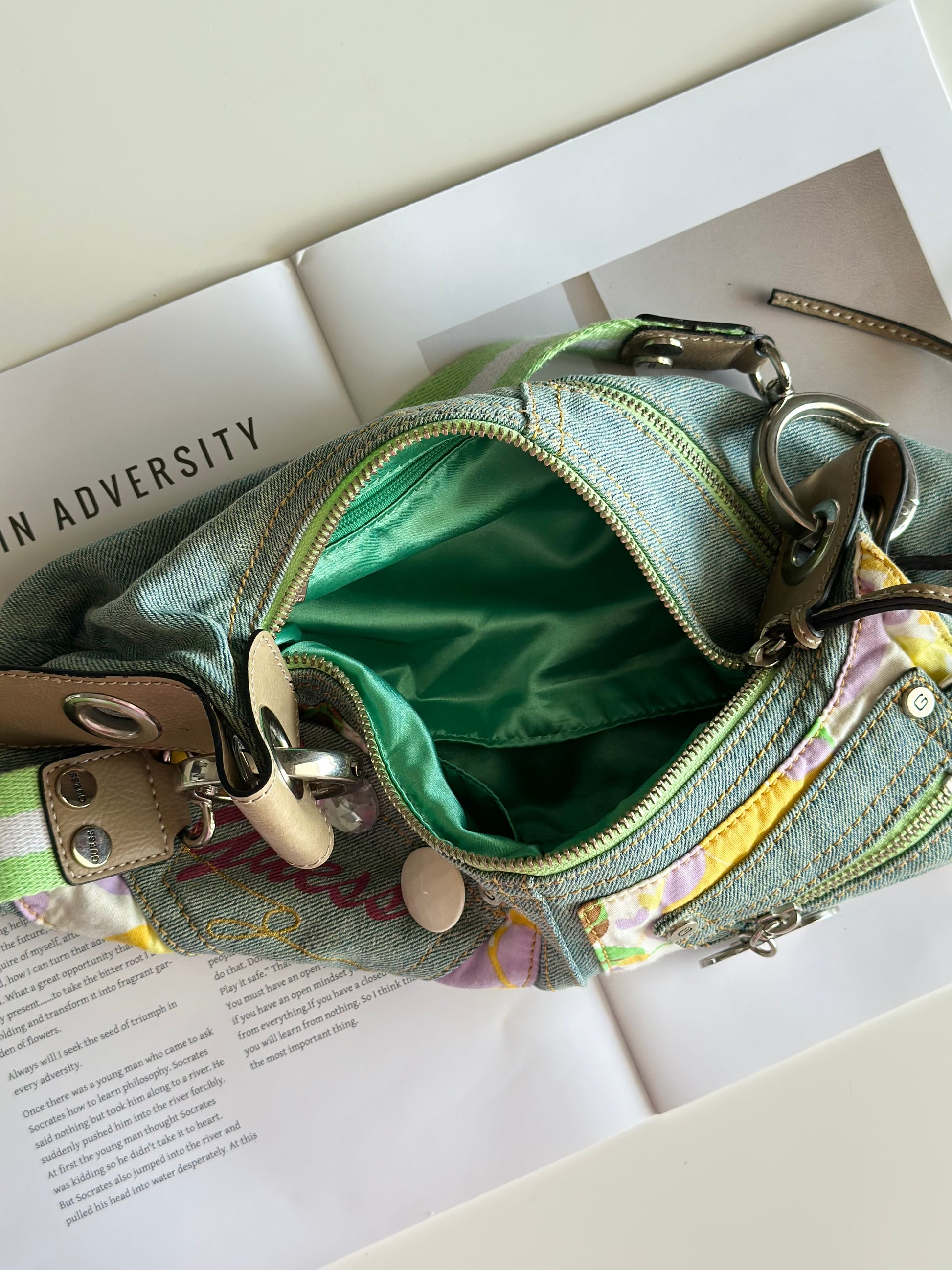 A true explosion of Y2K creativity, this vintage Guess bag is a maximalist's dream. The light-wash denim body acts as a canvas for a playful mix of floral patchwork, bold button embellishments, and a pink logo. A sporty striped canvas strap, chunky silver-tone hardware, and vibrant lime green zippers complete this fun and unforgettable piece of early 2000s fashion. Rare vintage find ❣️