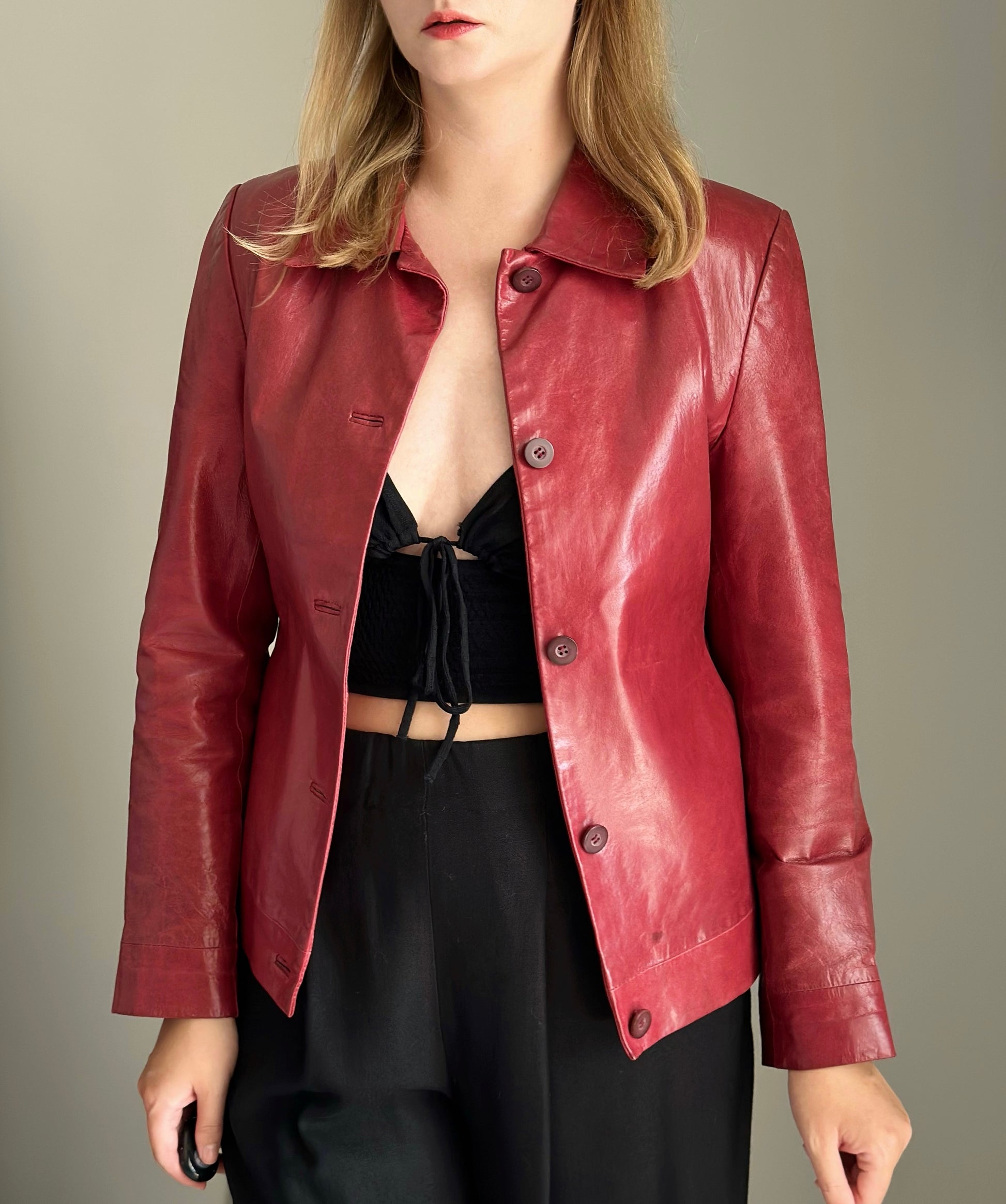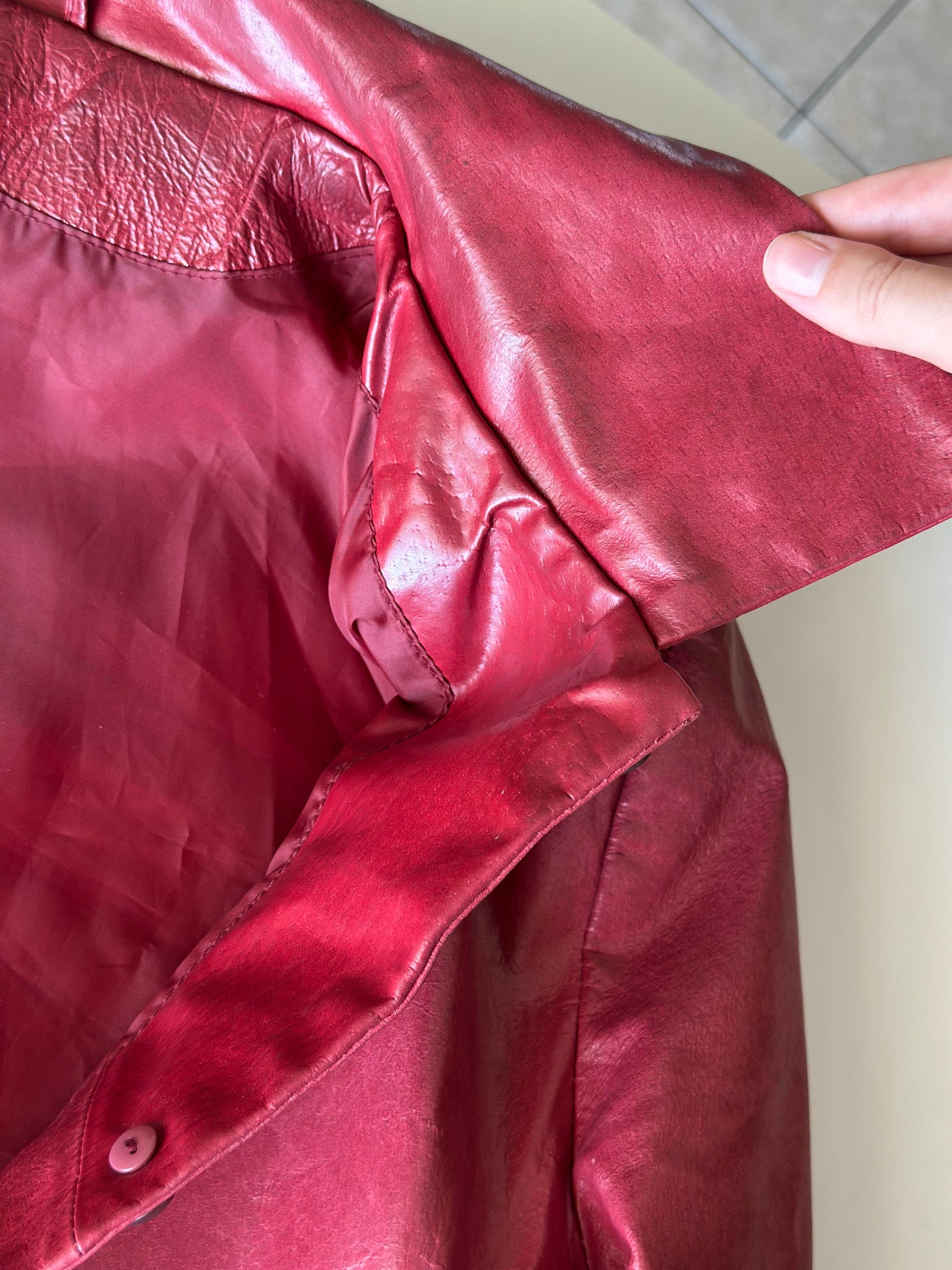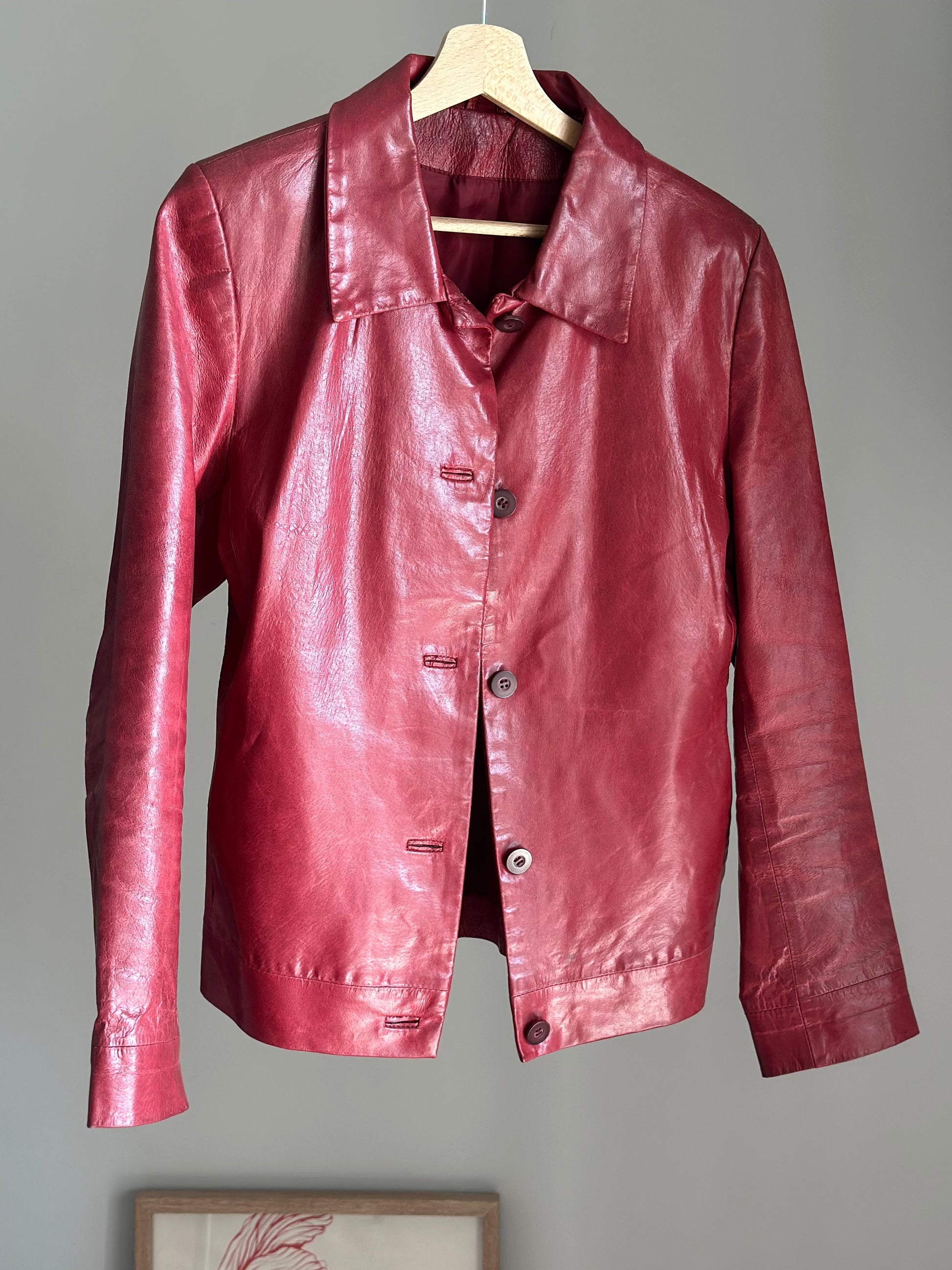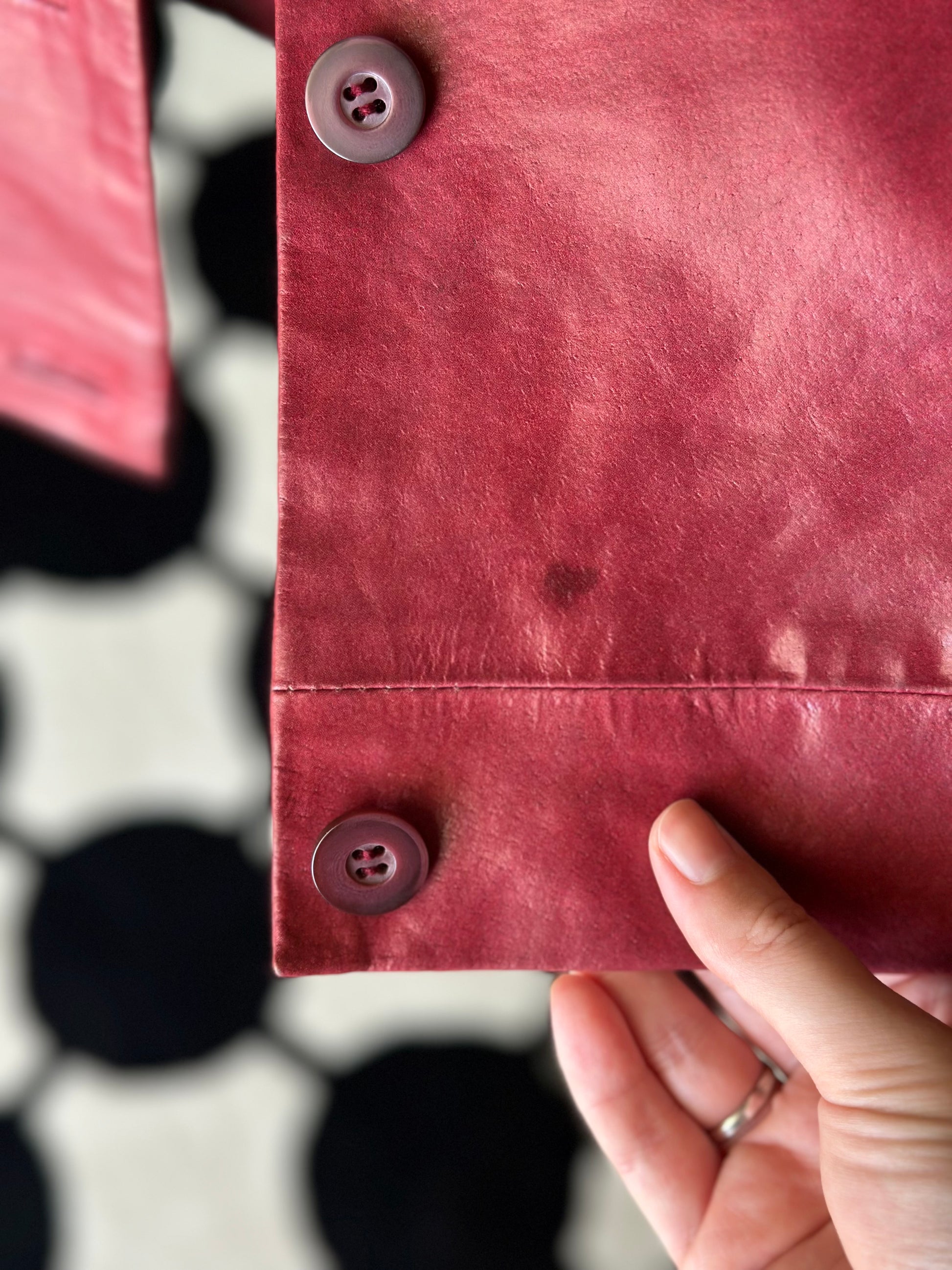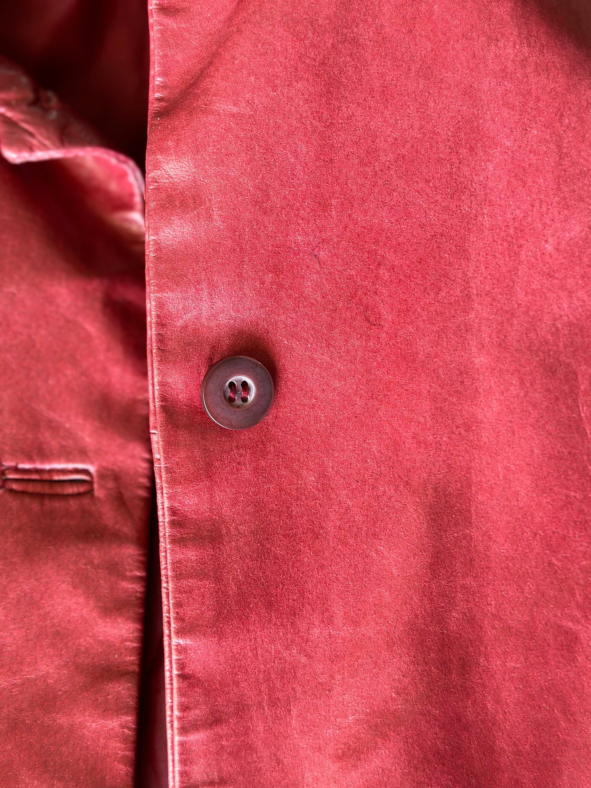 Standout vintage piece of late '90s/Y2K design from Canda. This jacket is crafted from a unique suede leather that has been treated with a nappa-effect finish, giving it a subtle sheen in a striking raspberry red. The silhouette is a study in minimalism, with a clean, tailored fit, simple button front, and a classic collar, allowing the bold colour and unique texture to take centre stage.