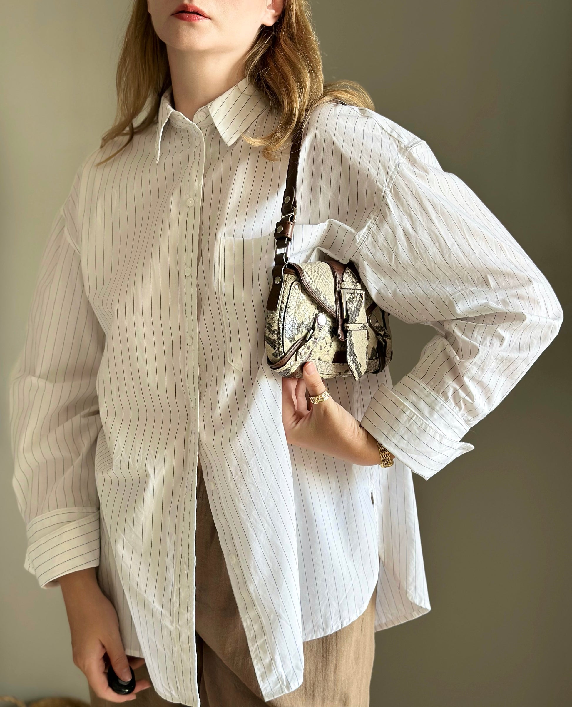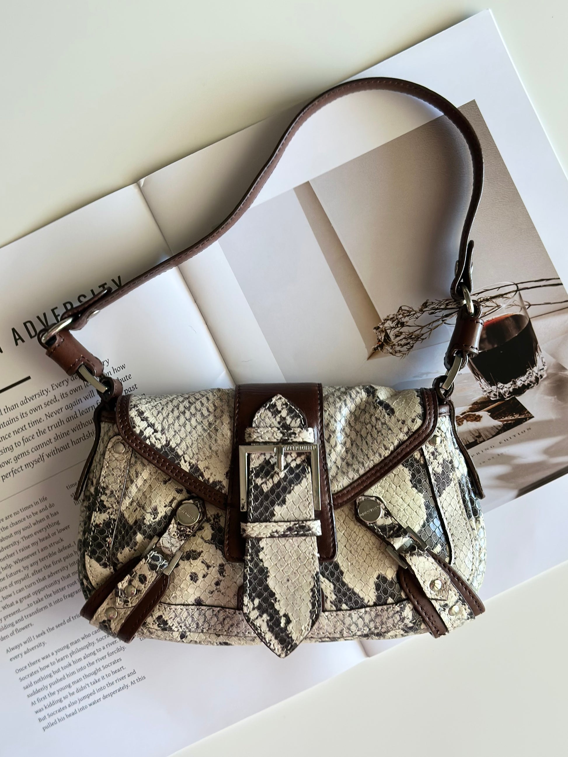 A standout piece of Y2K glamour from Karen Millen. This shoulder bag features a bold python-effect exterior paired with rich chocolate brown leather trim. The layered flap is finished with polished, logo-engraved buckles and hardware, capturing the era’s love for edgy, detail-driven accessories.