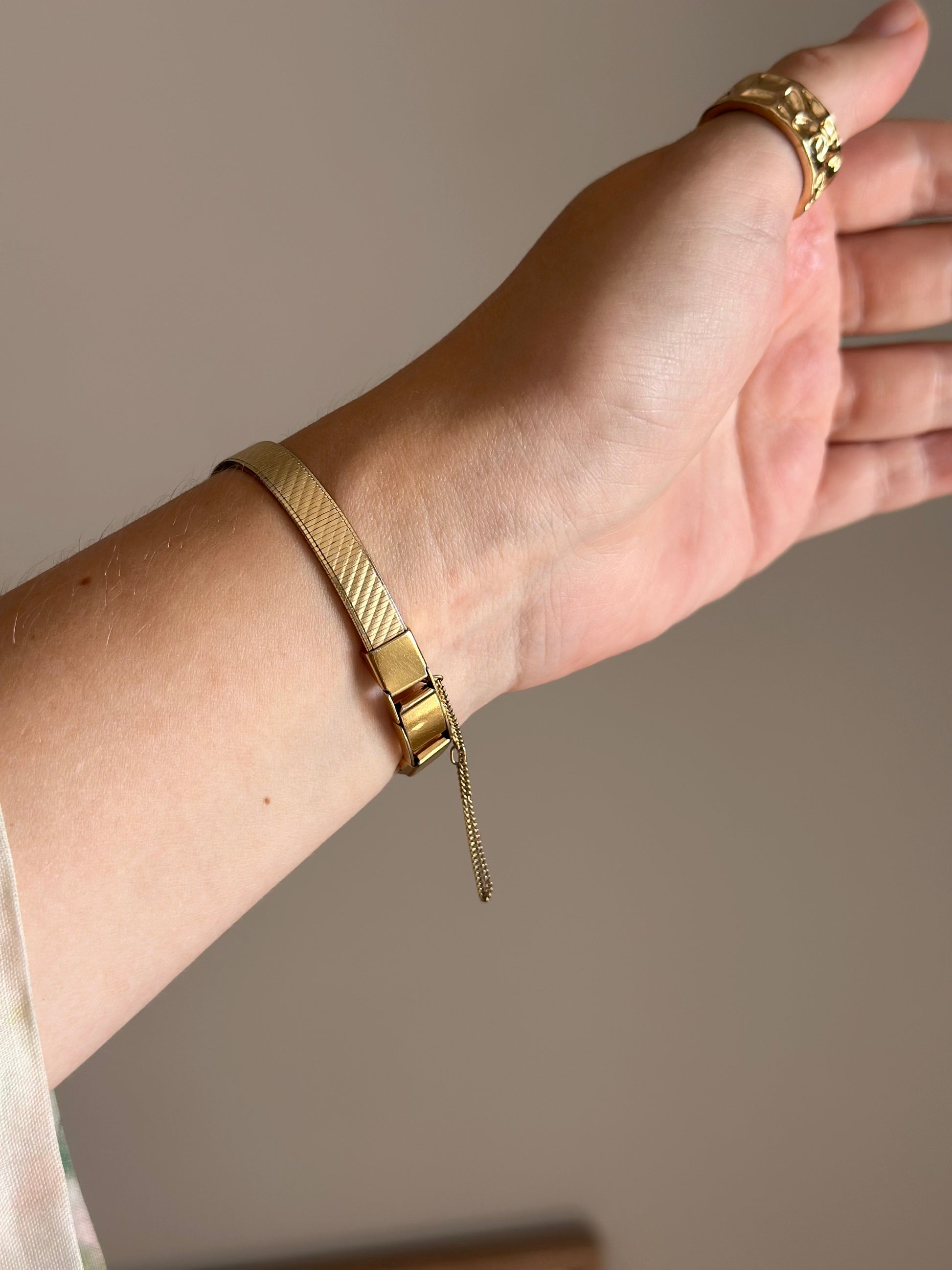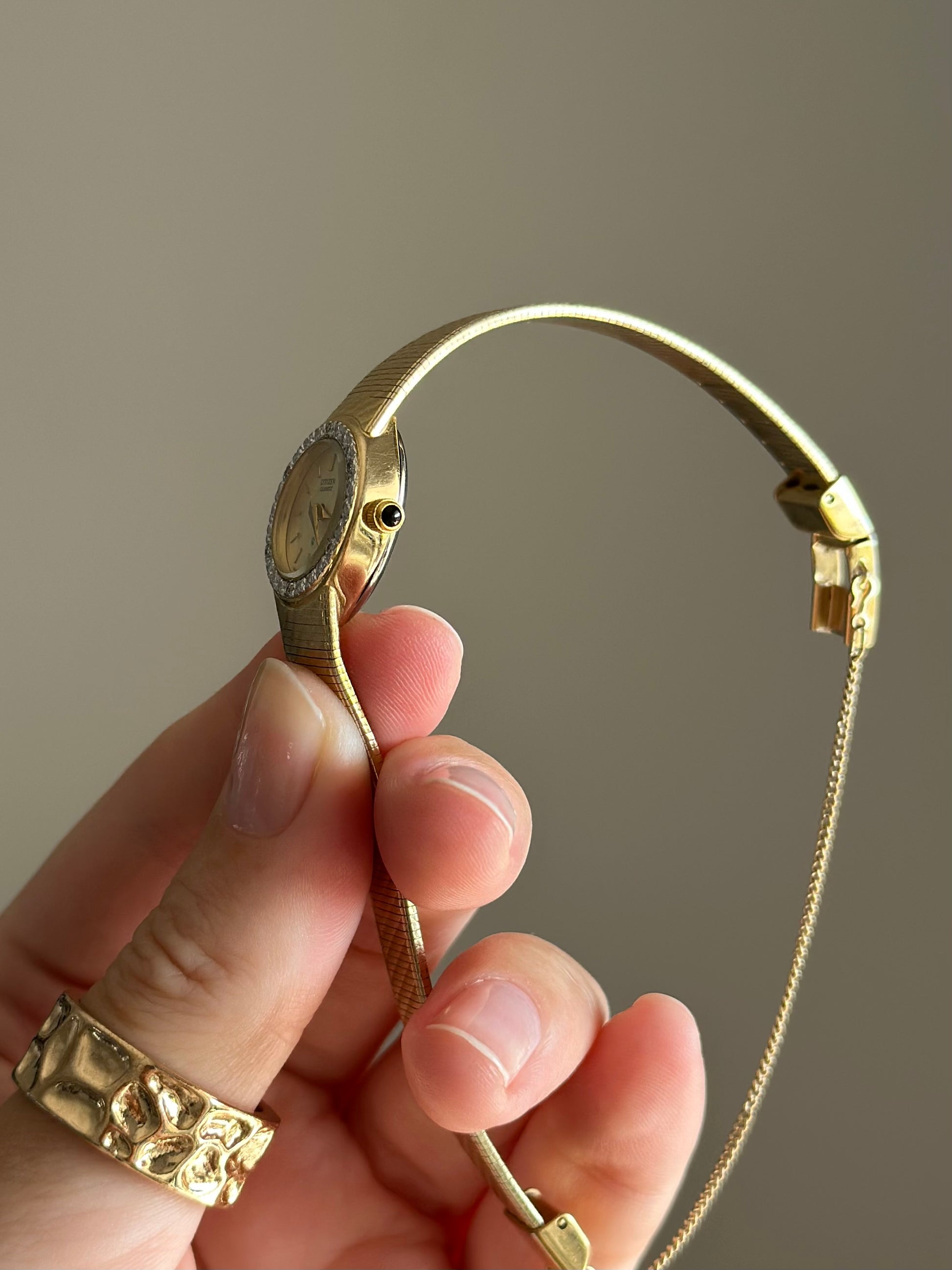 Stunning authentic vintage gold-tone Citizen watch (1980s). The case is elegantly accented with a sparkling crystals, while the creamy dial with subtle gold-tone markers and hands offers a clean, classic look. Finished with a delicate safety chain for added security. A versatile vintage piece that works perfectly as both a watch and a jewelry-like accessory.