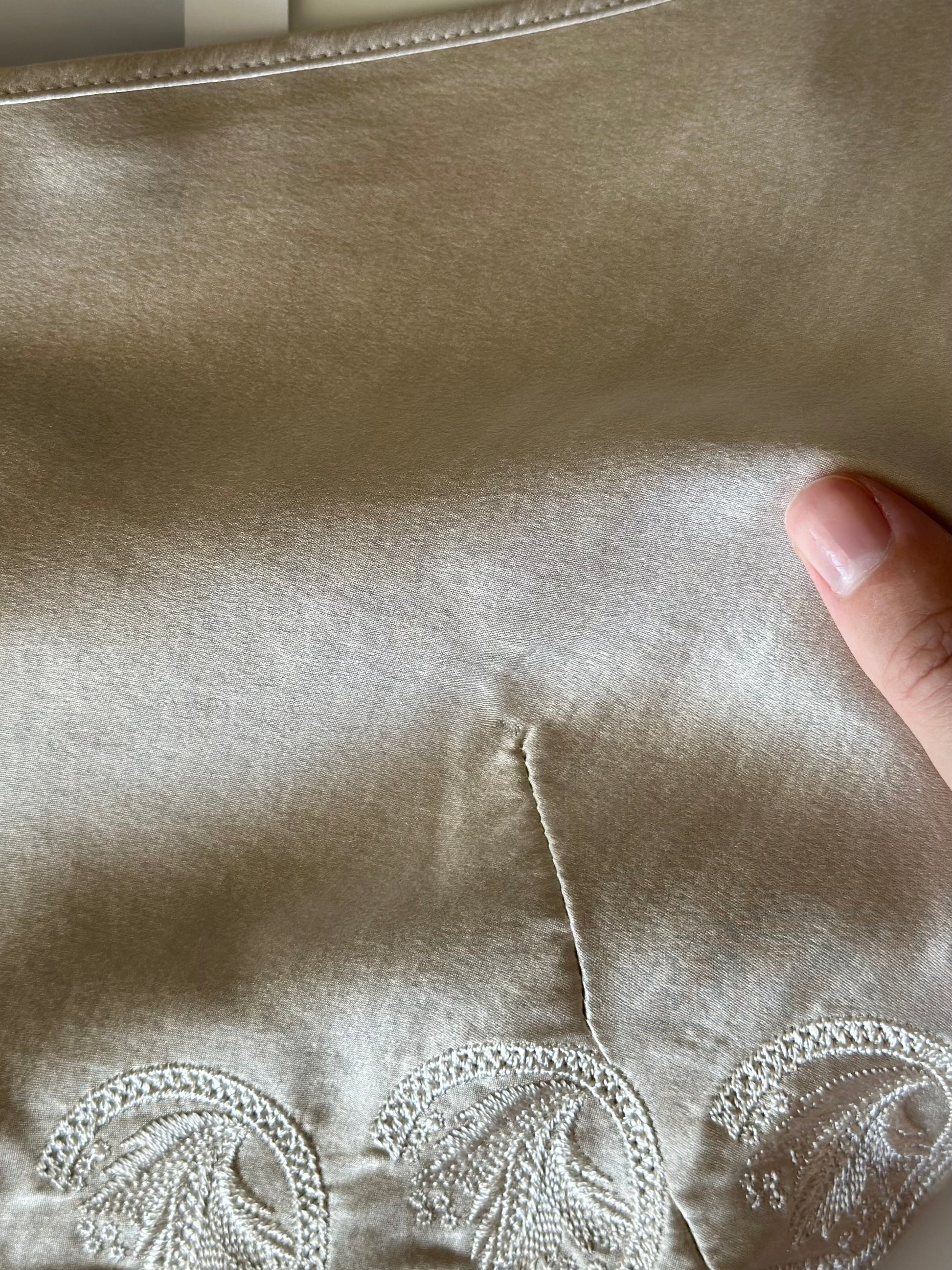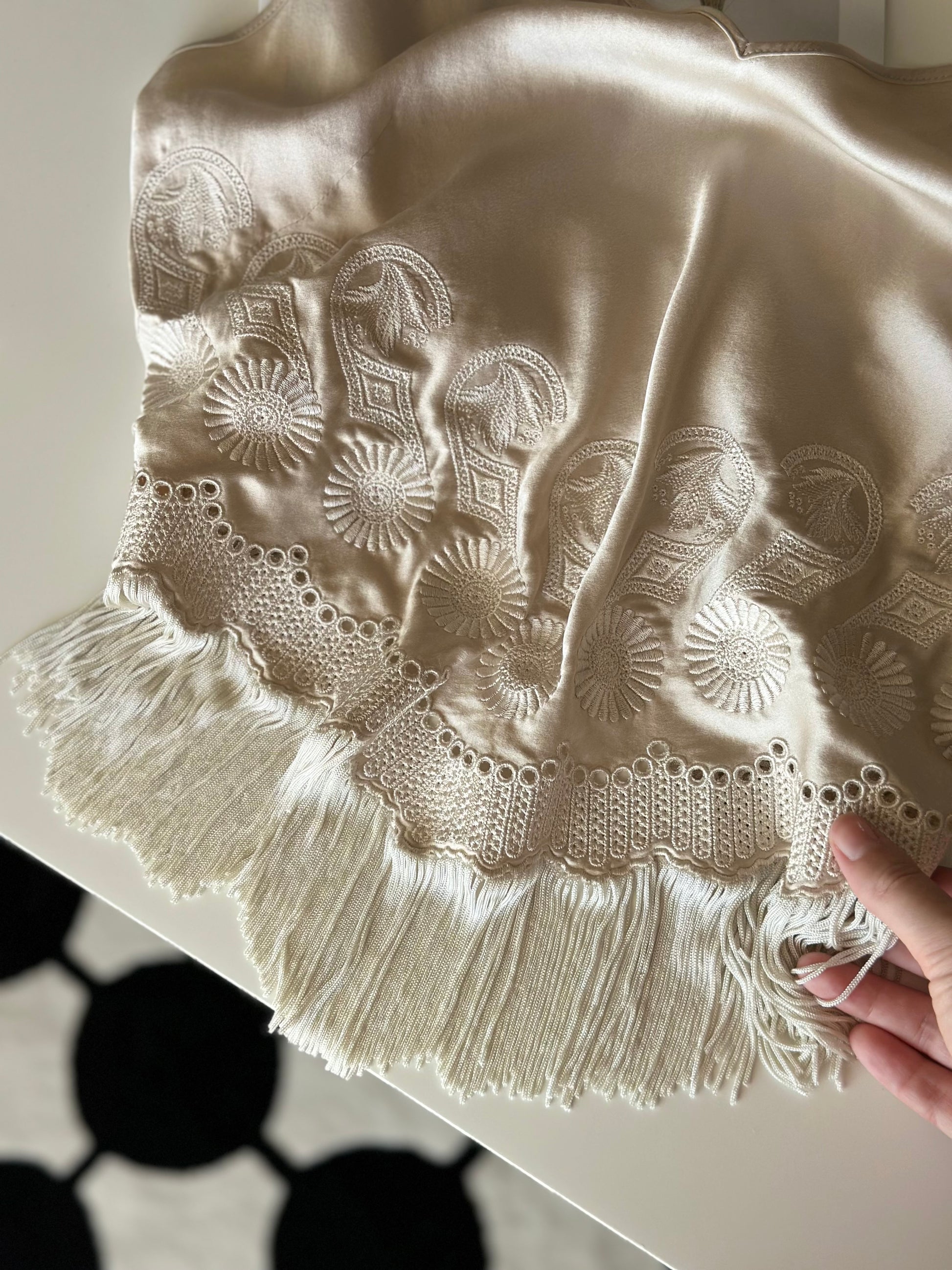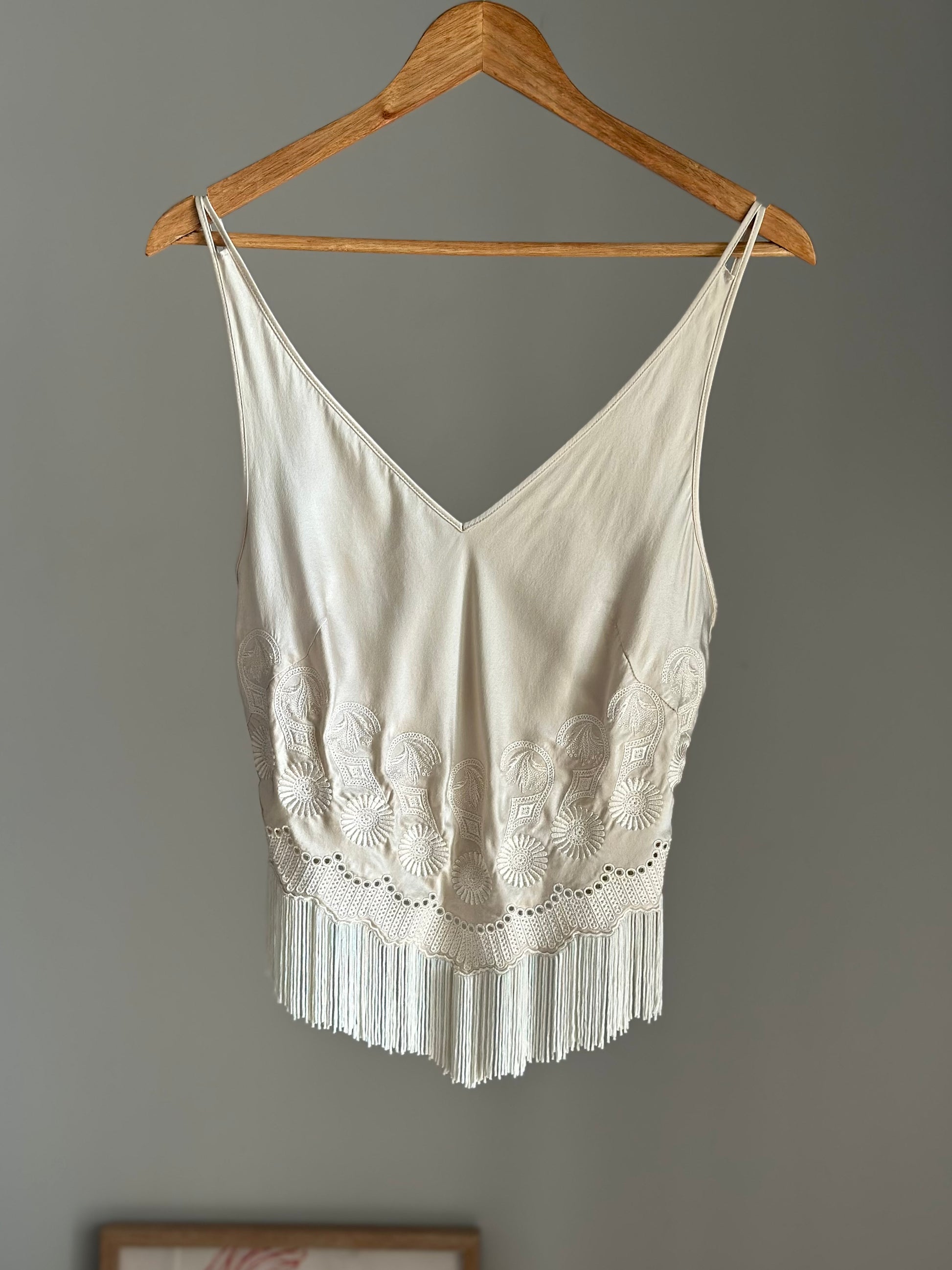 Stunning statement piece from Karen Millen’s Y2K era with open back, this silk camisole is pure luxury. Crafted in a lustrous champagne hue, it features intricate embroidery and delicate details. The dramatic fringe hem adds movement and flair, making it a rare and truly special vintage find.