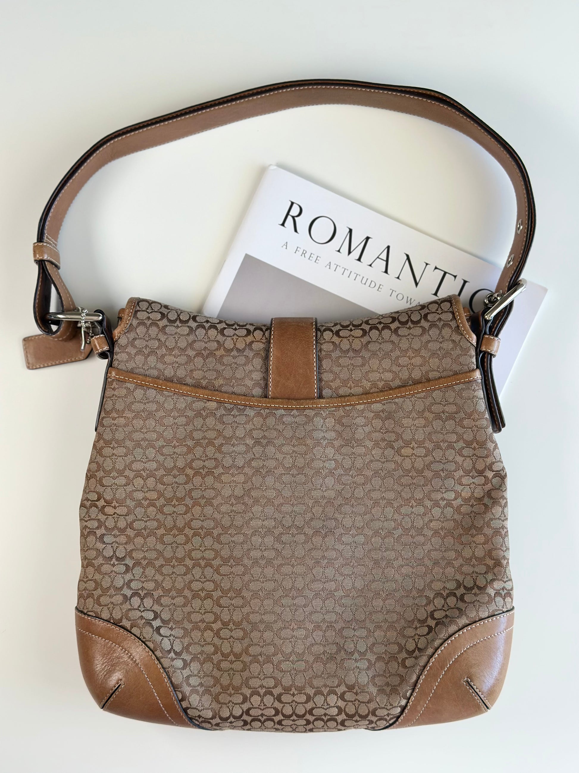 Stunning vintage Coach shoulder bag, featuring the iconic C-monogram canvas with warm tan leather accents. The bag is designed with a convenient flap closure secured by a stylish buckle, a signature Coach hangtag, and a comfortable shoulder adjustable strap. The rich brown interior offers practical organization with a several compartments and timeless design.