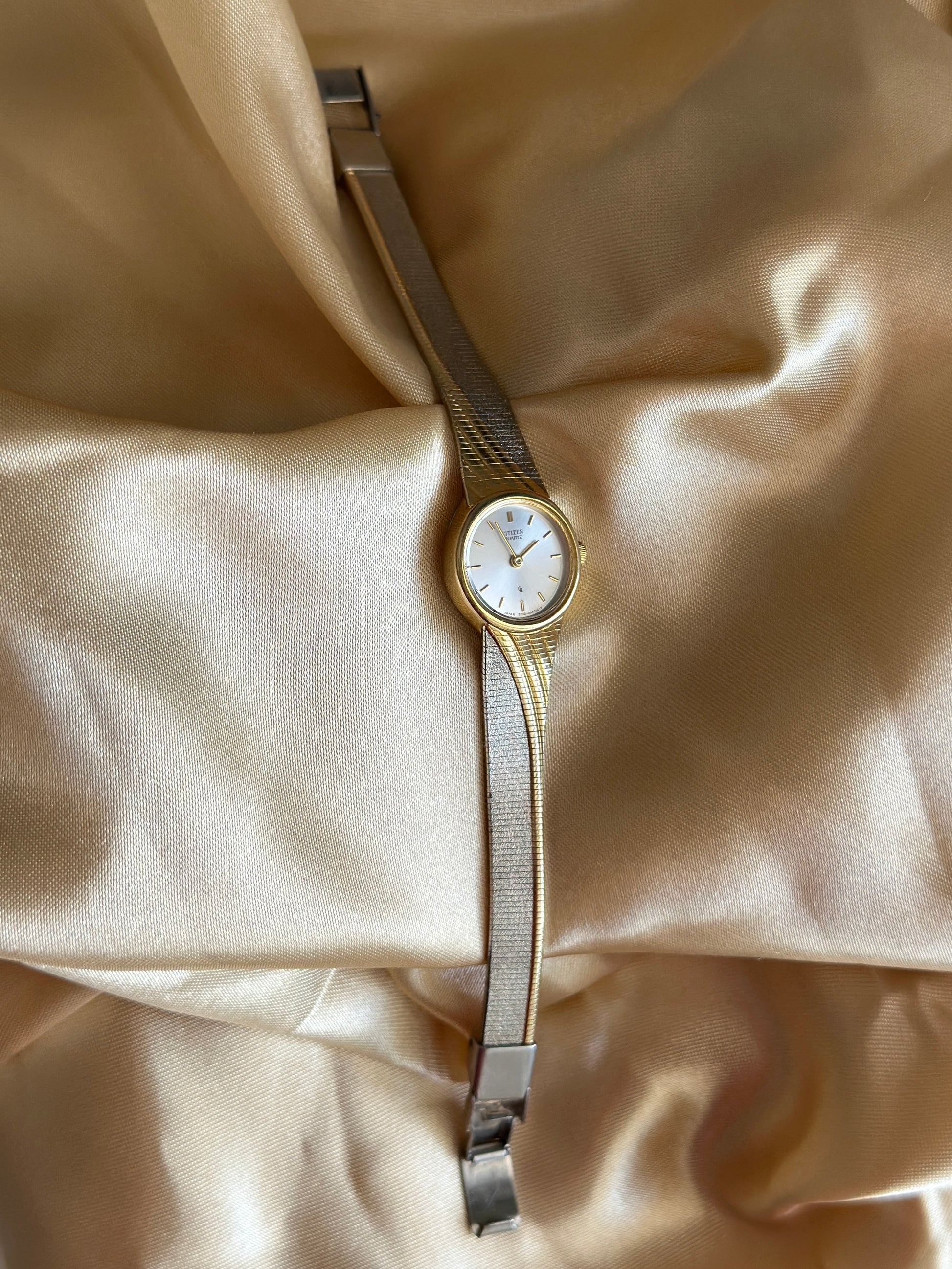 Stunning vintage two-tone watch by Citizen. The gold-tone oval case pairs with a distinctive two-tone bracelet of polished gold-tone and brushed silver-tone links. The clean silver dial features slender gold-tone markers and hands for easy reading. A refined and versatile vintage watch for everyday.