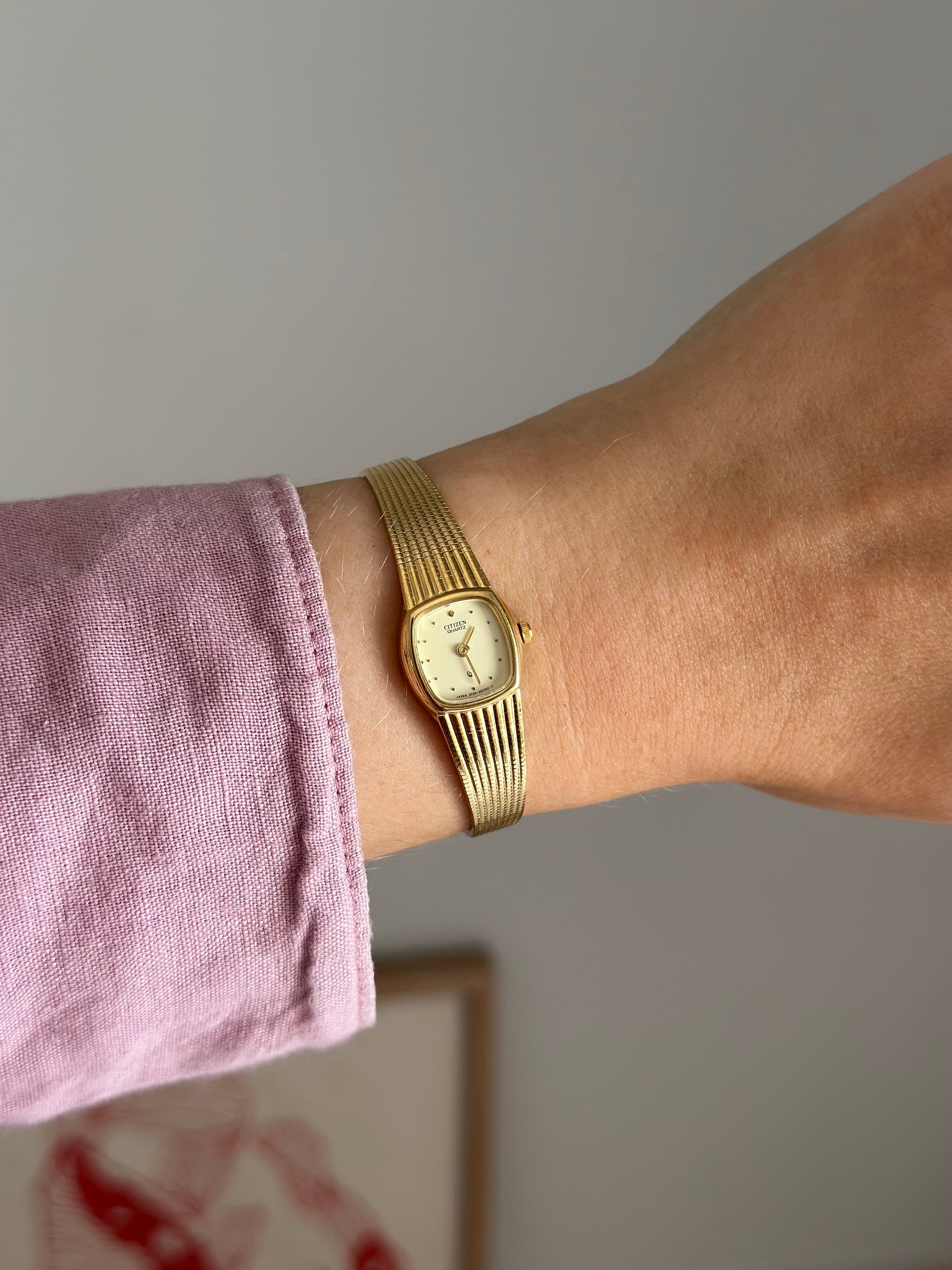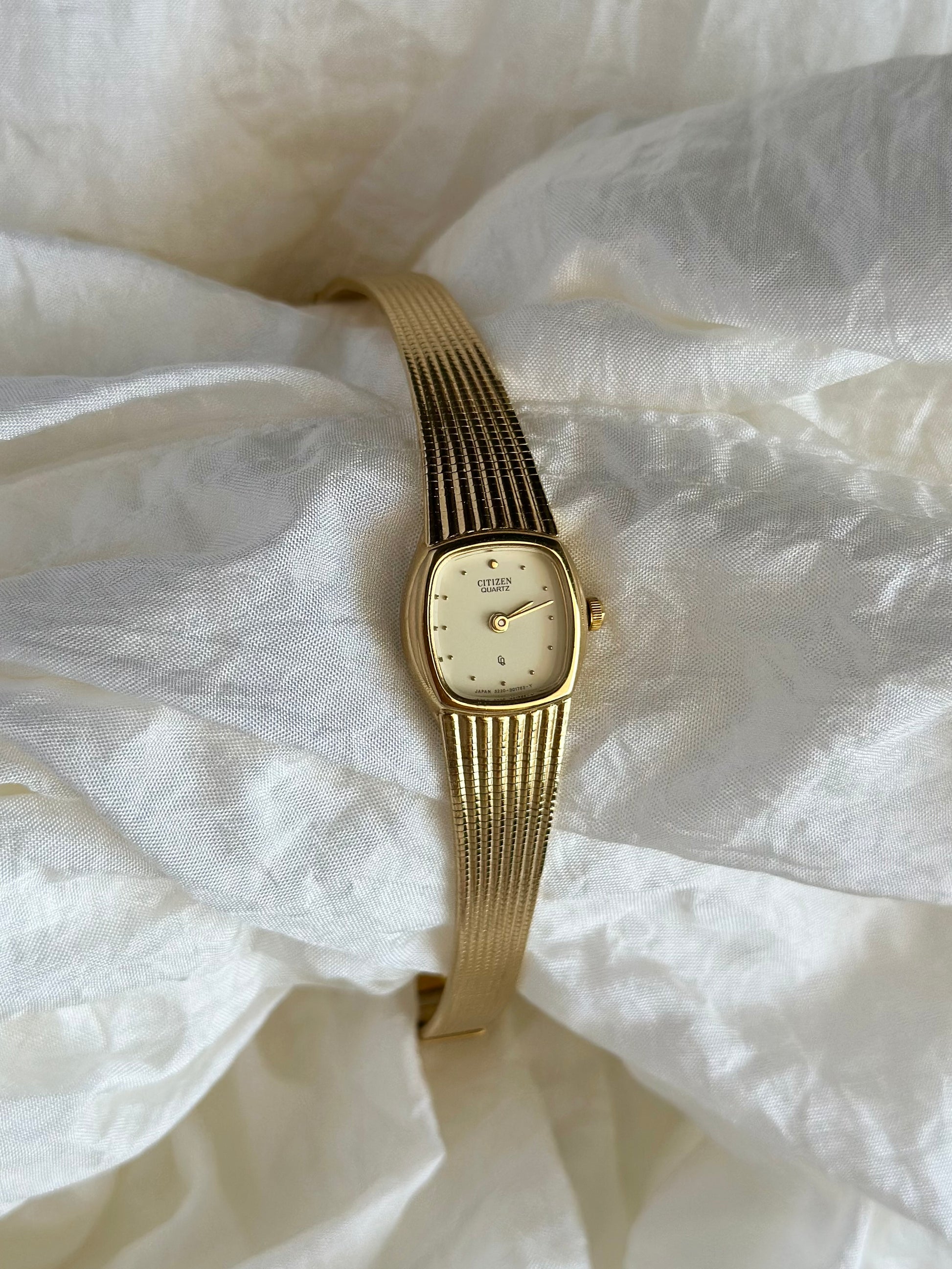 A timeless piece of elegance from Citizen, renowned Japanese watchmakers. This vintage dress watch features a finely textured multi-strand bracelet that flows seamlessly into the gold-tone case. Its clean cream dial adds to the refined, understated charm, making it a perfect example of sophisticated '90s design.
