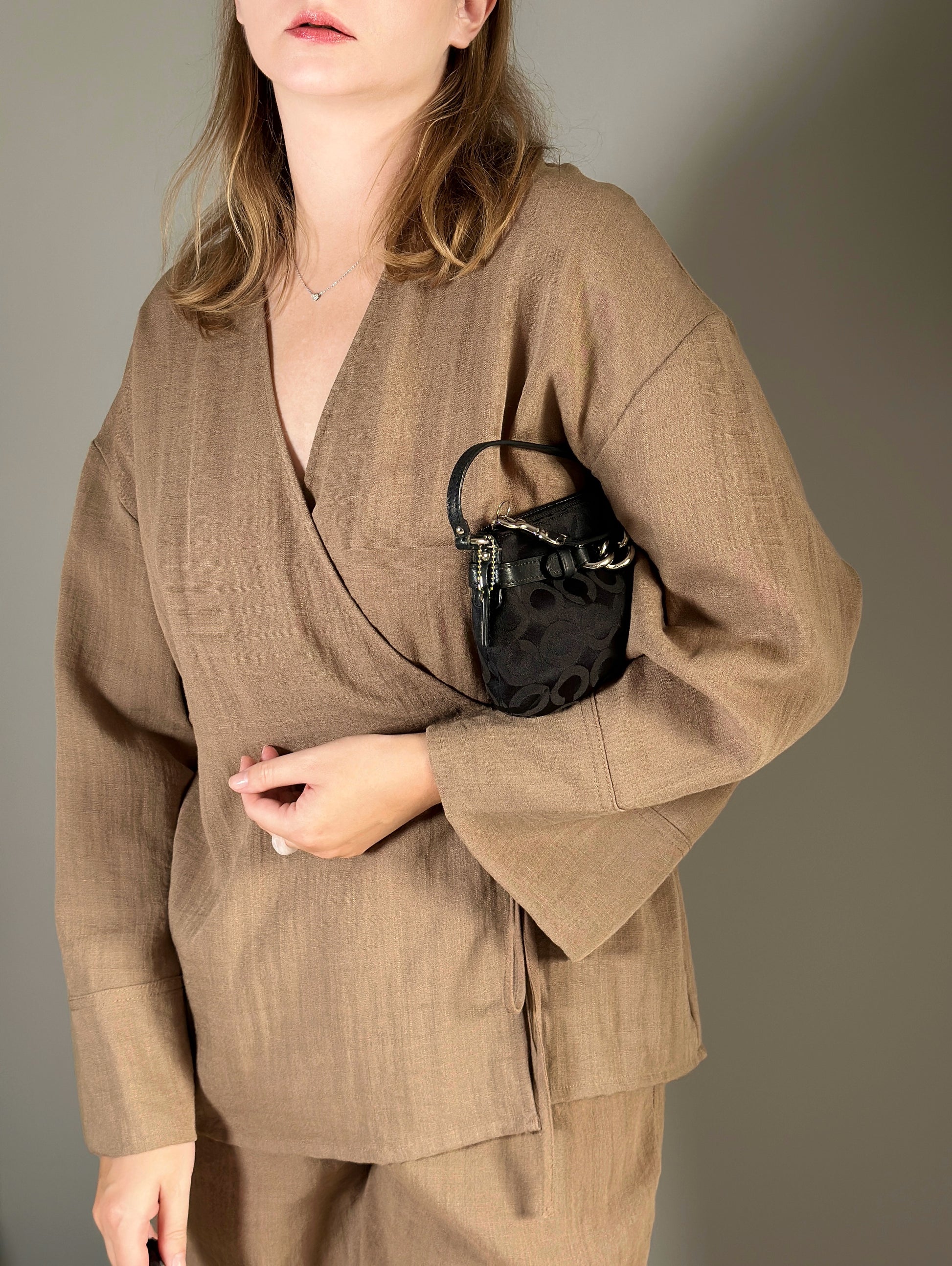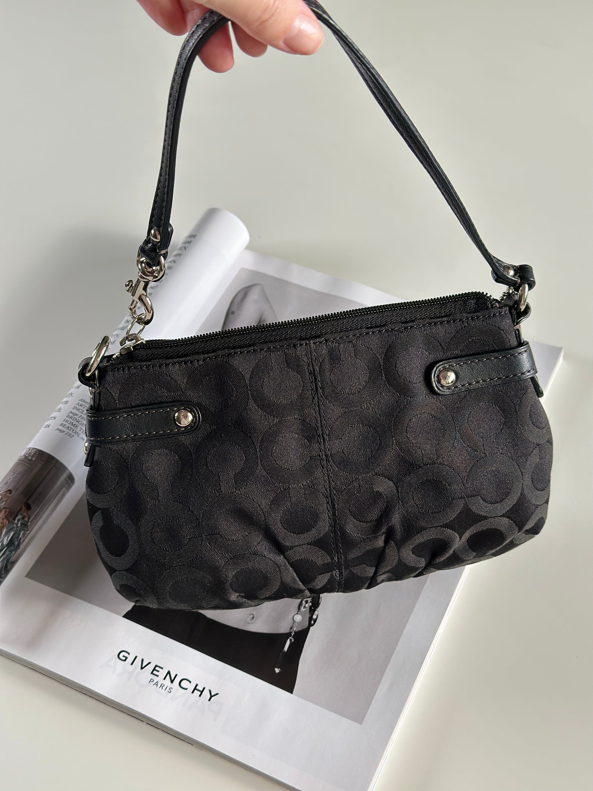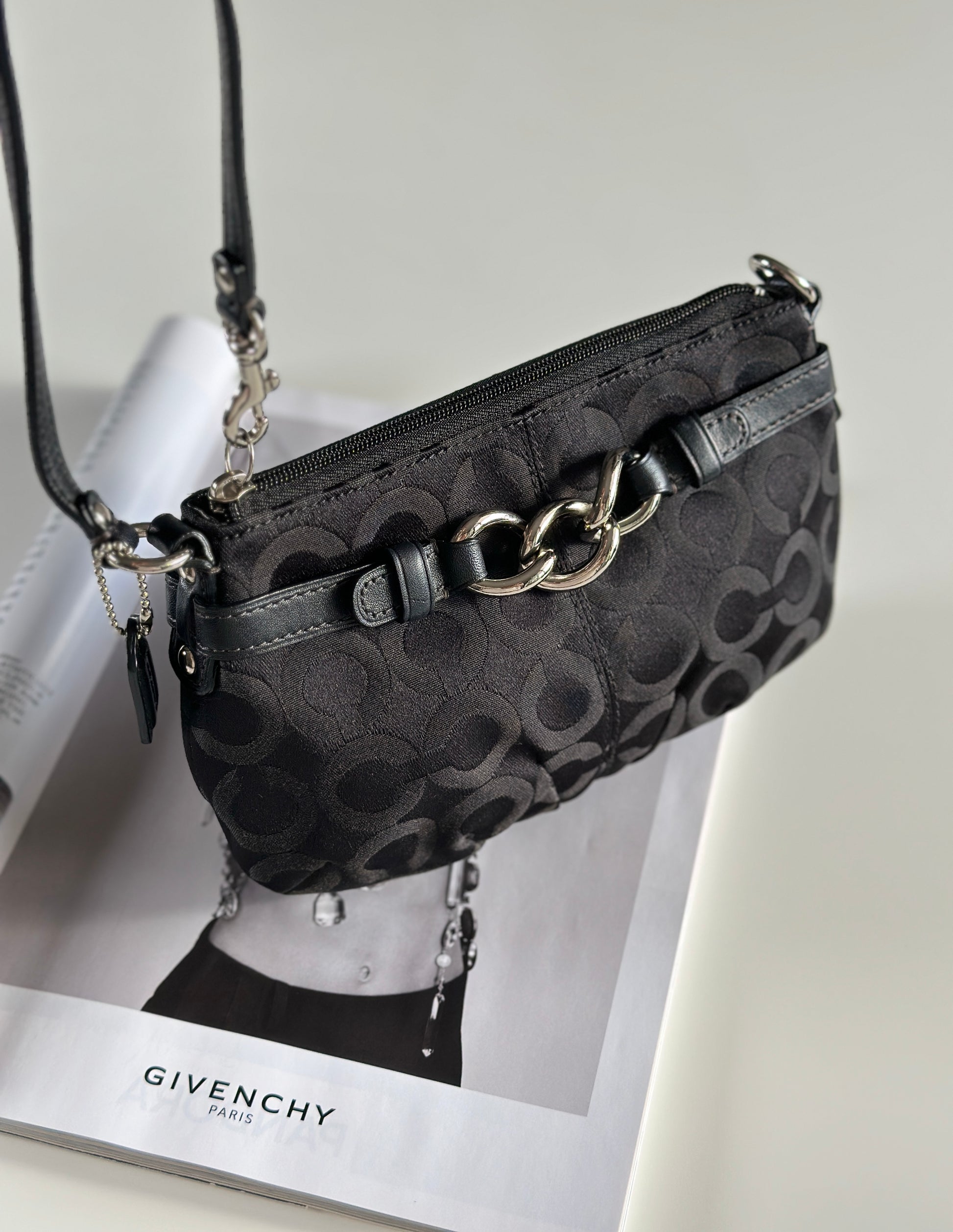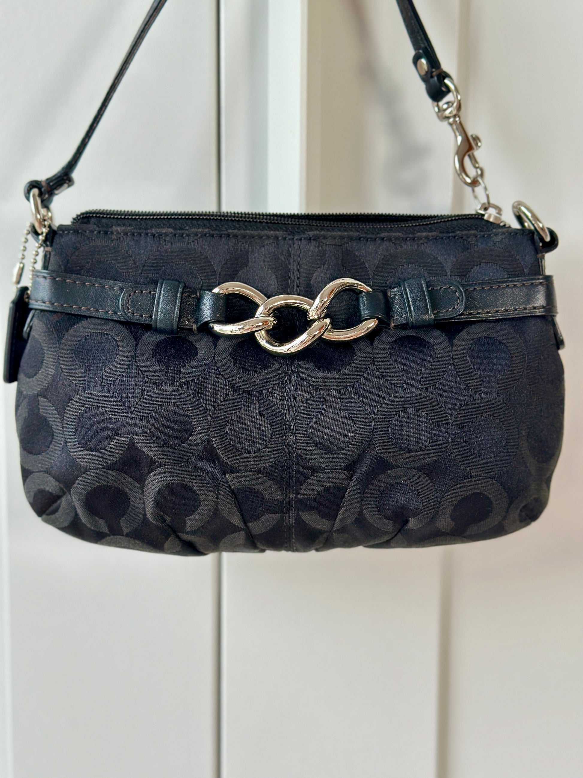 Timeless vintage authentic Coach wristlet bag. Crafted from the brand’s signature black 'C' canvas fabric, paired with black leather trim and contrast stitching. Finished with silver-tone hardware, including the clasp and chain detail on the strap, adds a touch of modern polish. Perfect compact bag for everyday essentials with a touch of Y2K charm.
