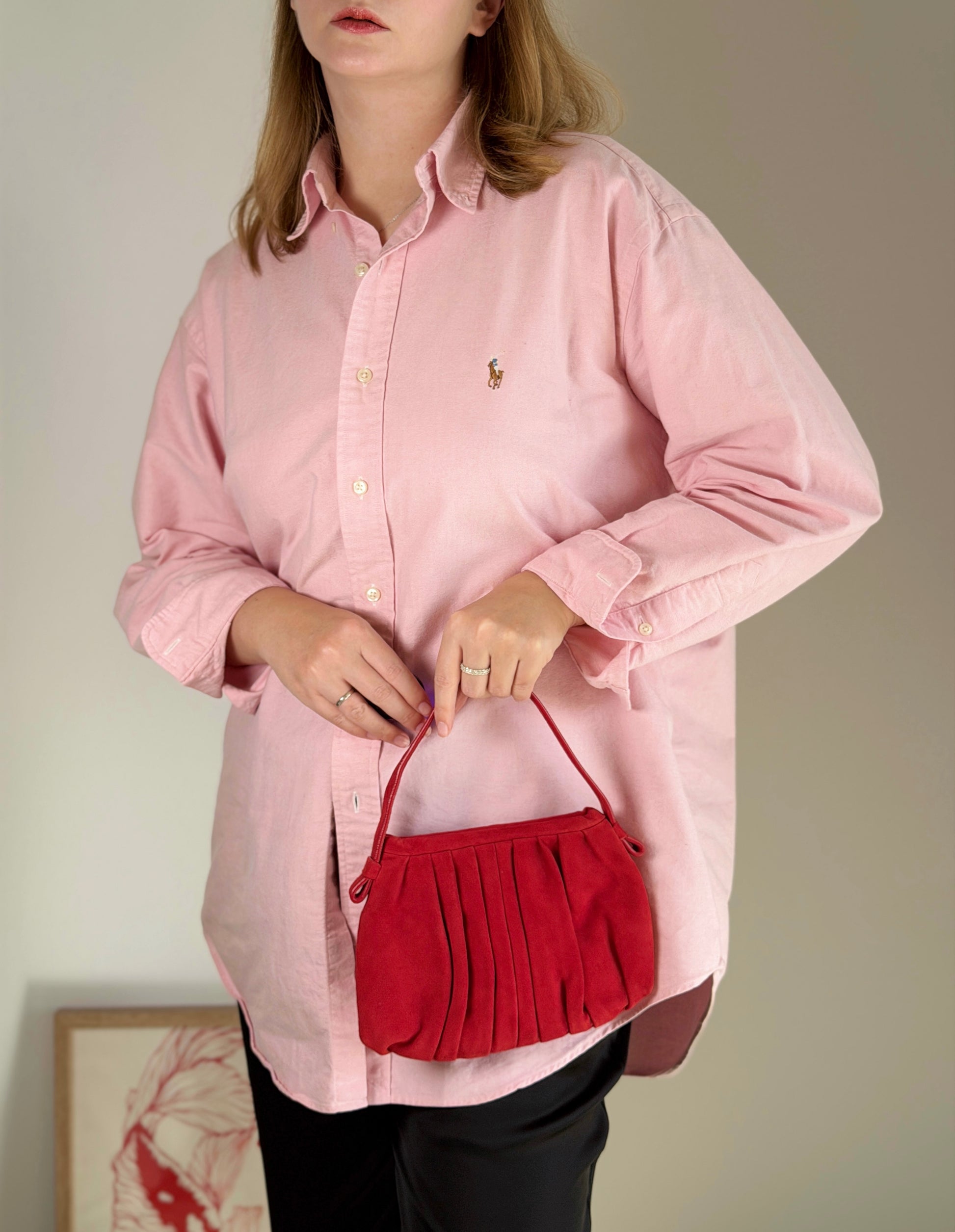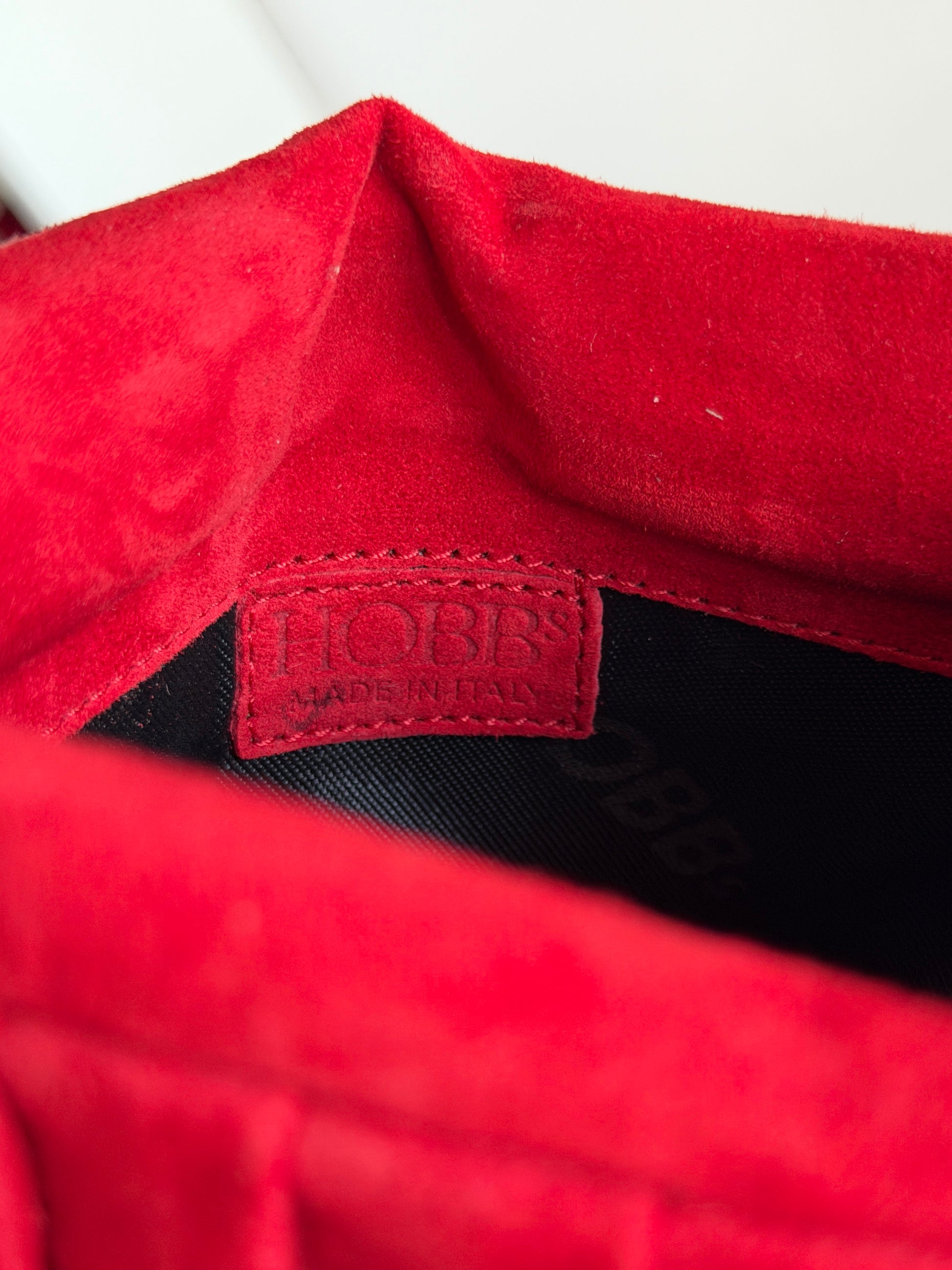 Vintage Hobbs bag crafted from rich red suede with subtle pleated detailing. The curved silhouette and minimalist strap keep it refined, while the vibrant shade adds that confident pop of colour every wardrobe needs.