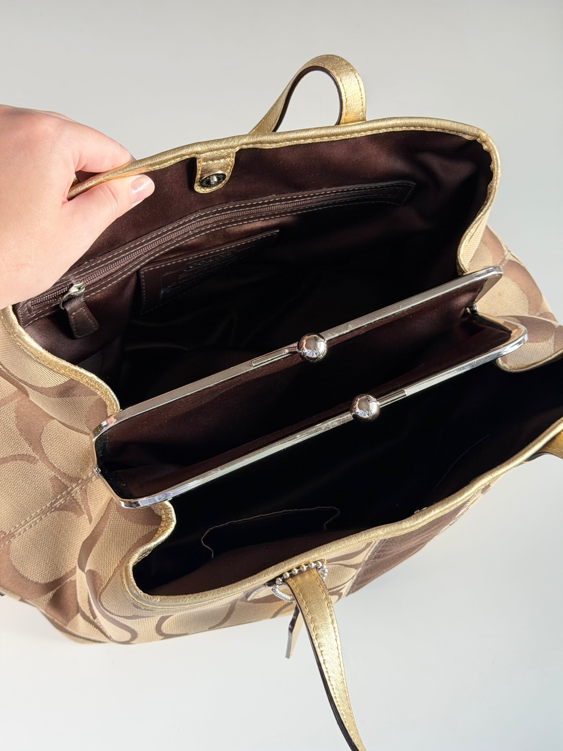 Vintage authentic Coach tote bag featuring the iconic “C” monogram in classic tan and brown tones. Accented with gold leather trim and handles. Designed with a two compartments and chic kiss lock clasp, it opens to a spacious interior lined in rich brown satin. Perfect spacious bag for everyday with a touch of Y2K charm.
