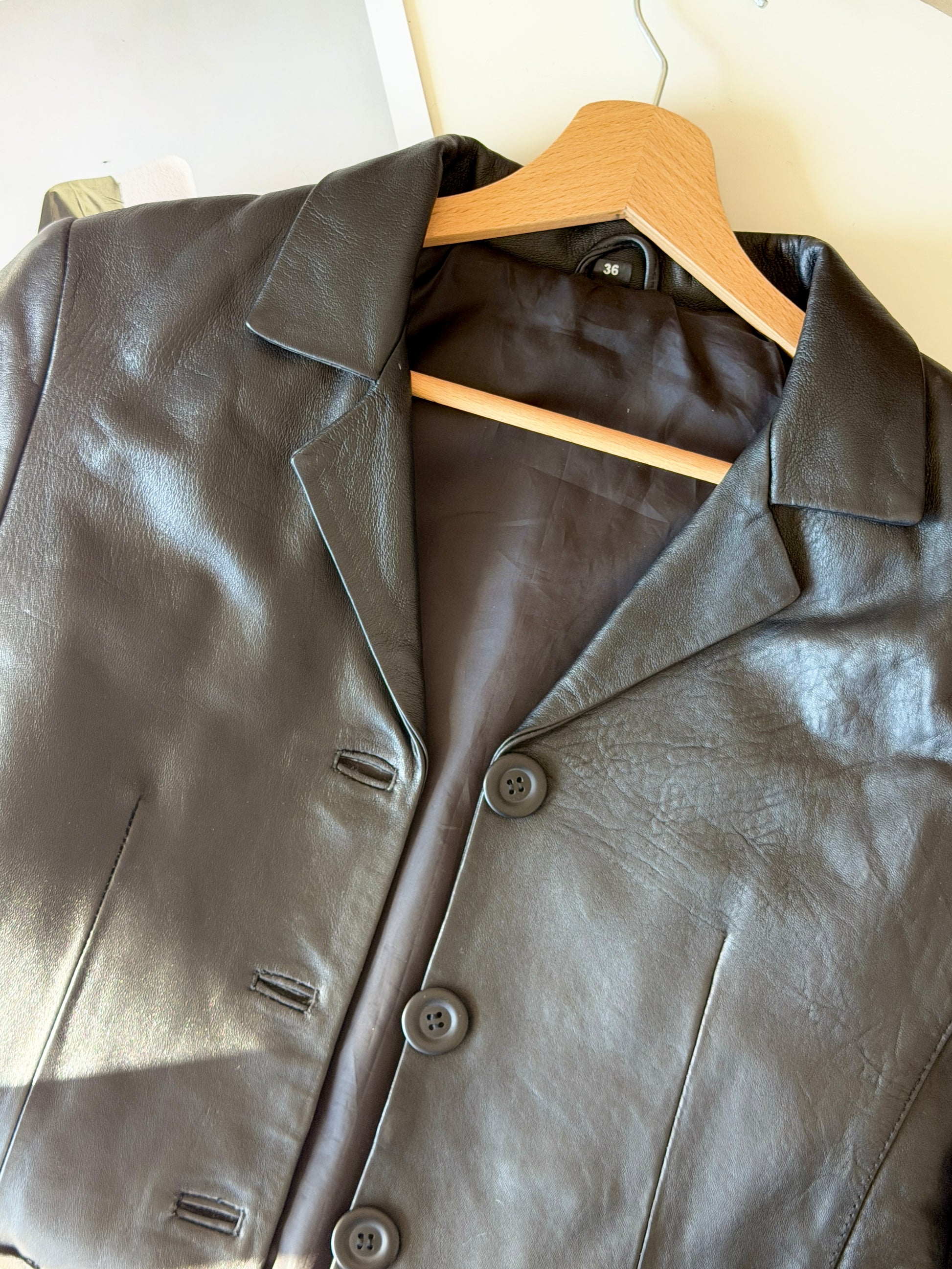 Vintage black leather blazer crafted from soft nappa leather. Structured silhouette, notched lapel and clean button-front design create a refined yet powerful look.