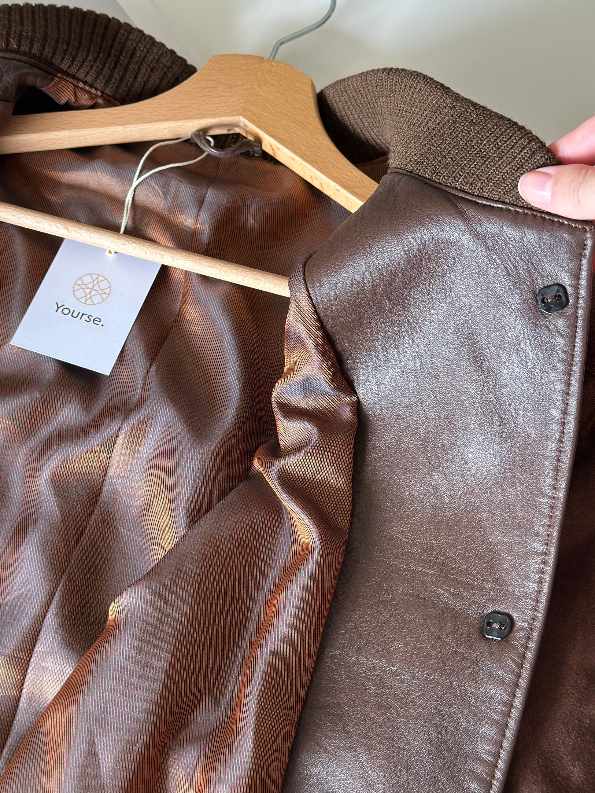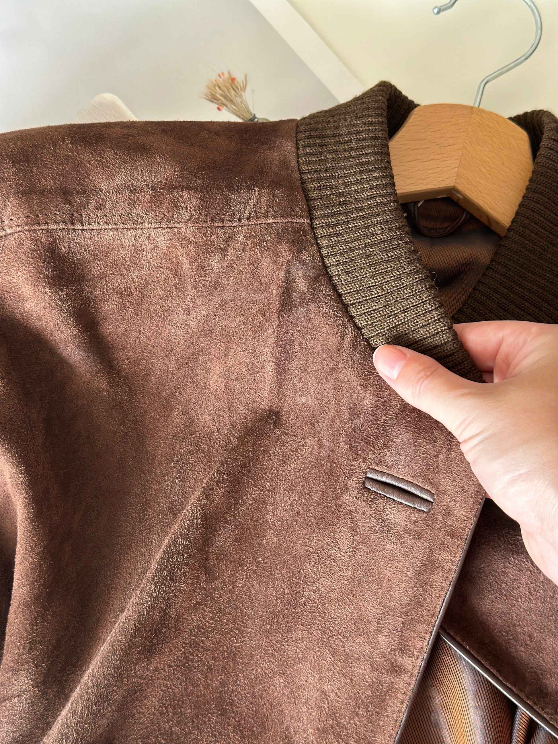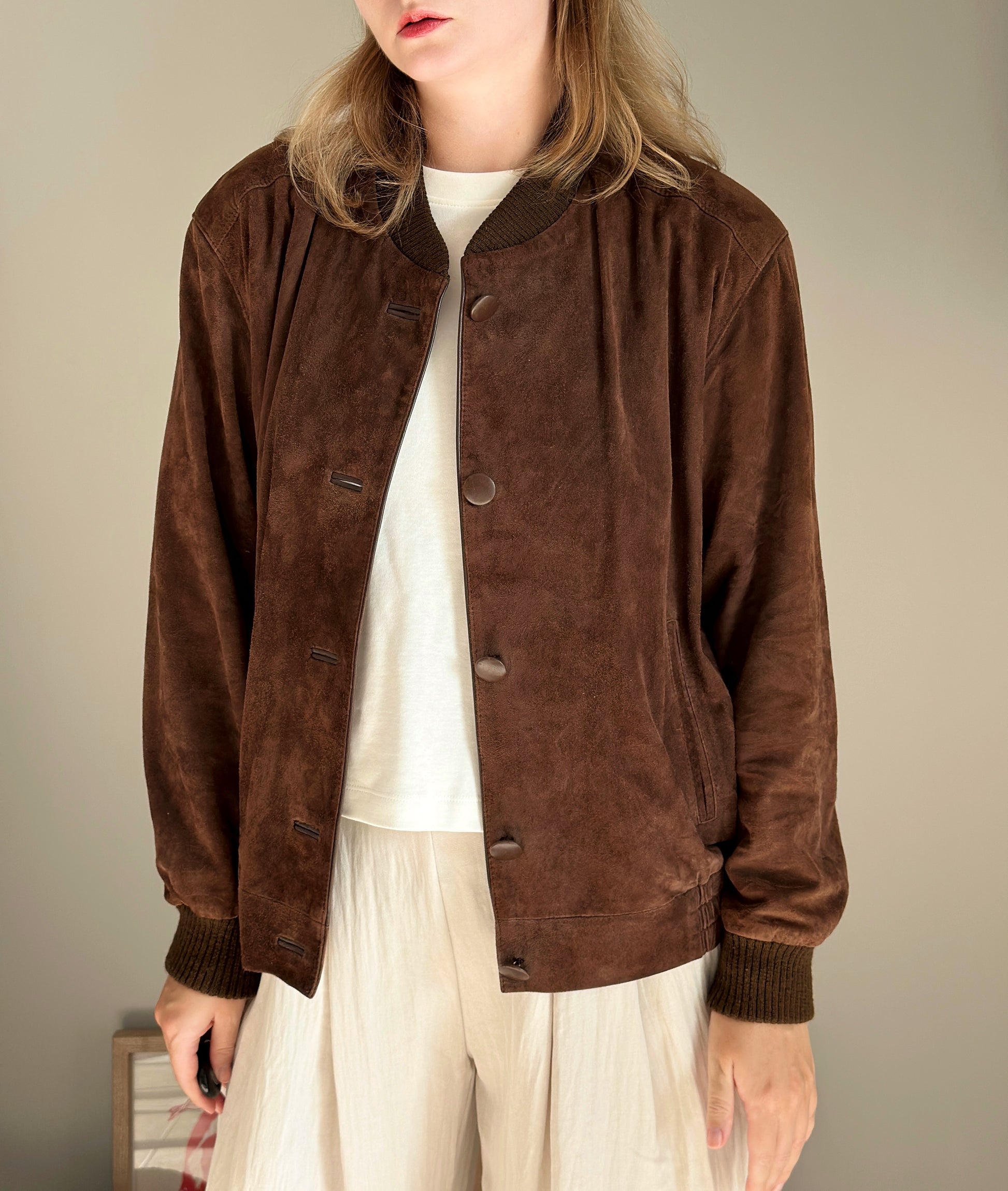 This rich brown suede bomber jacket is a timeless vintage piece, offering a luxurious and relaxed aesthetic. Crafted from soft suede, it features a classic ribbed collar, cuffs, and hem for a comfortable fit. The jacket has a button-up front with matching brown leather buttons. The lustrous brown satin lining adds a touch of premium comfort. Comes with small shoulder pads inside.