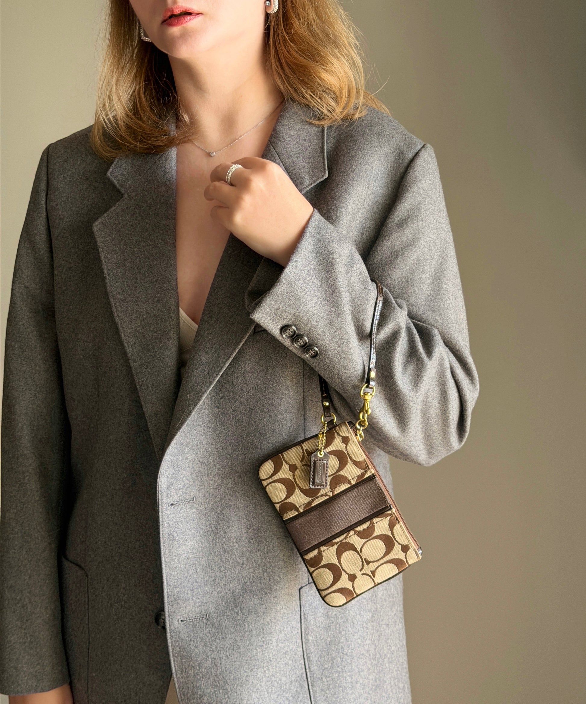 Vintage Coach wristlet/wallet is crafted in the iconic brown and beige jacquard. Rich dark brown leather trim and a ribbon stripe elevate the design. Finished with the original leather hangtag, it’s a perfect piece of early 2000s nostalgia.