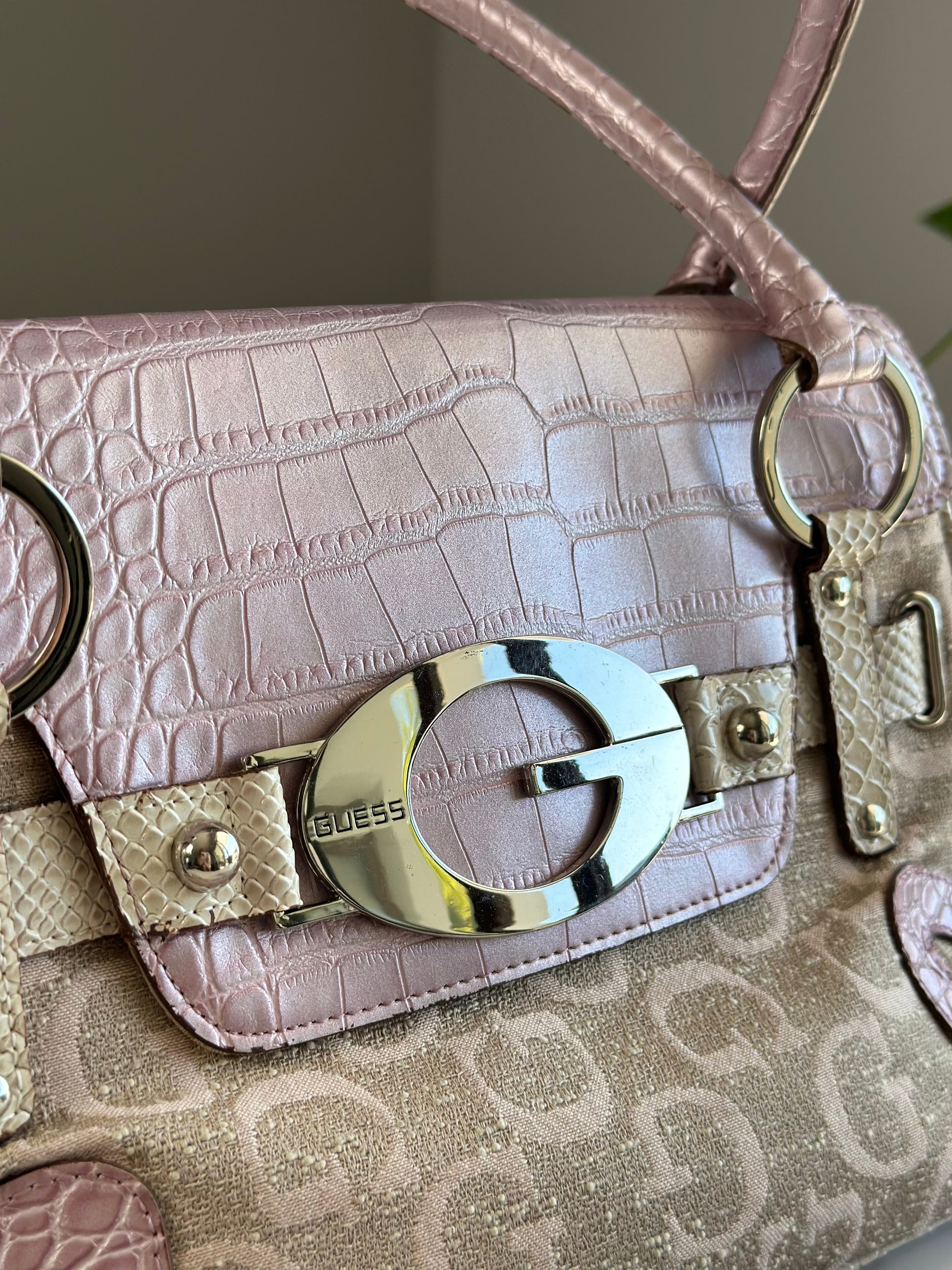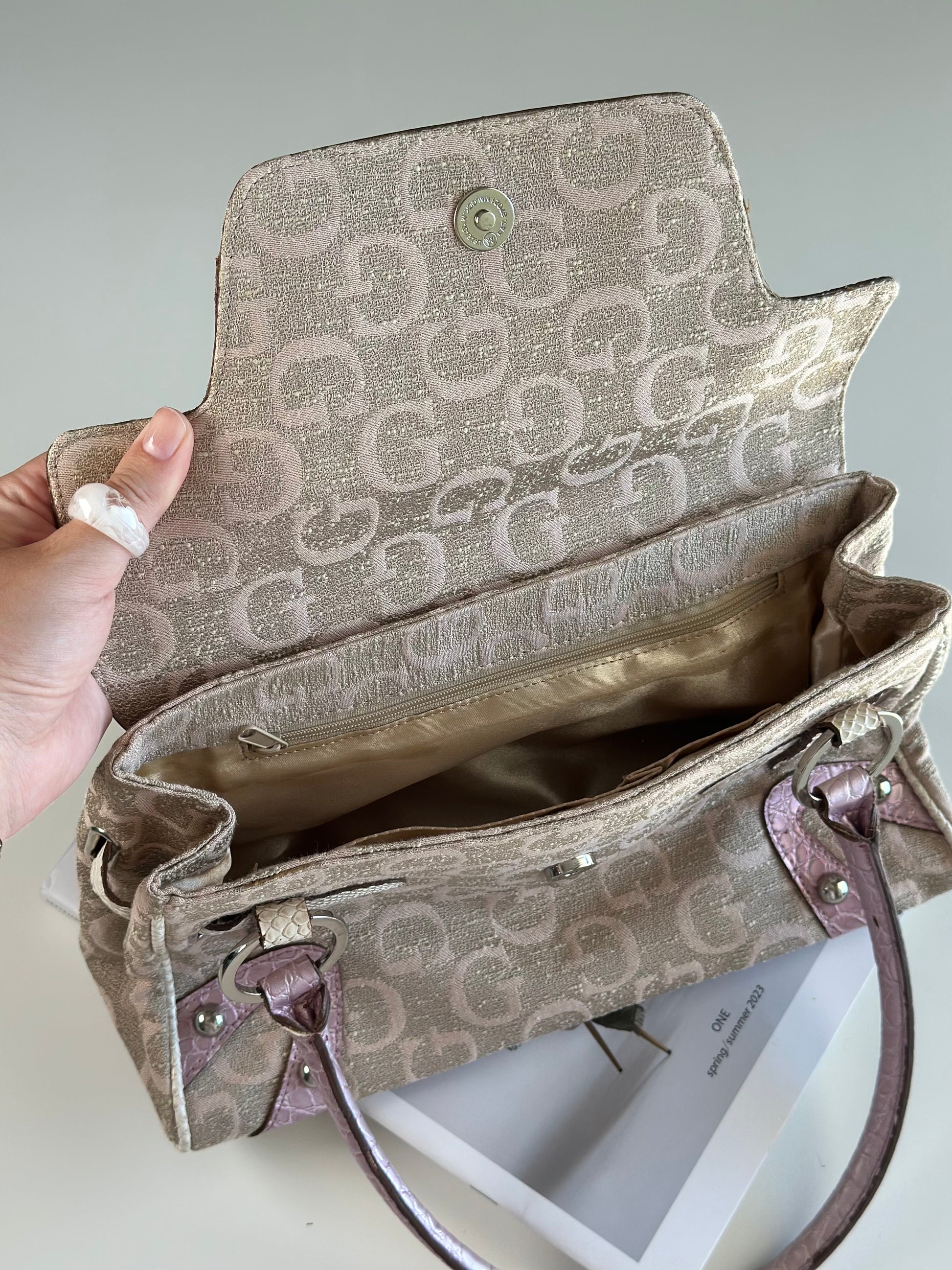 Vintage Guess handbag with playful Y2K charm. Crafted from textured monogram canvas in champagne and pink, it’s accented with pastel pink faux leather and subtle snakeskin details. Polished silver-tone "G" logo hardware adds glamour, while the structured silhouette, top handles, and interior pockets keep it practical and stylish.