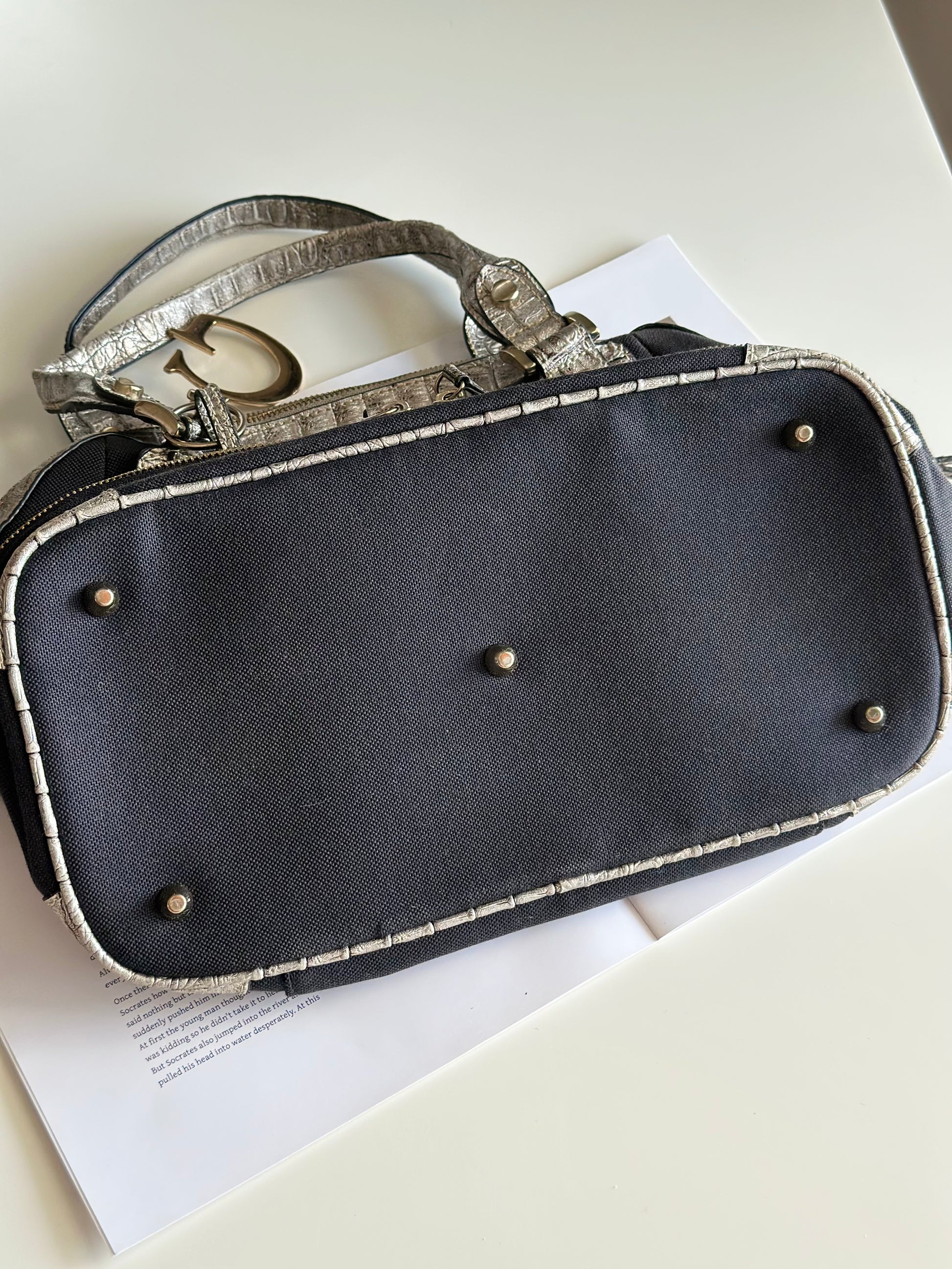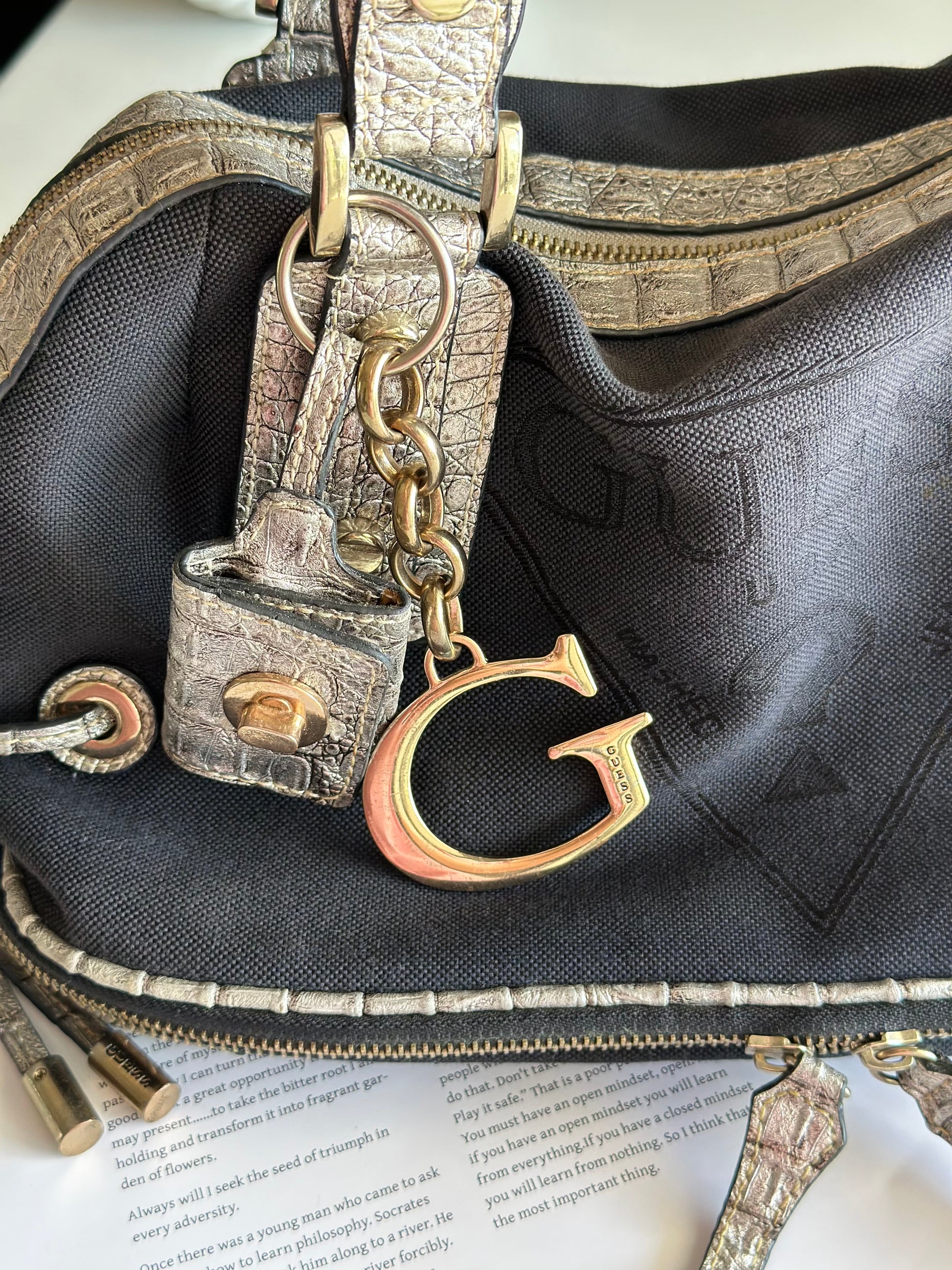 A true Y2K icon, this vintage Guess satchel exudes bold glamour. The navy blue tonal logo jacquard is accented with metallic croc-embossed faux leather trim and chunky gold-tone hardware. Original logo charms, multiple zippers, and a playful leopard-print lining complete this perfect piece of early 2000s fashion. Can be used as a travel bag.