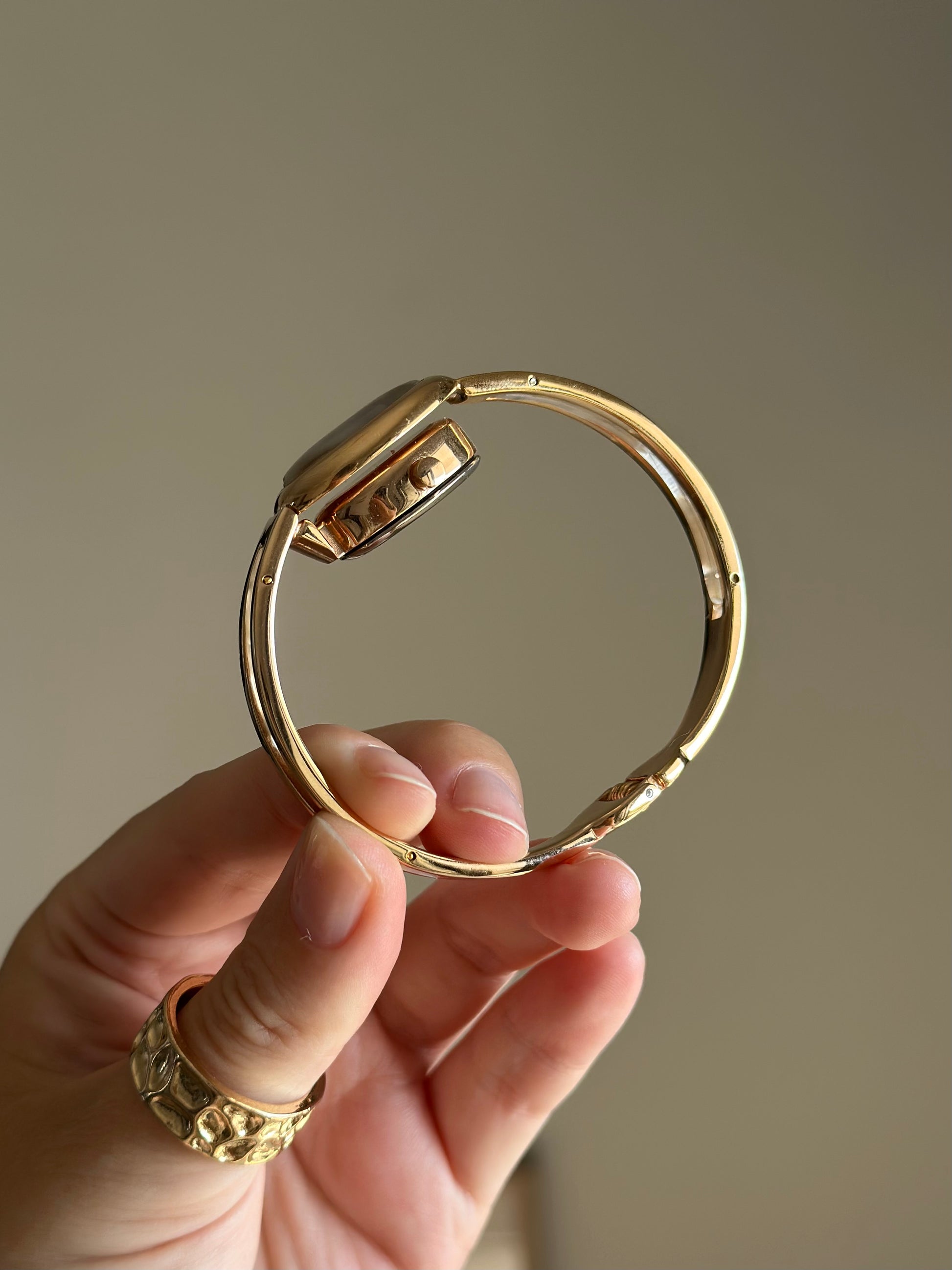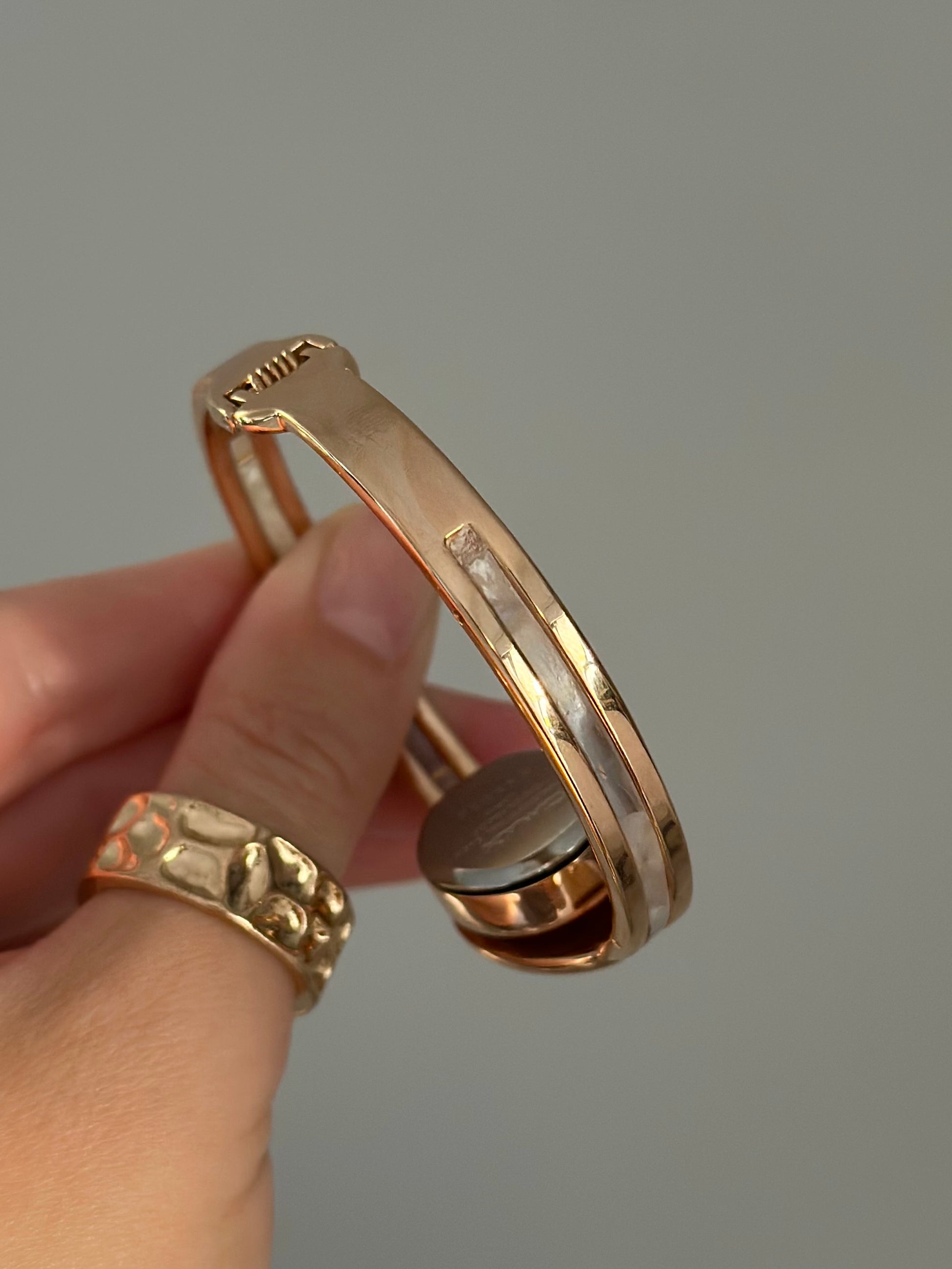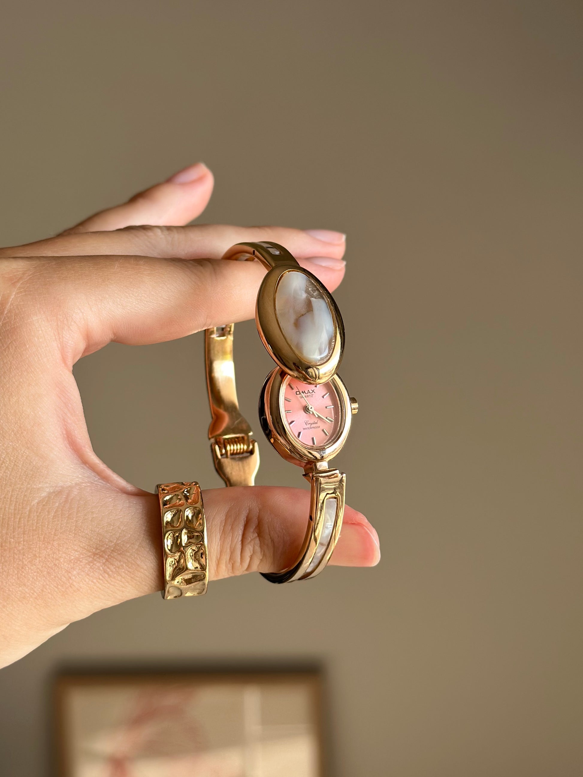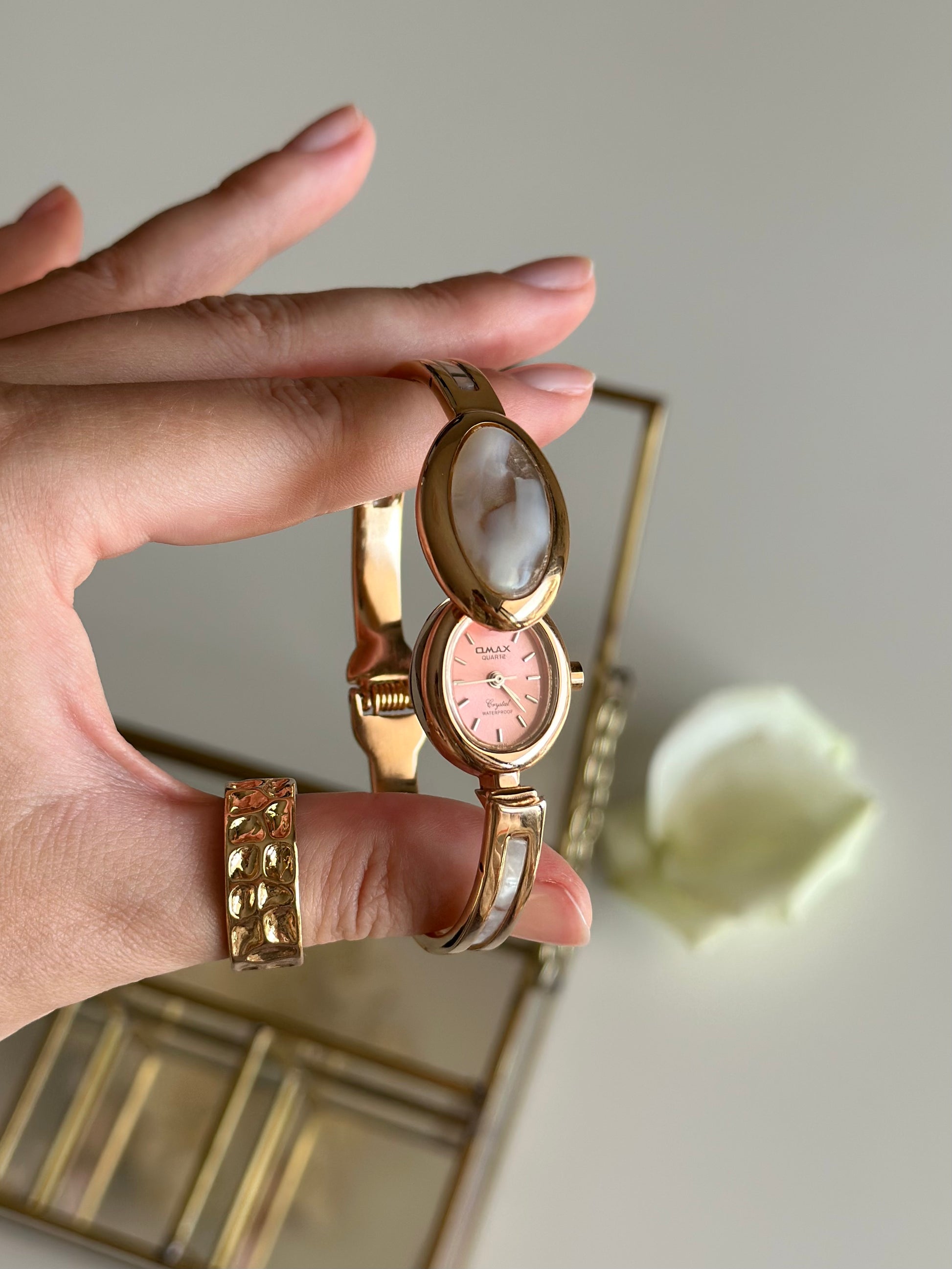 This vintage Omax watch is a striking statement piece, featuring a hidden delicate pink dial (2000s). The rose gold-tone bracelet is adorned with intricate inlaid lucite details, blending the elegance of fine jewelry with the functionality of a timepiece. A perfect accessory for adding a touch of vintage glamour.