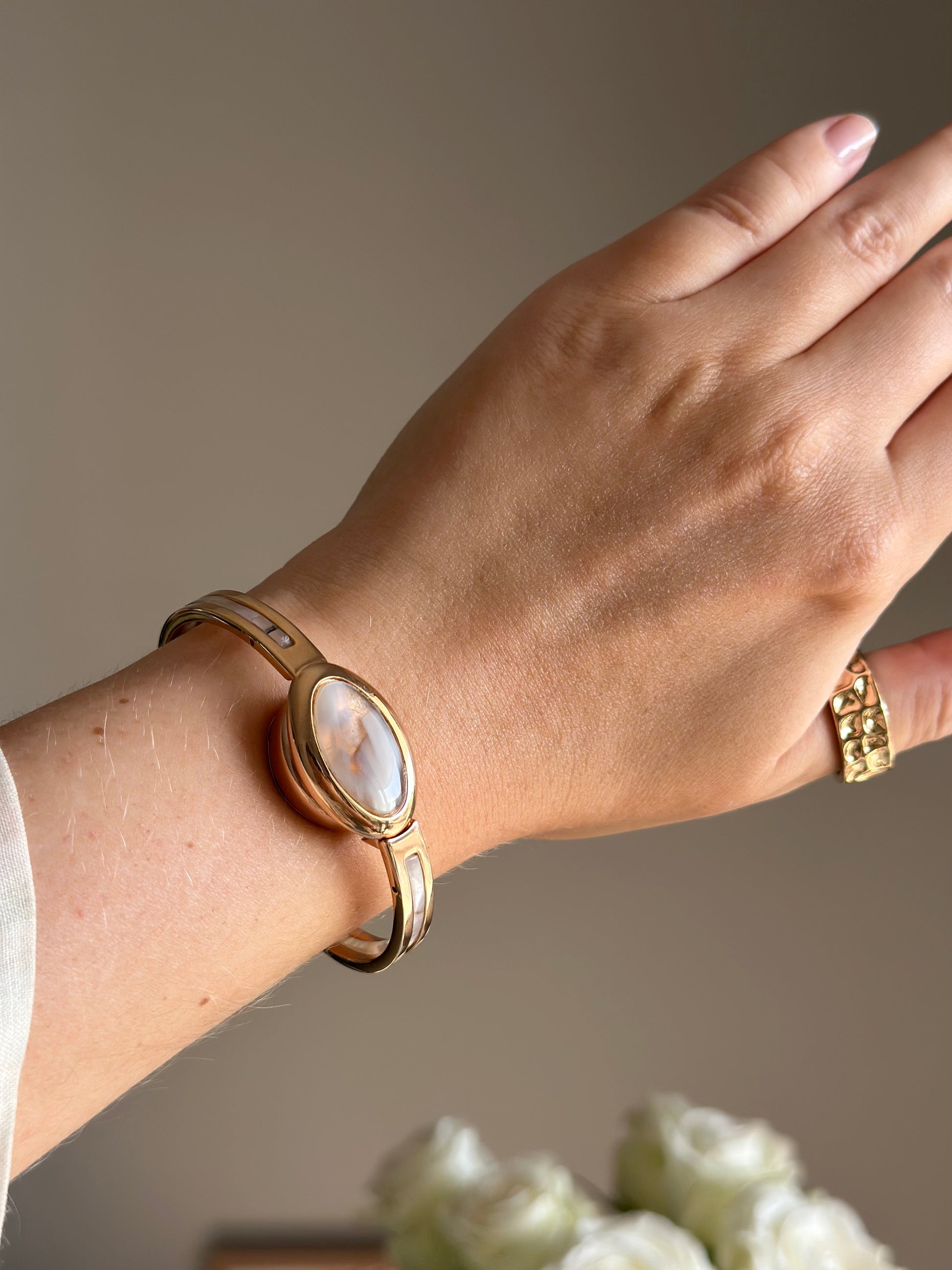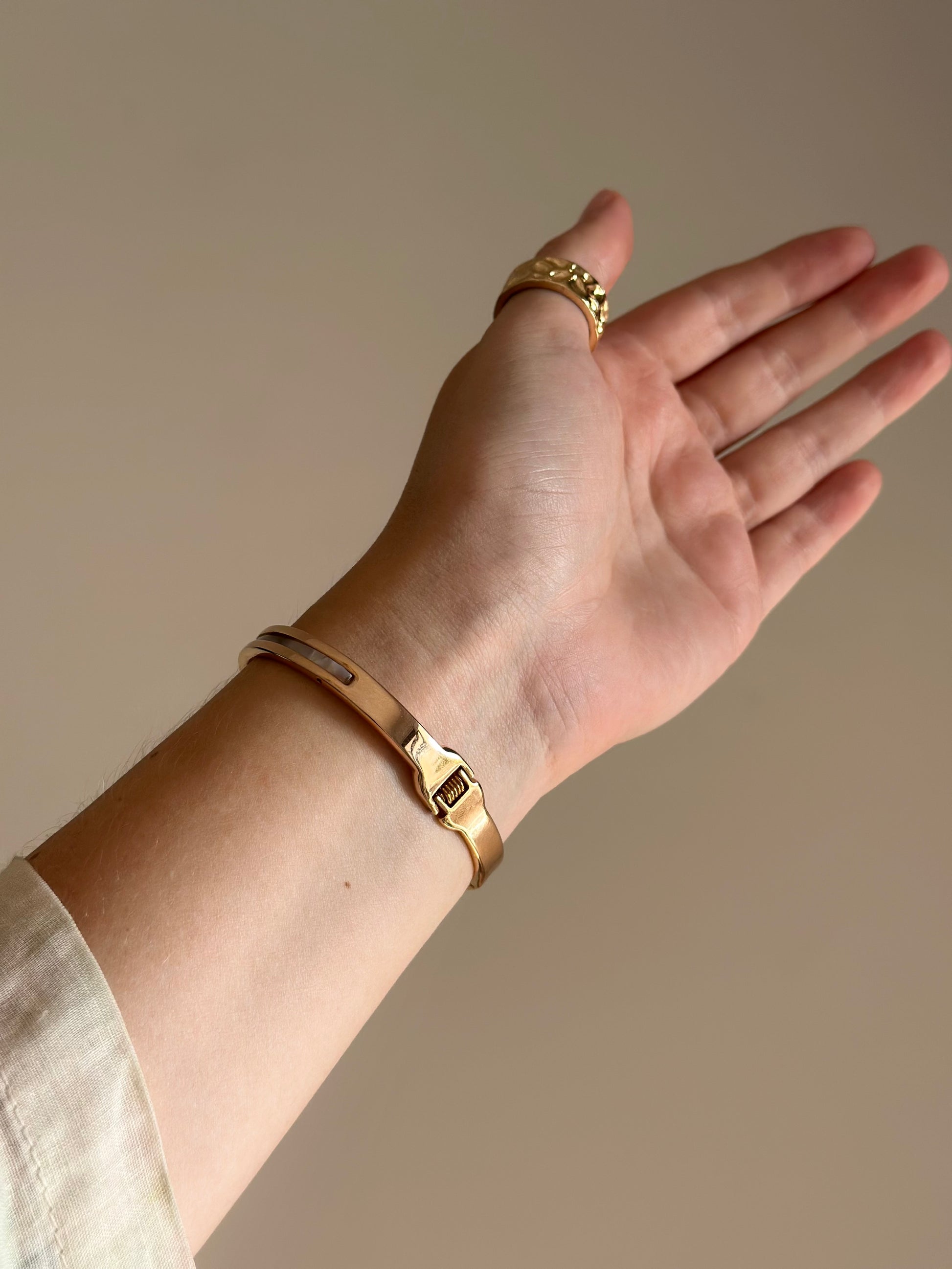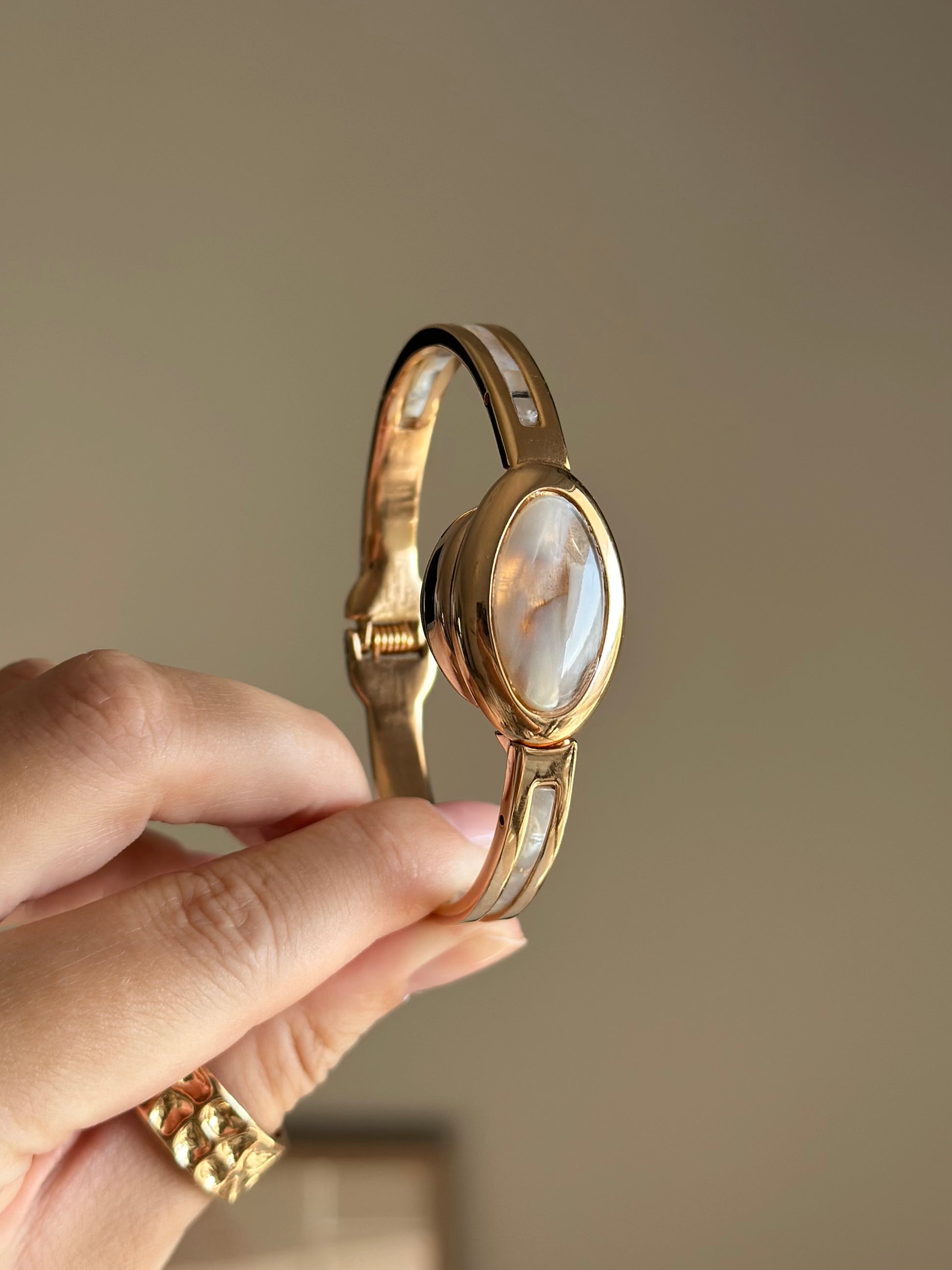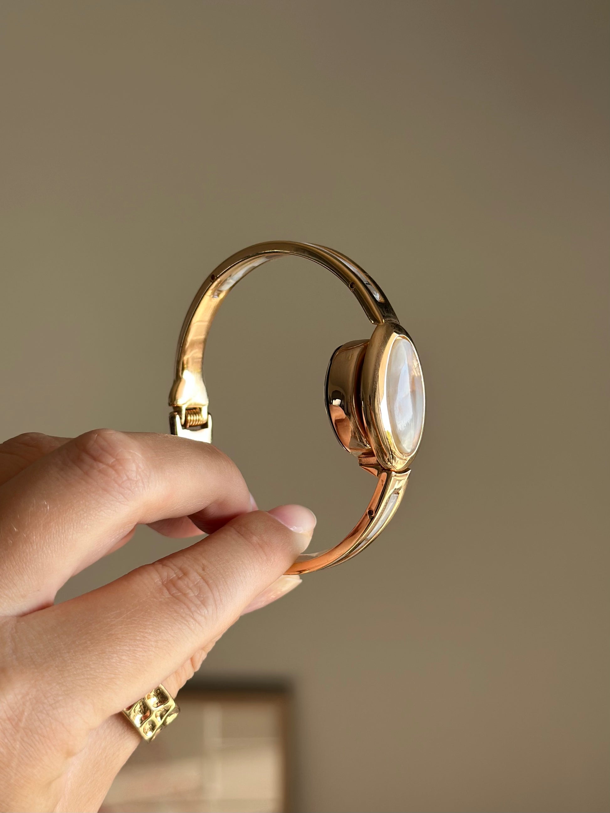 This vintage Omax watch is a striking statement piece, featuring a hidden delicate pink dial (2000s). The rose gold-tone bracelet is adorned with intricate inlaid lucite details, blending the elegance of fine jewelry with the functionality of a timepiece. A perfect accessory for adding a touch of vintage glamour.